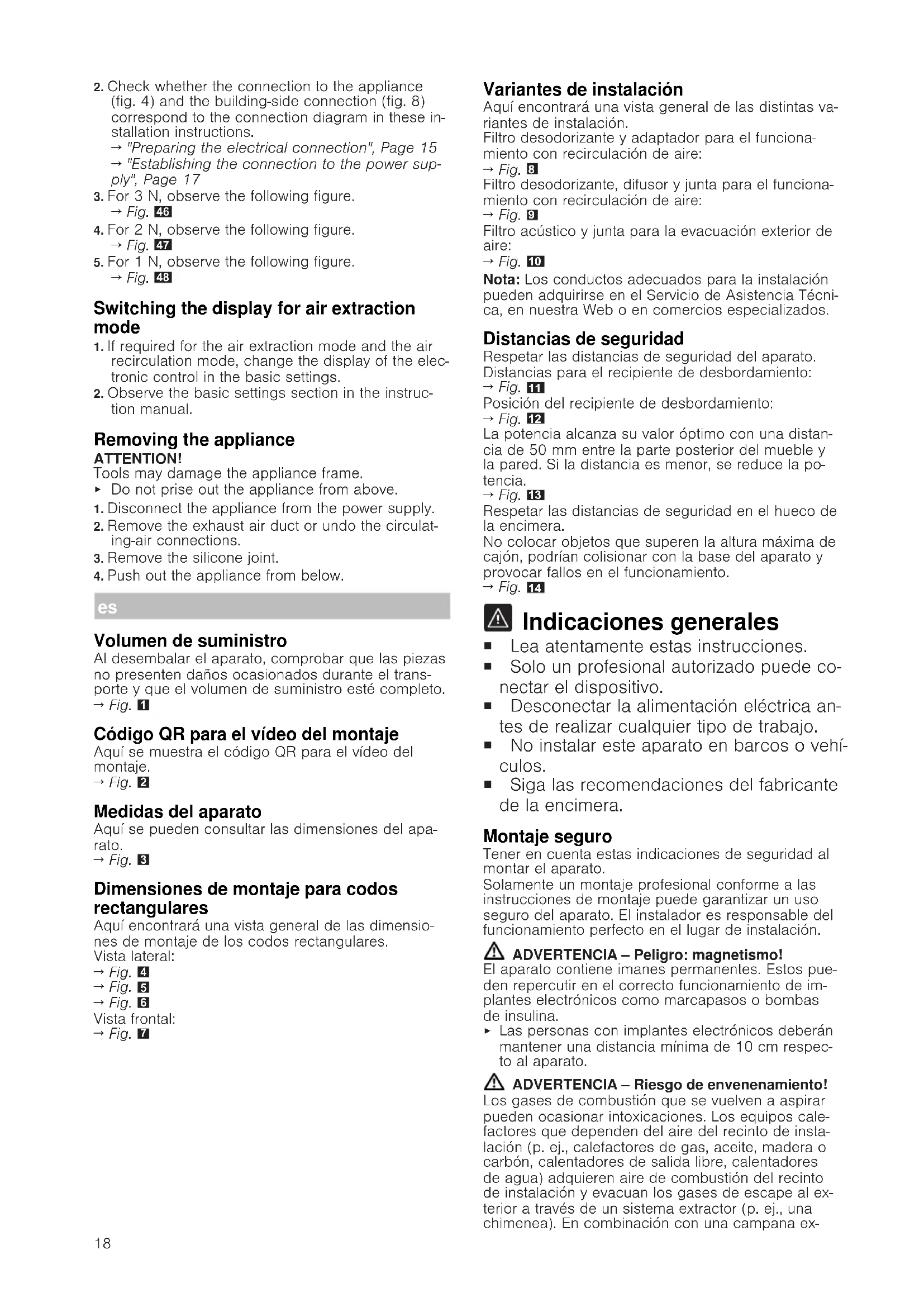Indicaciones generales ¡ Lea atentamente estas instrucciones. ¡ Solo un profesional autorizado puede co- nectar el dispositivo. ¡ Desconectar la alimentación eléctrica an- tes de realizar cualquier tipo de trabajo. ¡ No instalar este aparato en barcos o vehí- culos. ¡ Siga las recomendaciones del fabricante de la encimera. Montaje seguro Tener en cuenta estas indicaciones de seguridad al montar el aparato. Solamente un montaje profesional conforme a las instrucciones de montaje puede garantizar un uso seguro del aparato. El instalador es responsable del funcionamiento perfecto en el lugar de instalación. ADVERTENCIA‒Peligro: magnetismo! El aparato contiene imanes permanentes. Estos pue- den repercutir en el correcto funcionamiento de im- plantes electrónicos como marcapasos o bombas de insulina.
