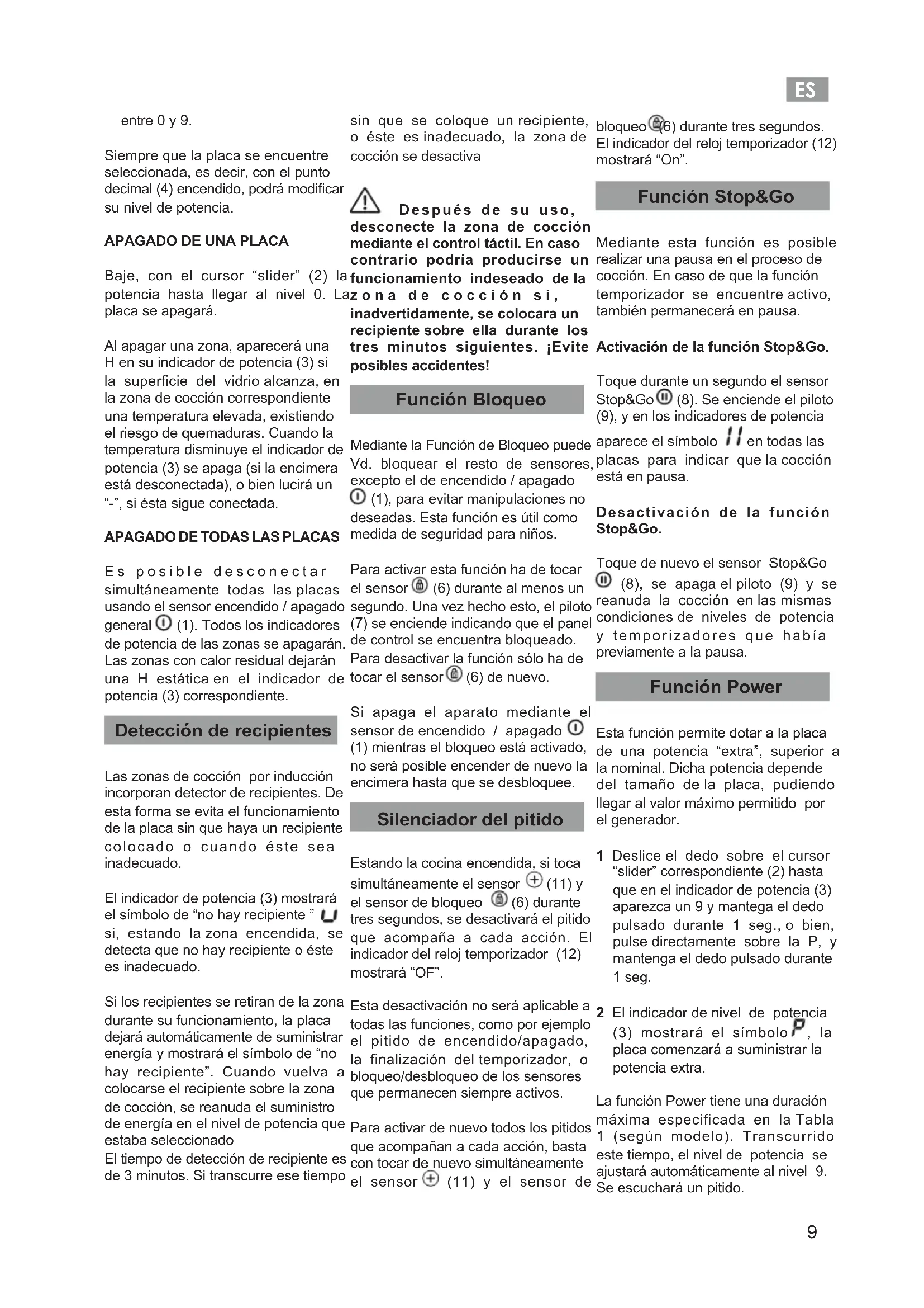 Es posible desconectar simultáneamente todas las placas usando el sensor encendido / apagado general (1). Todos los indicadores de potencia de las zonas se apagarán. Las zonas con calor residual dejarán una H estática en el indicador de potencia (3) correspondiente. Detección de recipientes Las zonas de cocción por inducción incorporan detector de recipientes. De esta forma se evita el funcionamiento de la placa sin que haya un recipiente colocado o cuando éste sea inadecuado. El indicador de potencia (3) mostrará el símbolo de “no hay recipiente ” si, estando la zona encendida, se detecta que no hay recipiente o éste es inadecuado. Si los recipientes se retiran de la zona durante su funcionamiento, la placa dejará automáticamente de suministrar energía y mostrará el símbolo de “no hay recipiente”. Cuando vuelva a colocarse el recipiente sobre la zona de cocción, se reanuda el suministro de energía en el nivel de potencia que estaba seleccionado El tiempo de detección de recipiente es de 3 minutos. Si transcurre ese tiempo sin que se coloque un recipiente, o éste es inadecuado, la zona de cocción se desactiva Después de su uso, desconecte la zona de cocción mediante el control táctil. En caso contrario podría producirse un funcionamiento indeseado de la zona de cocción si, inadvertidamente, se colocara un recipiente sobre ella durante los tres minutos siguientes. ¡Evite posibles accidentes! Función Bloqueo Mediante la Función de Bloqueo puede Vd. bloquear el resto de sensores, excepto el de encendido / apagado (1), para evitar manipulaciones no deseadas. Esta función es útil como medida de seguridad para niños. Para activar esta función ha de tocar el sensor (6) durante al menos un segundo. Una vez hecho esto, el piloto (7) se enciende indicando que el panel de control se encuentra bloqueado. Para desactivar la función sólo ha de tocar el sensor (6) de nuevo. Si apaga el aparato mediante el sensor de encendido / apagado (1) mientras el bloqueo está activado, no será posible encender de nuevo la encimera hasta que se desbloquee. Silenciador del pitido Estando la cocina encendida, si toca simultáneamente el sensor (11) y el sensor de bloqueo (6) durante tres segundos, se desactivará el pitido que acompaña a cada acción. El indicador del reloj temporizador (12) mostrará “OF”. Esta desactivación no será aplicable a todas las funciones, como por ejemplo el pitido de encendido/apagado, la finalización del temporizador, o bloqueo/desbloqueo de los sensores que permanecen siempre activos. Para activar de nuevo todos los pitidos que acompañan a cada acción, basta con tocar de nuevo simultáneamente el sensor (11) y el sensor de bloqueo (6) durante tres segundos. El indicador del reloj temporizador (12) mostrará “On”. Función Stop&Go Mediante esta función es posible realizar una pausa en el proceso de cocción. En caso de que la función temporizador se encuentre activo, también permanecerá en pausa. Activación de la función Stop&Go. Toque durante un segundo el sensor Stop&Go (8). Se enciende el piloto (9), y en los indicadores de potencia aparece el símbolo en todas las placas para indicar que la cocción está en pausa. Desactivación de la función Stop&Go. Toque de nuevo el sensor Stop&Go (8), se apaga el piloto (9) y se reanuda la cocción en las mismas condiciones de niveles de potencia y temporizadores que había previamente a la pausa. Función Power Esta función permite dotar a la placa de una potencia “extra”, superior a la nominal. Dicha potencia depende del tamaño de la placa, pudiendo llegar al valor máximo permitido por el generador. 1 Deslice el dedo sobre el cursor “slider” correspondiente (2) hasta que en el indicador de potencia (3) aparezca un 9 y mantega el dedo pulsado durante 1 seg., o bien, pulse directamente sobre la P, y mantenga el dedo pulsado durante 1 seg. 2 El indicador de nivel de potencia (3) mostrará el símbolo , la placa comenzará a suministrar la potencia extra. La función Power tiene una duración máxima especificada en la Tabla 1 (según modelo). Transcurrido este tiempo, el nivel de potencia se ajustará automáticamente al nivel 9. Se escuchará un pitido.ES