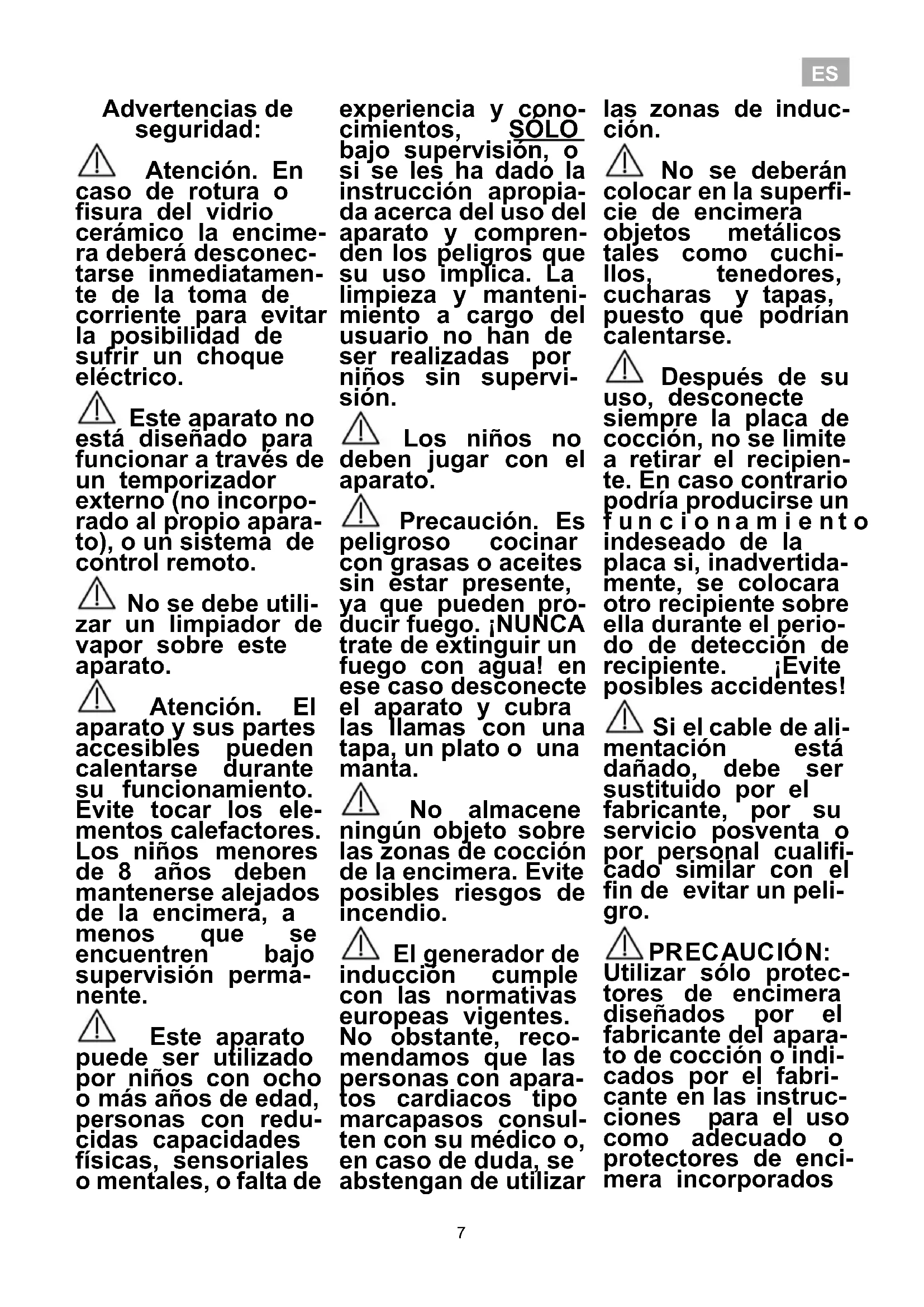 10 ó 5 min.* Modelos con función FondueModelos sin función Fondue* Según modelo 11incrustado entre el embellecedor lateral y el vidrio. Si esto ocurre no intente retirar los restos con la mano, utilice cuidadosamente unas pinzas o un cuchillo de punta fina. (Ver fig. 3) Actúe sólo con la cuchilla sobre la superficie vitrocerámica, evitando cualquier contacto de la carcasa de la rasqueta con el vidrio, pues ello podría originar rasguños sobre el vidrio vitrocerámico. Utilizar cuchillas en perfecto estado, remplazando inmediata- mente la cuchilla en caso de pre- sentar algún tipo de deterioro. Después de terminar el traba- jo con la rasqueta, replegar y blo- quear siempre la cuchilla. (Ver fig. 4) Un recipiente puede adherirse al vidrio por la presencia de algún material fundido entre ellos. ¡No trate de despegar el recipiente en frío!, podría romper el vidrio cerámico. No pise el vidrio ni se apoye en él, podría romperse y causarle lesiones. No utilice el vidrio para depositar objetos. TEKA INDUSTRIAL S.A. se reserva el derecho de introducir en sus manuales las modificaciones que considere necesarias o útiles, sin perjudicar sus características esenciales. Consideraciones medioambientales El símbolo en el producto o en su embalaje indica que este produc- to no se puede tratar como desper- dicios normales del hogar. Este pro- ducto se debe entregar al punto de recolección de equipos eléctricos y electrónicos para reciclaje. Al ase- gurarse de que este producto se deseche correctamente, usted ayu- dará a evitar posibles consecuen- cias negativas para el ambiente y la salud pública, lo cual podría ocurrir si este producto no se manipula de forma adecuada. Para obtener infor- mación más detallada sobre el reci- claje de este producto, póngase en contacto con la administración de su ciudad, con su servicio de des- echos del hogar o con la tienda donde compró el producto. Los materiales de embalaje son ecológicos y totalmente reciclables. Los componentes de plástico se identifican con marcados >PE<, >LD<, >EPS<, etc. Deseche los materiales de embalaje, como resi- duos domésticos en el contenedor correspondiente de su municipio. Si algo no funciona Antes de llamar al Servicio Técnico, realice las comprobaciones indicadas a continuación. No funciona la cocina: Compruebe que el cable de red esté conectado al correspondiente enchufe. Las zonas de inducción no calien- tan: El recipiente es inadecuado (no tiene fondo ferromagnético o es demasiado pequeño). Compruebe que el fondo del recipiente es atraído por un imán, o utilice un recipiente mayor. Se escucha un zumbido al inicio de la cocción en las zonas de induc- ción: En recipientes poco gruesos o que no son de una pieza, el zumbido es con- secuencia de la transmisión de ener- gía directamente al fondo del recipien- te. Este zumbido no es un defecto, pero si de todas formas desea evitarlo, reduzca ligeramente el nivel de poten- cia elegido o emplee un recipiente con fondo más grueso, y/o de una pieza. El control táctil no enciende o, estando encendido, no responde: No tiene ninguna placa seleccionada. Asegúrese de seleccionar una placa antes de actuar sobre ella. Hay humedad sobre los sensores, y/o tiene usted los dedos húmedos. Mantener seca y limpia la superficie del control táctil y/o los dedos. El bloqueo está activado. Desactive el bloqueo. Se escucha un sonido de ventila- ción durante la cocción, que conti- núa incluso con la cocina apagada: Las zonas de inducción incorporan un ventilador para refrigerar la electróni-ca. Éste sólo funciona cuando la tem- peratura de la electrónica es elevada, cuando ésta desciende se apaga auto- máticamente esté o no la cocina acti- vada. Aparece el símbolo en el indica- dor de potencia de una placa: El sistema de inducción no encuentra un recipiente sobre la placa, o éste es inadecuado. Se apaga una placa y aparece el men- saje C81 ó C82 en los indicadores: Temperatura excesiva en la electróni- ca o en el vidrio. Espere un tiempo para que se refrigere la electrónica o retire el recipiente para que se enfríe el vidrio. Aparece C85 en el indicador de una de las placas: El recipiente utilizado no es adecuado. Apague la cocina, vuelva a encender- la y pruebe con otro recipiente.