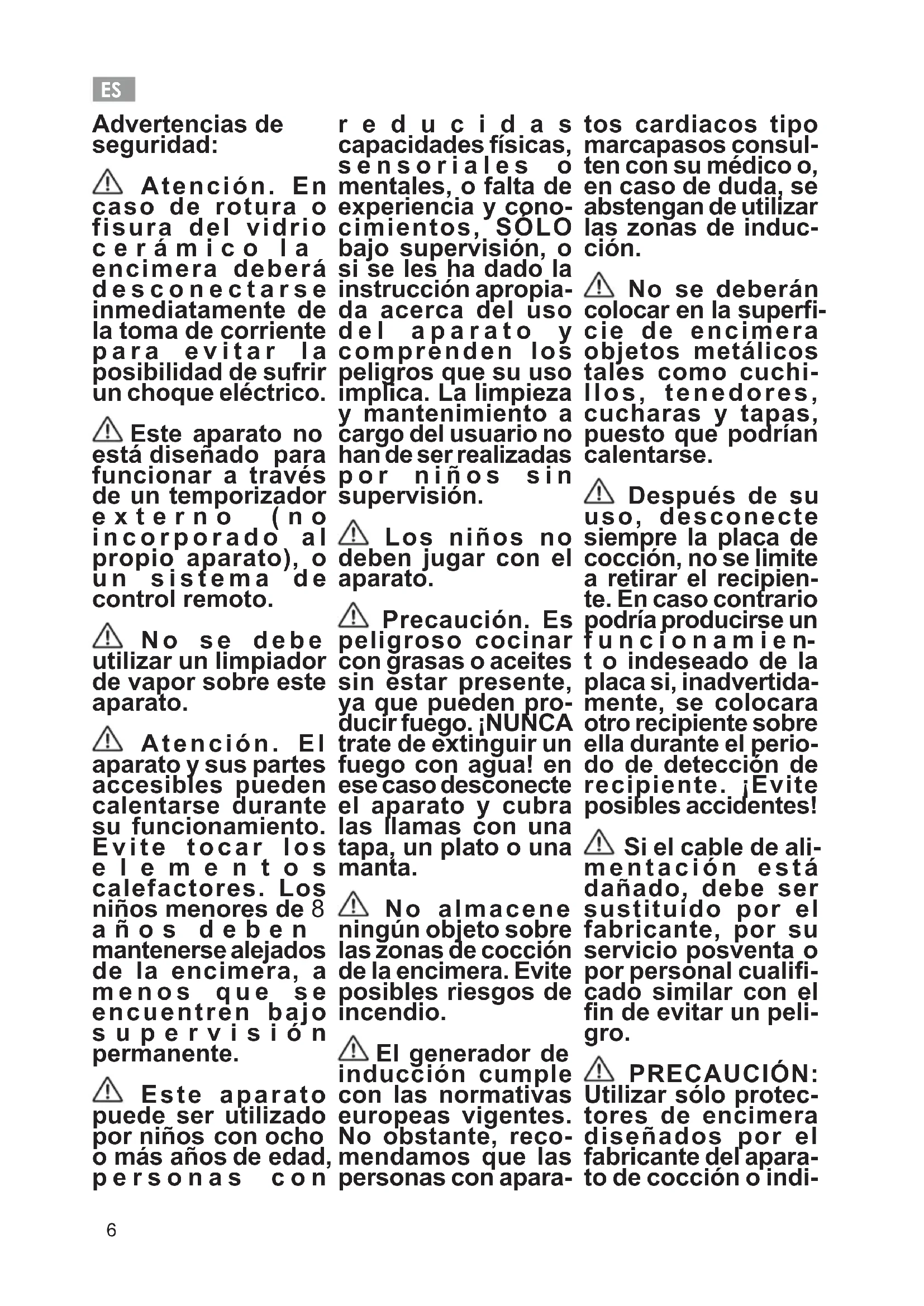 Advertencias de seguridad: Atención. En caso de rotura o fisura del vidrio cerámico la encimera deberá desconectarse inmediatamente de la toma de corriente para evitar la posibilidad de sufrir un choque eléctrico. Este aparato no está diseñado para funcionar a través de un temporizador externo (no incorporado al propio aparato), o un sistema de control remoto. No se debe utilizar un limpiador de vapor sobre este aparato. Atención. El aparato y sus partes accesibles pueden calentarse durante su funcionamiento. Evite tocar los elementos calefactores. Los niños menores de 8 años deben mantenerse alejados de la encimera, a menos que se encuentren bajo supervisión permanente. Este aparato puede ser utilizado por niños con ocho o más años de edad, personas con reducidas capacidades físicas, sensoriales o mentales, o falta de experiencia y cono- cimientos, SÓLO bajo supervisión, o si se les ha dado la instrucción apropia- da acerca del uso del aparato y comprenden los peligros que su uso implica. La limpieza y mantenimiento a cargo del usuario no han de ser realizadas por niños sin supervisión. Los niños no deben jugar con el aparato. Precaución. Es peligroso cocinar con grasas o aceites sin estar presente, ya que pueden pro- ducir fuego. ¡NUNCA trate de extinguir un fuego con agua! en ese caso desconecte el aparato y cubra las llamas con una tapa, un plato o una manta. No almacene ningún objeto sobre las zonas de cocción de la encimera. Evite posibles riesgos de incendio. El generador de inducción cumple con las normativas europeas vigentes. No obstante, reco- mendamos que las personas con apara- tos cardiacos tipo marcapasos consul- ten con su médico o, en caso de duda, se abstengan de utilizar las zonas de induc- ción. No se deberán colocar en la super- cie de encimera objetos metálicos tales como cuchi- llos, tenedores, cucharas y tapas, puesto que podrían calentarse. Después de su uso, desconecte siempre la placa de cocción, no se limite a retirar el recipien- te. En caso contrario podría producirse un f u n c i o n a m i e n- t o indeseado de la placa si, inadvertida- mente, se colocara otro recipiente sobre ella durante el perio- do de detección de recipiente. ¡Evite posibles accidentes! Si el cable de ali- mentación está dañado, debe ser sustituido por el fabricante, por su servicio posventa o por personal cuali- cado similar con el n de evitar un peli- gro. PRECAUCIÓN: Utilizar sólo protec- tores de encimera diseñados por el fabricante del apara- to de cocción o indi-ES