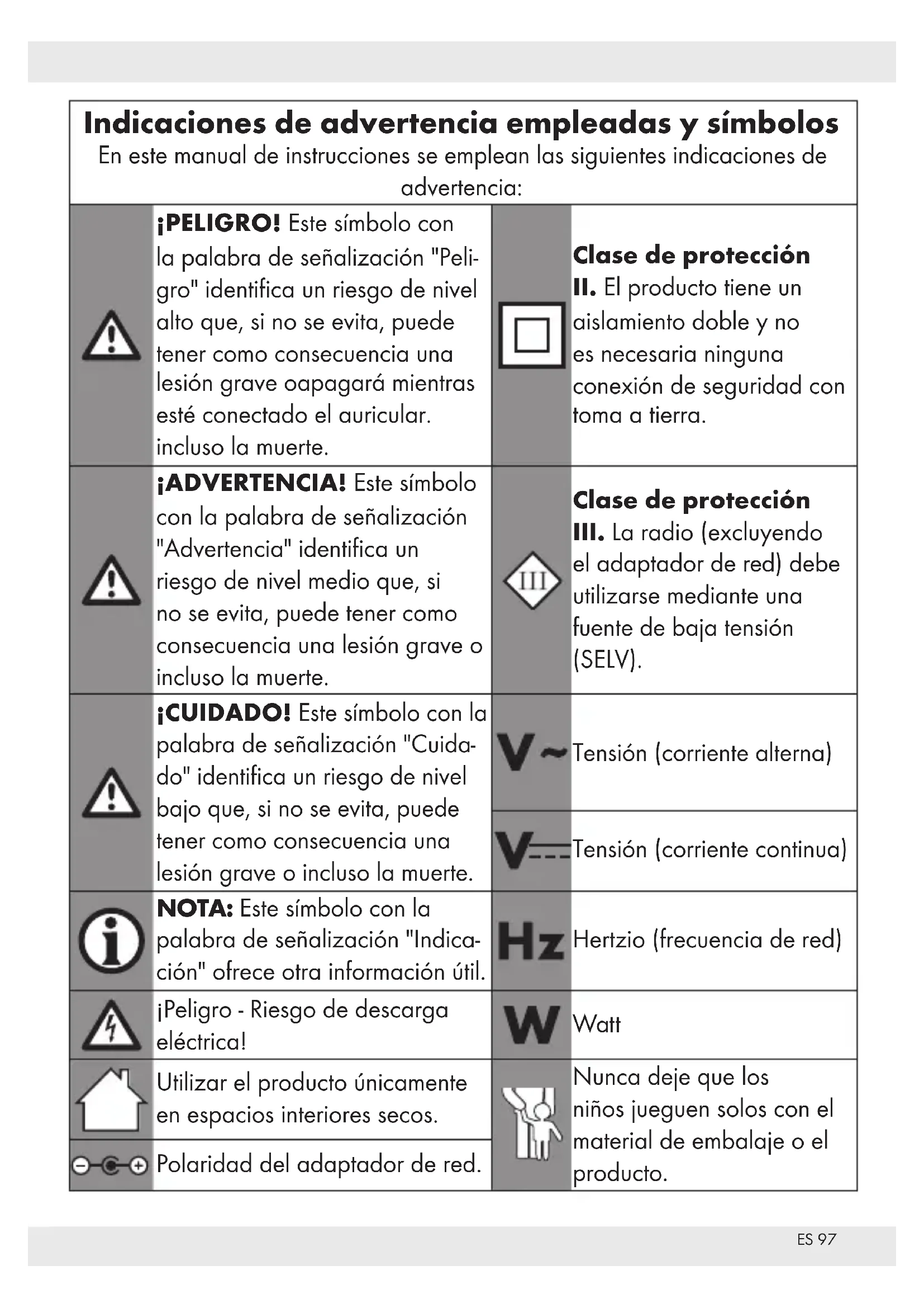 do" identifica un riesgo de nivel bajo que, si no se evita, puede tener como consecuencia una lesión grave o incluso la muerte. Tensión (corriente alterna) Tensión (corriente continua) NOTA: Este símbolo con la palabra de señalización "Indica- ción" ofrece otra información útil. Hertzio (frecuencia de red) ¡Peligro - Riesgo de descarga eléctrica! Watt Utilizar el producto únicamente en espacios interiores secos. Nunca deje que los niños jueguen solos con el material de embalaje o el producto. Polaridad del adaptador de red.ES98 RADIO DIGITAL Introducción Enhorabuena por la adquisición de su nuevo producto. Ha optado por un producto de alta calidad. El manual de instrucciones forma parte de este producto. Contiene importantes indicaciones sobre seguridad, uso y eliminación. Antes de usar el produc- to, familiarícese con todas las indi- caciones de manejo y de seguridad. Utilice el producto únicamente como se describe a continuación y para las aplicaciones indicadas. Adjunte igual- mente toda la documentación en caso de entregar el producto a terceros. Uso conforme a lo prescrito Este producto es un aparato electró- nico de consumo. Sirve para recibir y reproducir emisiones de radio analógicas y digitales. Este producto sólo debe ser utilizado para uso do- méstico y no es apropiado para fines comerciales o industriales. Además, no se debe emplear el producto en cli- mas tropicales. Cualquier otro uso se considera inadecuado. Las reclama- ciones por un uso inadecuado o por modificaciones no autorizadas en el producto no están dentro del alcance de la garantía. Este tipo de uso corre a su propio riesgo.