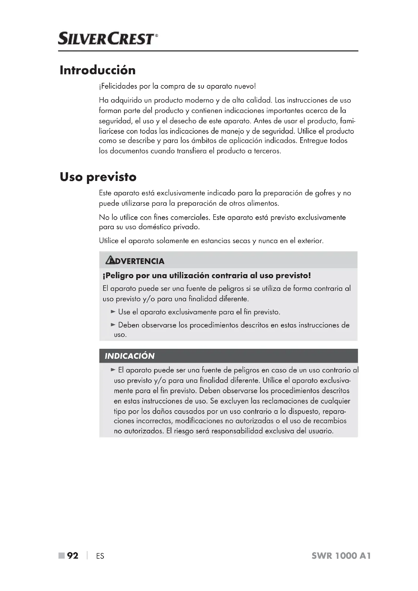 ES SWR 1000 A1 Introducción ¡Felicidades por la compra de su aparato nuevo! Ha adquirido un producto moderno y de alta calidad. Las instrucciones de uso forman parte del producto y contienen indicaciones importantes acerca de la seguridad, el uso y el desecho de este aparato. Antes de usar el producto, fami- liarícese con todas las indicaciones de manejo y de seguridad. Utilice el producto como se describe y para los ámbitos de aplicación indicados. Entregue todos los documentos cuando transfiera el producto a terceros. Uso previsto Este aparato está exclusivamente indicado para la preparación de gofres y no puede utilizarse para la preparación de otros alimentos. No lo utilice con fines comerciales. Este aparato está previsto exclusivamente para su uso doméstico privado. Utilice el aparato solamente en estancias secas y nunca en el exterior. ADVERTENCIA ¡Peligro por una utilización contraria al uso previsto! El aparato puede ser una fuente de peligros si se utiliza de forma contraria al uso previsto y/o para una finalidad diferente. ► Use el aparato exclusivamente para el fin previsto. ► Deben observarse los procedimientos descritos en estas instrucciones de uso. INDICACIÓN ► El aparato puede ser una fuente de peligros en caso de un uso contrario al uso previsto y/o para una finalidad diferente. Utilice el aparato exclusiva- mente para el fin previsto. Deben observarse los procedimientos descritos en estas instrucciones de uso. Se excluyen las reclamaciones de cualquier tipo por los daños causados por un uso contrario a lo dispuesto, repara- ciones incorrectas, modificaciones no autorizadas o el uso de recambios no autorizados. El riesgo será responsabilidad exclusiva del usuario.ES