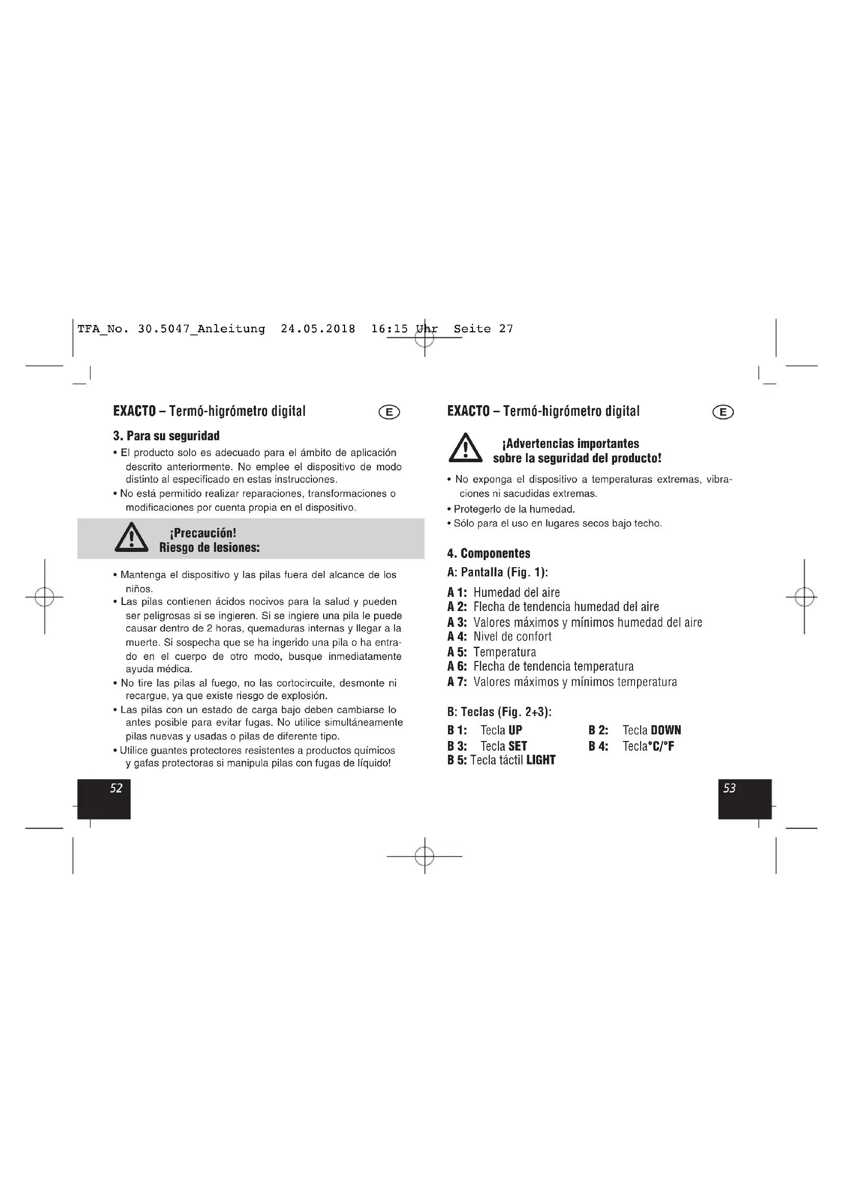 A: Pantalla (Fig. 1): A 1: Humedad del aire A 2: Flecha de tendencia humedad del aire A 3: Valores máximos y mínimos humedad del aire A 4: Nivel de confort A 5: Temperatura A 6: Flecha de tendencia temperatura A 7: Valores máximos y mínimos temperatura B: Teclas (Fig. 2+3): B 1: Tecla UP B 2: Tecla DOWN B 3: Tecla SET B 4: Tecla°C/°F B 5: Tecla táctil LIGHT TFA_No. 30.5047_Anleitung 24.05.2018 16:15 Uhr Seite 275554 EXACTO – Termó-higrómetro digital
