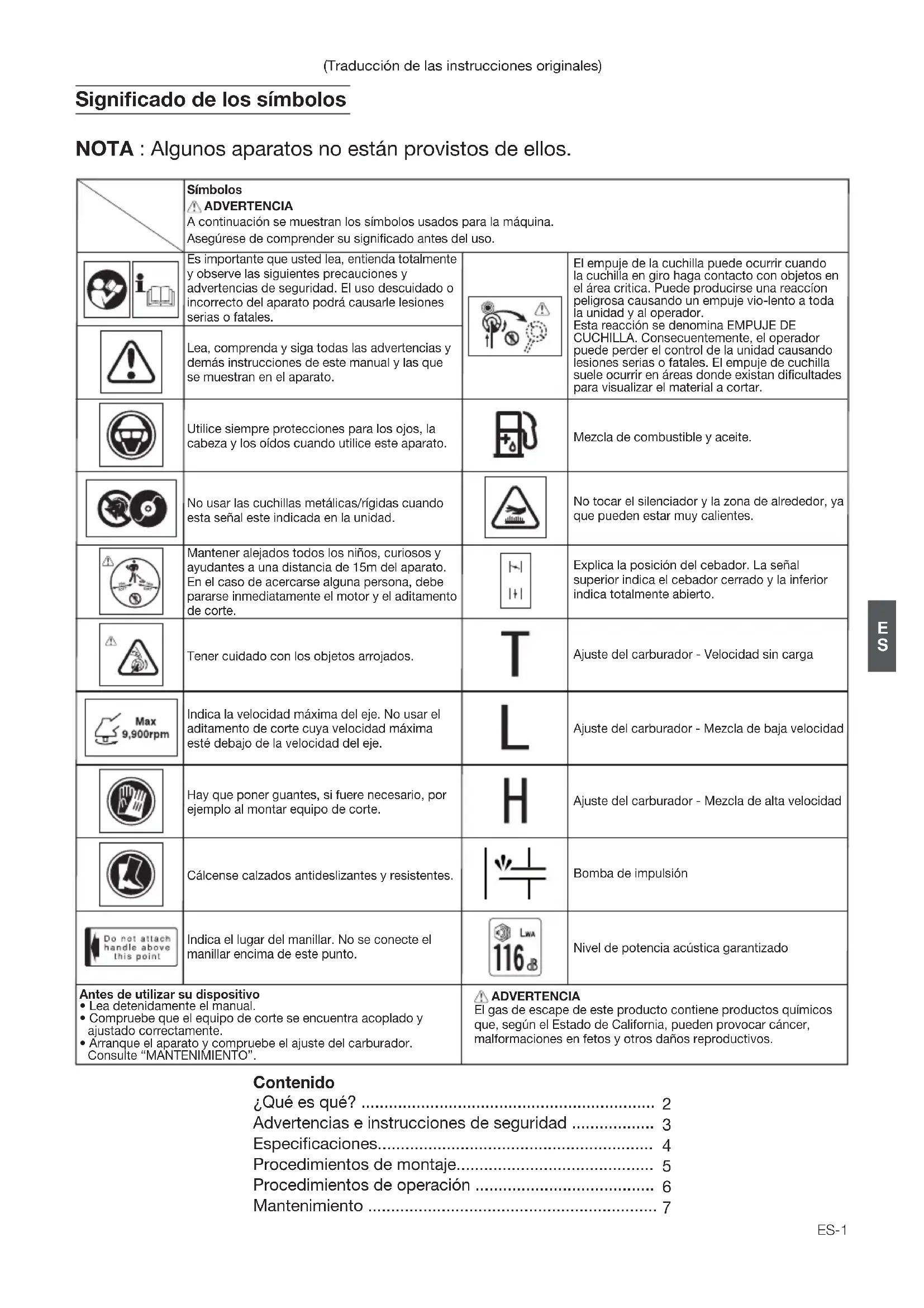 - Arranque el aparato y compruebe el ajuste del carburador. Consulte “MANTENIMIENTO”. Significado de los símbolos NOTA : Algunos aparatos no están provistos de ellos. Símbolos ADVERTENCIA A continuación se muestran los símbolos usados para la máquina. Asegúrese de comprender su significado antes del uso. ADVERTENCIA El gas de escape de este producto contiene productos químicos que, según el Estado de California, pueden provocar cáncer, malformaciones en fetos y otros daños reproductivos. Lea, comprenda y siga todas las advertencias y demás instrucciones de este manual y las que se muestran en el aparato. Es importante que usted lea, entienda totalmente y observe las siguientes precauciones y advertencias de seguridad. El uso descuidado o incorrecto del aparato podrá causarle lesiones serias o fatales. Utilice siempre protecciones para los ojos, la cabeza y los oídos cuando utilice este aparato. (Traducción de las instrucciones originales) Contenido ¿Qué es qué? ................................................................ Advertencias e instrucciones de seguridad .................. Especificaciones............................................................ Procedimientos de montaje........................................... Procedimientos de operación ....................................... Mantenimiento ...............................................................