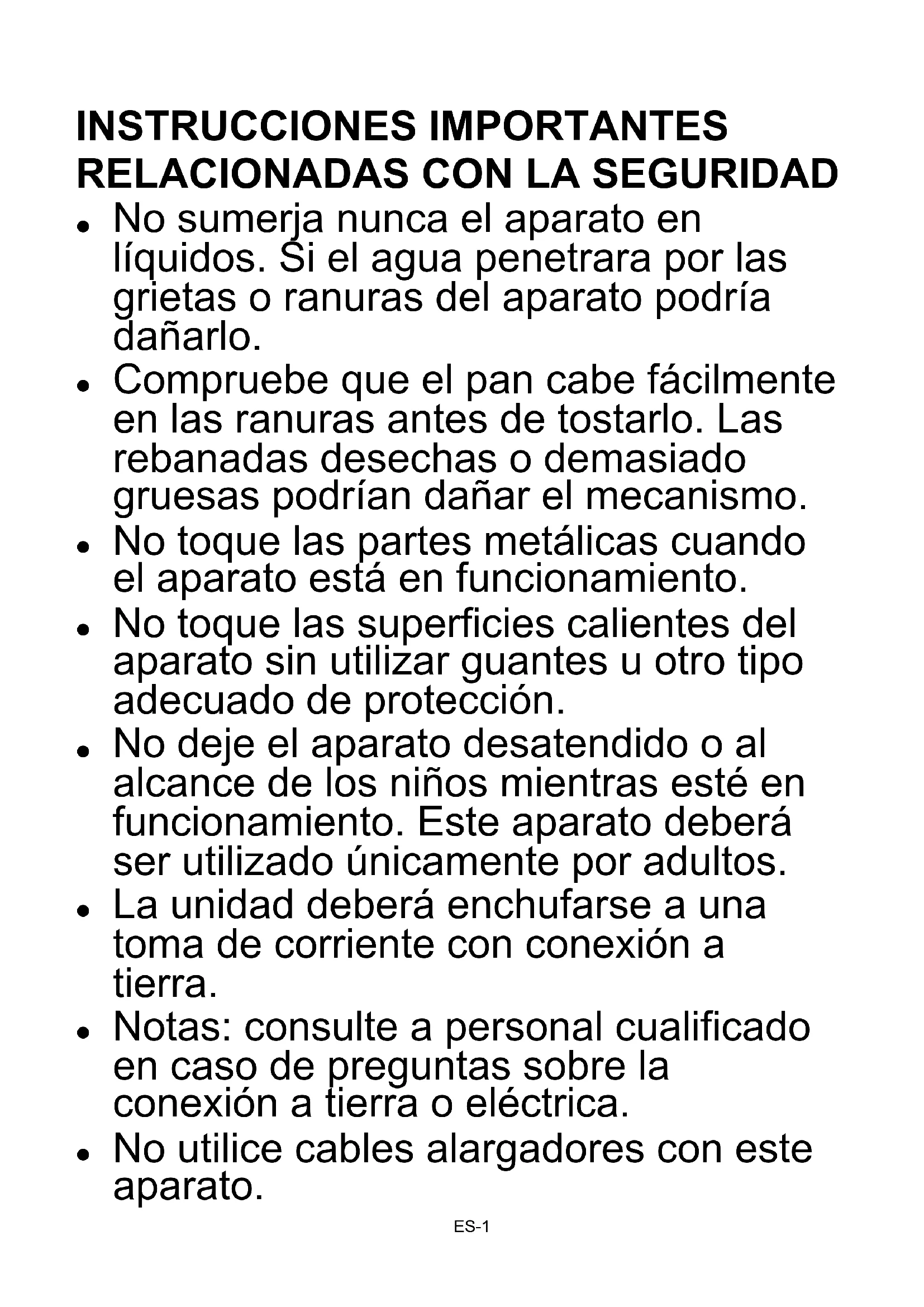 El pan podría quemarse, por lo que no deberá usarse nunca la tostadora ES-3cerca, o debajo, de cortinas o de cualquier otro material combustible.