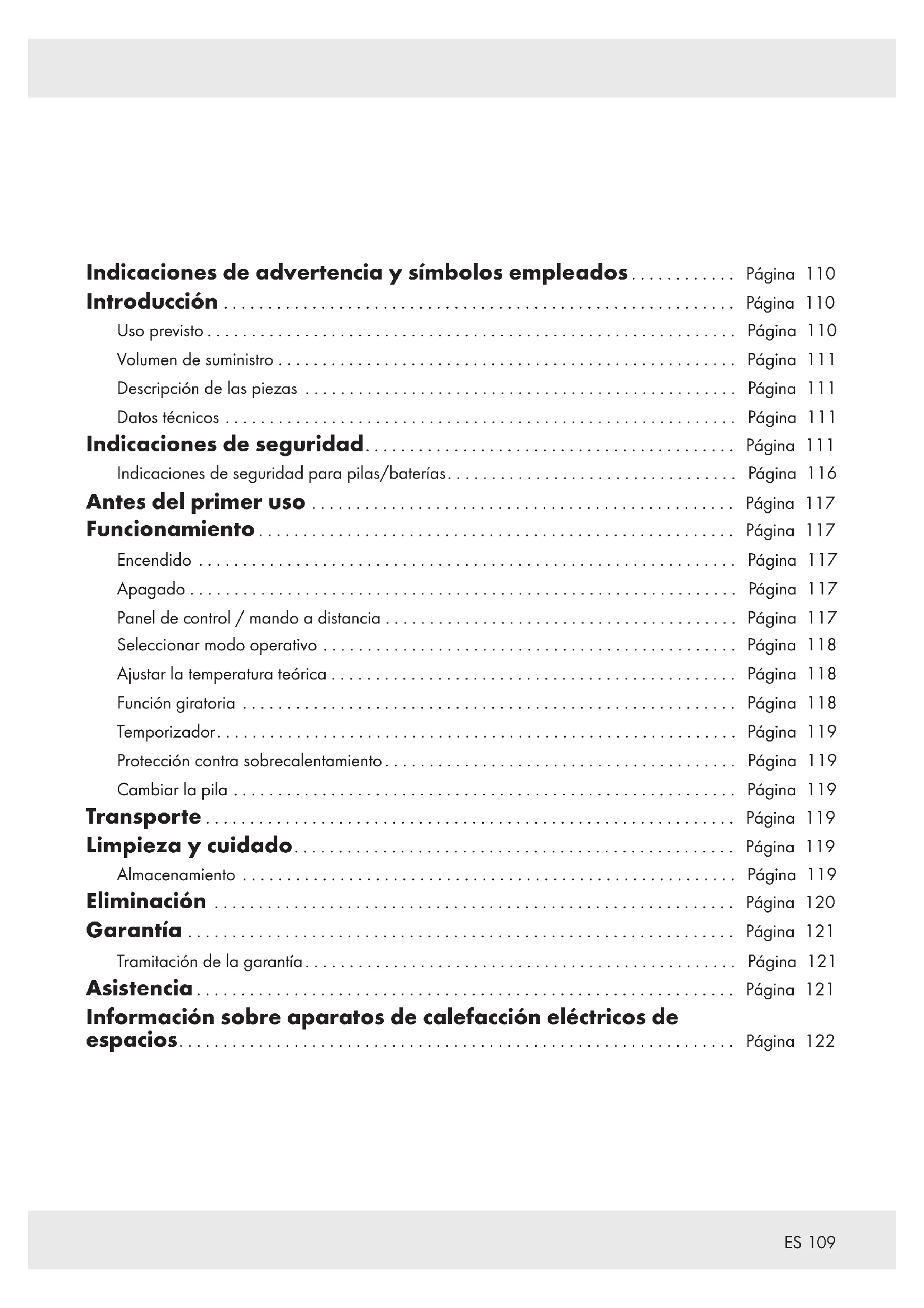Indicaciones de advertencia y símbolos empleados .......... . . Página 110 Introducción ........................................................ . . Página 110 Uso previsto .......................................................... . . Página 110 Volumen de suministro .................................................. . . Página 111 Descripción de las piezas ............................................... . . Página 111 Datos técnicos ........................................................ . . Página 111 Indicaciones de seguridad........................................ . . Página 111 Indicaciones de seguridad para pilas/baterías............................... . . Página 116 Antes del primer uso .............................................. . . Página 117 Funcionamiento .................................................... . . Página 117 Encendido ........................................................... . . Página 117 Apagado . . . . . . . . . . . . . . . . . . . . . . . . . . . . . . . . . . . . . . . . . . . . . . . . . . . . . . . . . . . . . . Página 117 Panel de control / mando a distancia ...................................... . . Página 117 Seleccionar modo operativo ............................................. . . Página 118 Ajustar la temperatura teórica ............................................ . . Página 118 Función giratoria ...................................................... . . Página 118 Temporizador......................................................... . . Página 119 Protección contra sobrecalentamiento ...................................... . . Página 119 Cambiar la pila ....................................................... . . Página 119 Transporte .......................................................... . . Página 119 Limpieza y cuidado................................................ . . Página 119 Almacenamiento ...................................................... . . Página 119 Eliminación ......................................................... . . Página 120 Garantía ............................................................ . . Página 121 Tramitación de la garantía............................................... . . Página 121 Asistencia ........................................................... . . Página 121 Información sobre aparatos de calefacción eléctricos de espacios............................................................. . . Página 122110