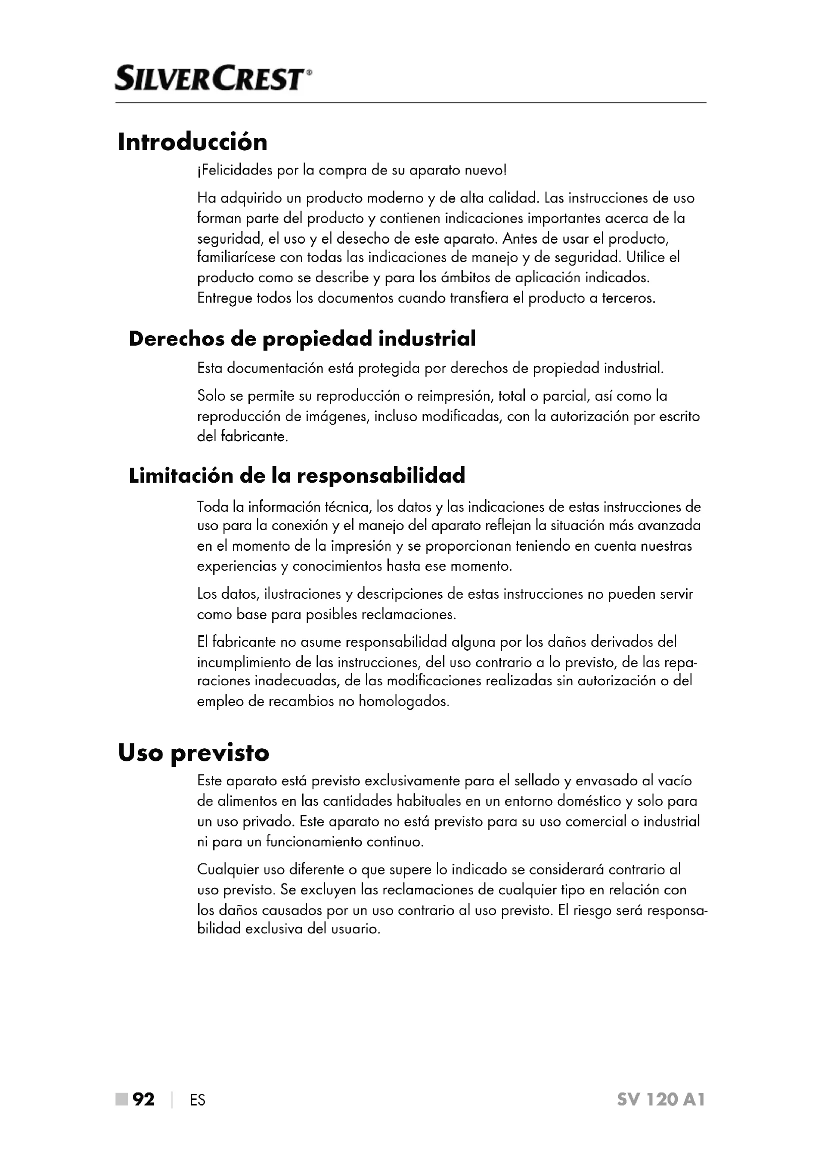 ES SV 120 A1 Introducción ¡Felicidades por la compra de su aparato nuevo! Ha adquirido un producto moderno y de alta calidad. Las instrucciones de uso forman parte del producto y contienen indicaciones importantes acerca de la seguridad, el uso y el desecho de este aparato. Antes de usar el producto, familiarícese con todas las indicaciones de manejo y de seguridad. Utilice el producto como se describe y para los ámbitos de aplicación indicados. Entregue todos los documentos cuando transfiera el producto a terceros. Derechos de propiedad industrial Esta documentación está protegida por derechos de propiedad industrial. Solo se permite su reproducción o reimpresión, total o parcial, así como la reproducción de imágenes, incluso modificadas, con la autorización por escrito del fabricante. Limitación de la responsabilidad Toda la información técnica, los datos y las indicaciones de estas instrucciones de uso para la conexión y el manejo del aparato reflejan la situación más avanzada en el momento de la impresión y se proporcionan teniendo en cuenta nuestras experiencias y conocimientos hasta ese momento. Los datos, ilustraciones y descripciones de estas instrucciones no pueden servir como base para posibles reclamaciones. El fabricante no asume responsabilidad alguna por los daños derivados del incumplimiento de las instrucciones, del uso contrario a lo previsto, de las repa- raciones inadecuadas, de las modificaciones realizadas sin autorización o del empleo de recambios no homologados. Uso previsto Este aparato está previsto exclusivamente para el sellado y envasado al vacío de alimentos en las cantidades habituales en un entorno doméstico y solo para un uso privado. Este aparato no está previsto para su uso comercial o industrial ni para un funcionamiento continuo. Cualquier uso diferente o que supere lo indicado se considerará contrario al uso previsto. Se excluyen las reclamaciones de cualquier tipo en relación con los daños causados por un uso contrario al uso previsto. El riesgo será responsa- bilidad exclusiva del usuario.ES