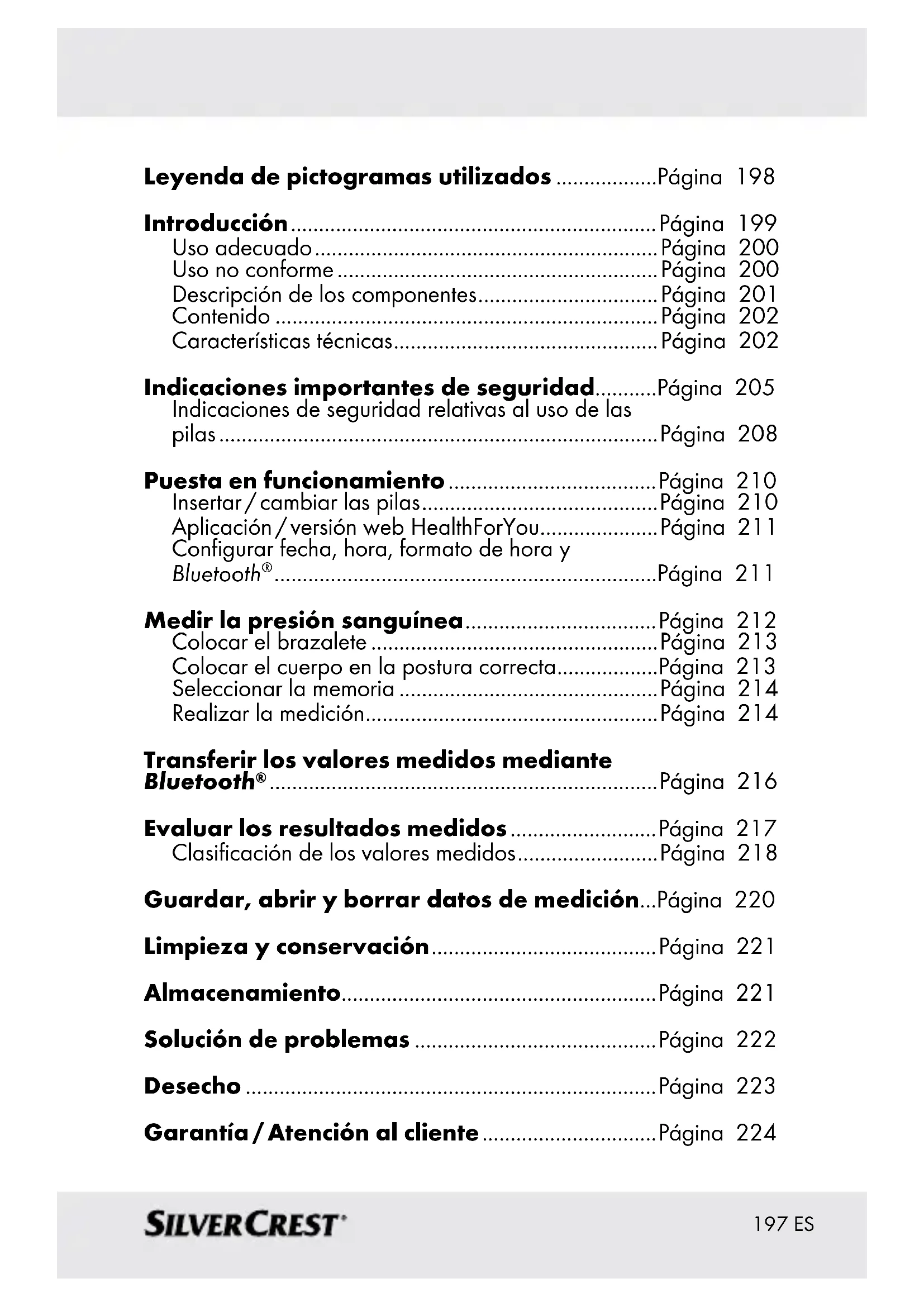 ..................................................................... Página 216 Evaluar los resultados medidos ..........................Página 217 Clasificación de los valores medidos ......................... Página 218 Guardar, abrir y borrar datos de medición ...Página 220 Limpieza y conservación ........................................ Página 221 Almacenamiento ........................................................Página 221 Solución de problemas ...........................................Página 222 Desecho .........................................................................Página 223 Garantía / Atención al cliente ...............................Página 224198 ES Leyenda de pictogramas utilizados Indicación de advertencia sobre peligro de lesiones o para su salud Indicación de seguridad sobre posibles daños del aparato o de los accesorios Aviso sobre seguridad Instrucciones de manejo Tenga en cuenta las instrucciones de uso Corriente continua Storage & Transport Temperatura de almacenamiento y transporte y humedad relativa admisibles Operating Temperatura y humedad relativa admisibles para el funcionamiento Presión de almacenamiento, transporte y funcionamiento admisibles Fabricante Pieza de aplicación tipo BF199 ES Número de serie