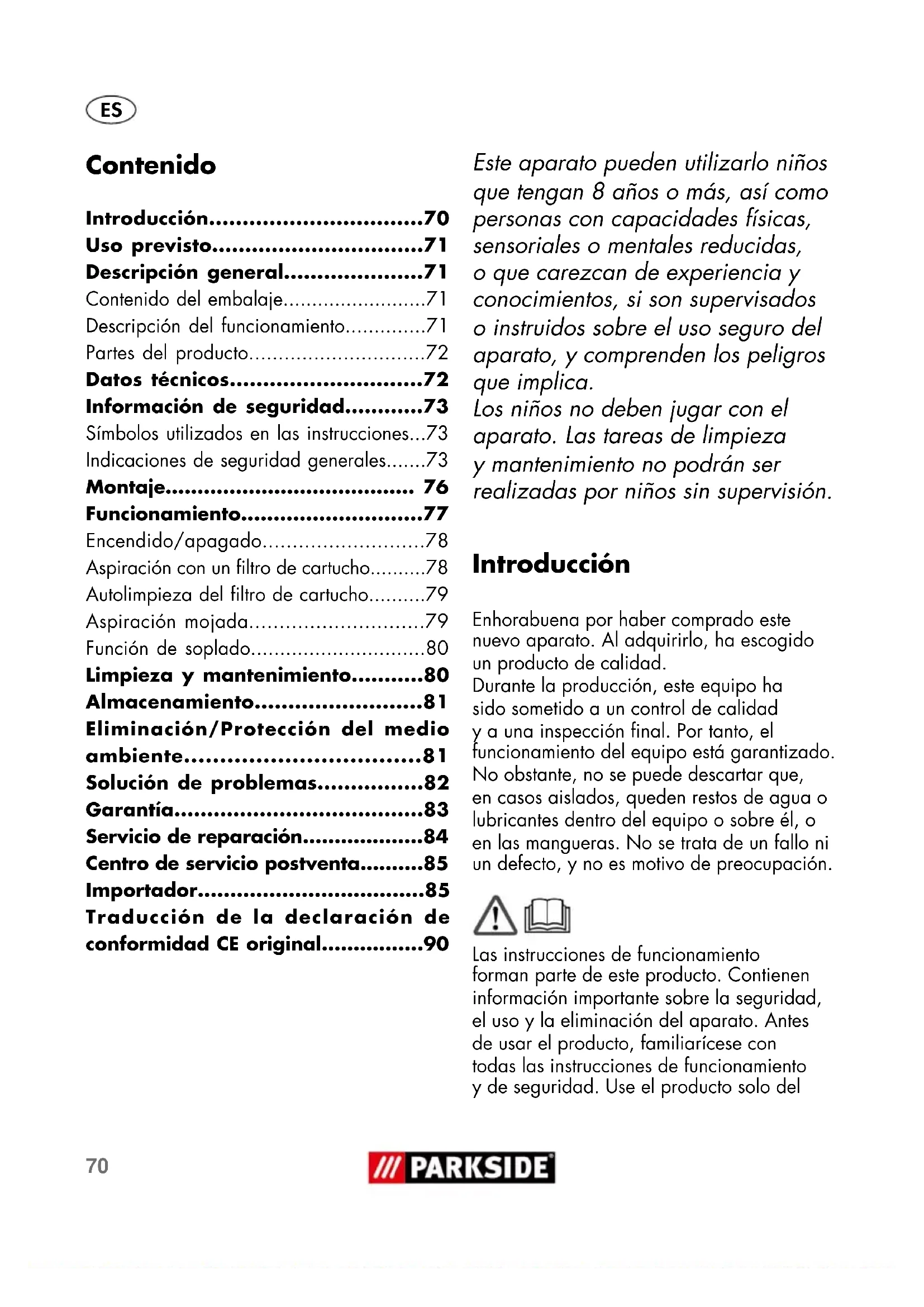 - Traducción de la declaración de conformidad CE original Este aparato pueden utilizarlo niños que tengan 8 años o más, así como personas con capacidades físicas, sensoriales o mentales reducidas, o que carezcan de experiencia y conocimientos, si son supervisados o instruidos sobre el uso seguro del aparato, y comprenden los peligros que implica. Los niños no deben jugar con el aparato. Las tareas de limpieza y mantenimiento no podrán ser realizadas por niños sin supervisión. Introducción Enhorabuena por haber comprado este nuevo aparato. Al adquirirlo, ha escogido un producto de calidad. Durante la producción, este equipo ha sido sometido a un control de calidad y a una inspección final. Por tanto, el funcionamiento del equipo está garantizado. No obstante, no se puede descartar que, en casos aislados, queden restos de agua o lubricantes dentro del equipo o sobre él, o en las mangueras. No se trata de un fallo ni un defecto, y no es motivo de preocupación. Las instrucciones de funcionamiento forman parte de este producto. Contienen información importante sobre la seguridad, el uso y la eliminación del aparato. Antes de usar el producto, familiarícese con todas las instrucciones de funcionamiento y de seguridad. Use el producto solo delES p. 90