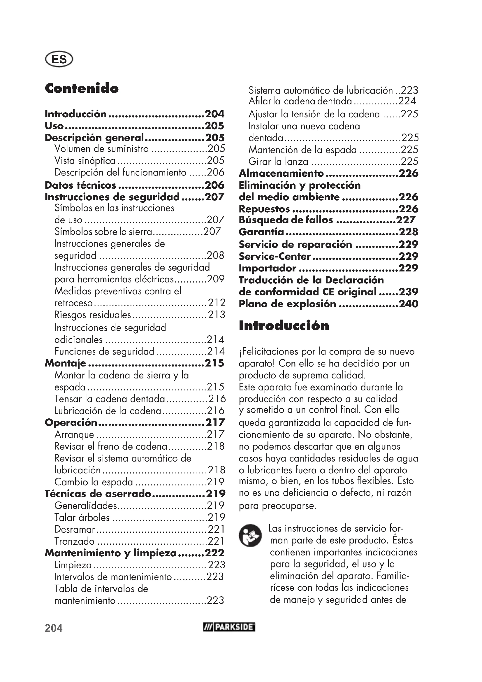 usar el producto. Utilice el producto sólo como se describe y para los campos de aplicación indicados. Guarde bien estas instrucciones y entrégueselas al dar este producto a terceros. Uso La sierra eléctrica de cadena fue diseñada sólo para cortar madera. No está prevista para todos los demás nes de uso (p.ej. el corte de albañilería, plástico o alimentos). La sierra de cadena está destinada al área de bricolaje. No fue concebida para el uso profesional permanente. El equipo está destinado para el uso por personal adulto. El uso de la sierra de cadena está permi- tido sólo bajo vigilancia a adolescentes mayores de 16 años. El fabricante no se responsabiliza por daños causados por el uso contrario al previsto o por operación incorrecta. Dette apparat er ikke egnet til erhvervs- mæssig brug. Ved erhvervsmæssig brug bortfalder garantien. Esta electrosierra de cadena puede ser utilizada sólo por una persona y sólo para cortar madera. La sierra de cadena tiene que ser sostenida con la mano de- recha por la empuñadura posterior y con la mano izquierda por la empuñadura delantera. Antes de utilizar la sierra de cadena, el usuario tiene que haber leído y entendido todas las indicaciones e instruc- ciones contenidas en el manual de uso. El usuario tiene que llevar un equipamiento de protección personal (EPP). Con la sierra de cadena sólo se puede cortar madera. ¡No está permitido cortar materiales como p. ej. plástico, piedra, metal o madera que contenga cuerpos extraños (p. ej. clavos o tornillos)! Descripción general Encontrará las ilustraciones para la operación y el mantenimiento en las solapas delantera y trase- ra. Volumen de suministro Desembale el aparato y compruebe que esté completo: - Sierra eléctrica de cadena - Espada (riel guía) (ya montado) - Cadena de sierra (ya montado) - Portador protector de cuchilla - Botella de aceite con 180 ml aceite biol. para cadena - Instrucciones de uso Evacue el material de embalaje de una forma conveniente. Vista sinóptica