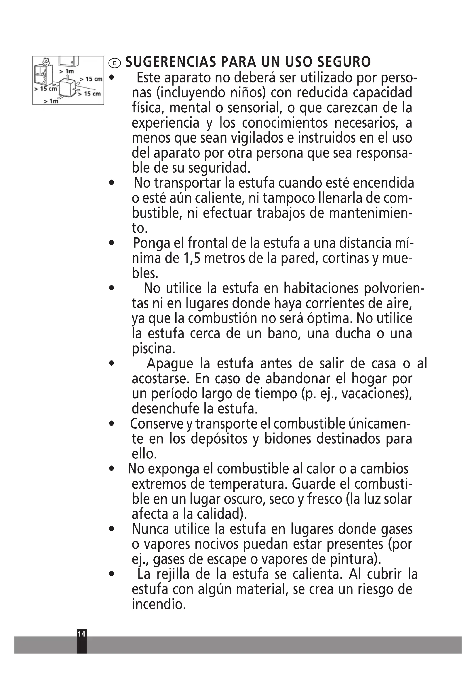 - Ponga el frontal de la estufa a una distancia mí- nima de 1,5 metros de la pared, cortinas y mue- bles.