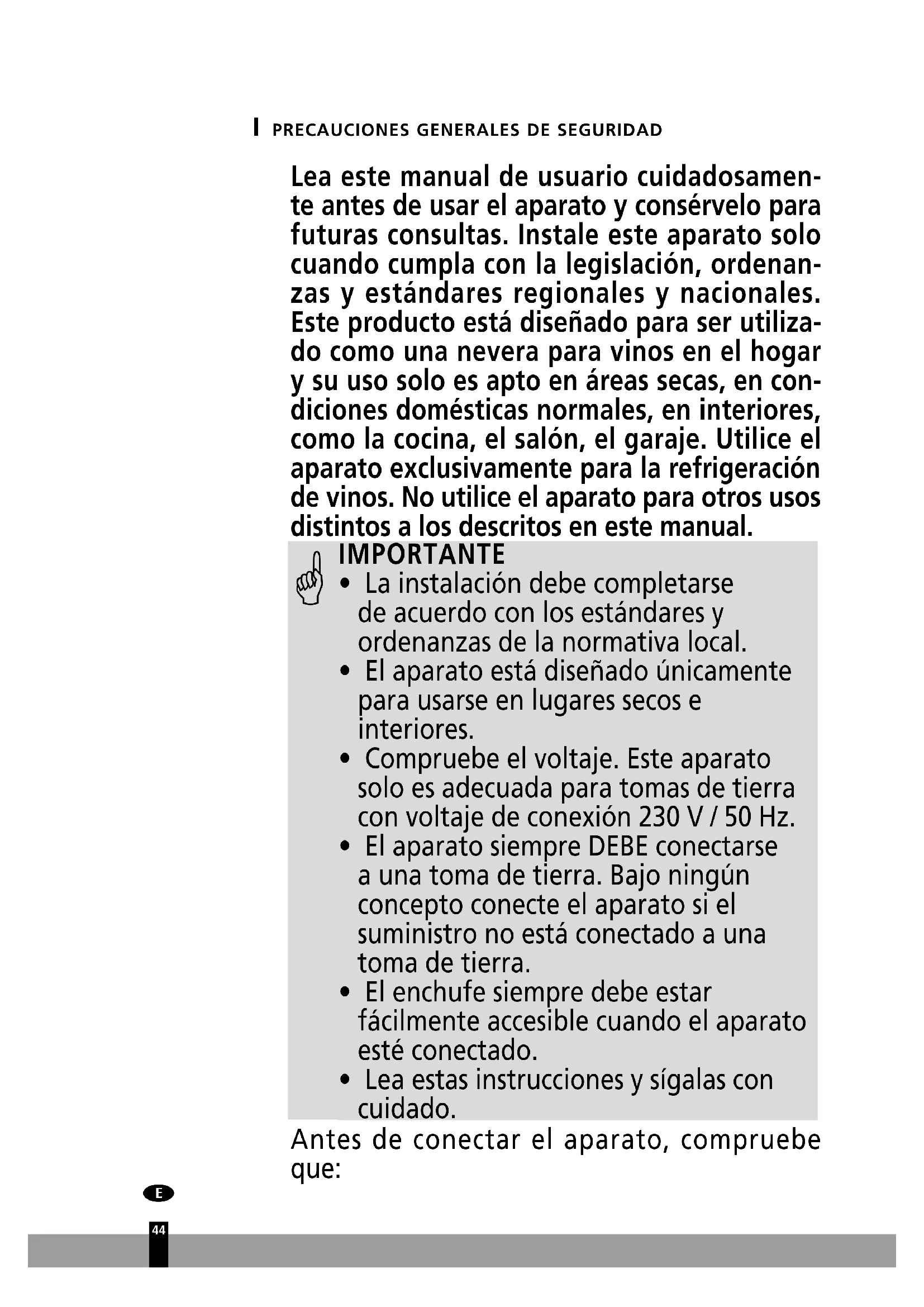 - La nevera para vinos es un aparato seguro, fabricado en conformidad con las normas de seguridad CE (Conformidad Europea). No obstante, al igual que con cualquier aparato eléctrico, tenga cuidado cuando lo use.