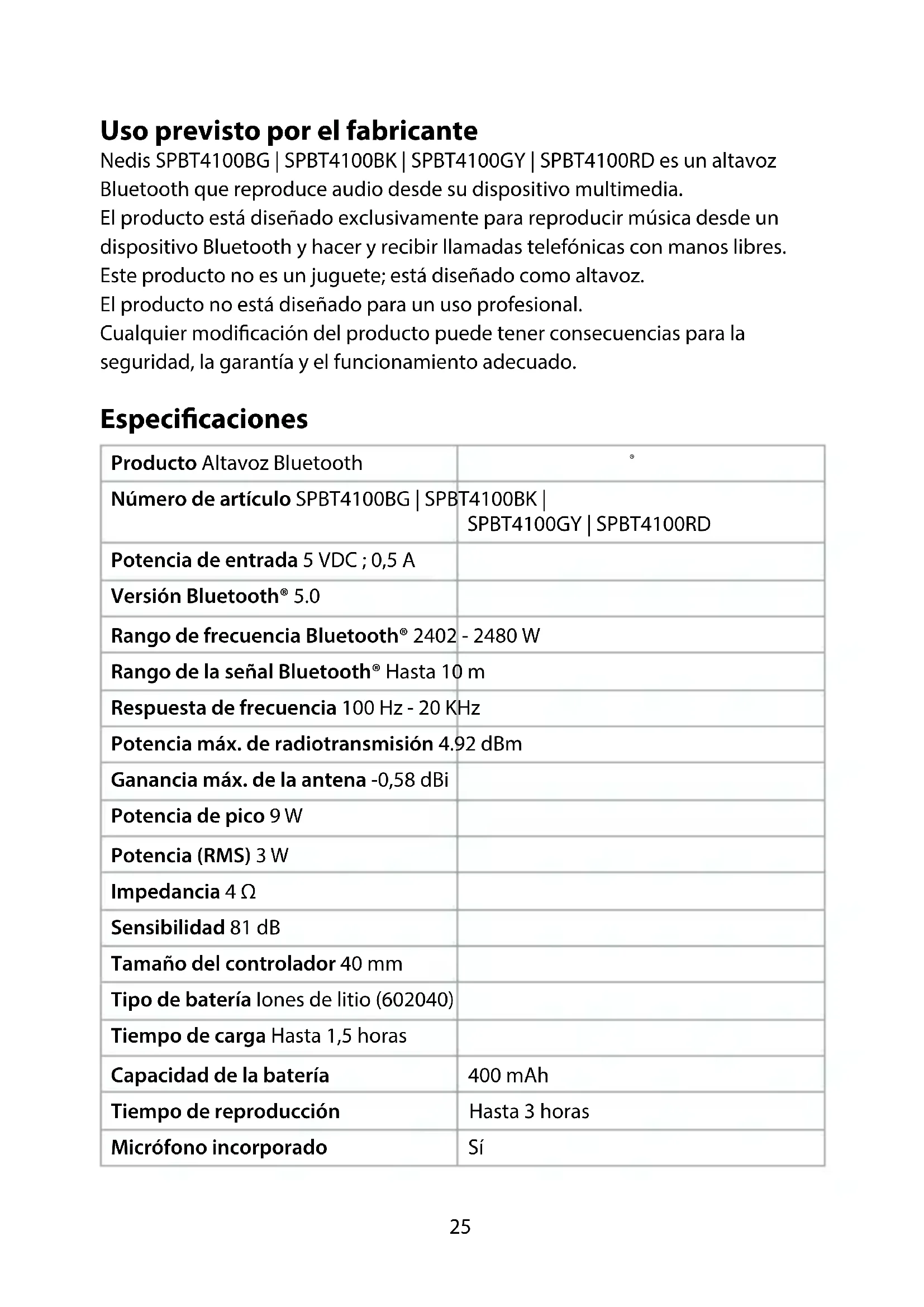 Para más información, consulte el manual ampliado en línea: ned.is/spbt4100bg | ned.is/spbt4100bk ned.is/spbt4100gy | ned.is/spbt4100rd25 Uso previsto por el fabricante Nedis SPBT4100BG | SPBT4100BK | SPBT4100GY | SPBT4100RD es un altavoz Bluetooth que reproduce audio desde su dispositivo multimedia. El producto está diseñado exclusivamente para reproducir música desde un dispositivo Bluetooth y hacer y recibir llamadas telefónicas con manos libres. Este producto no es un juguete; está diseñado como altavoz. El producto no está diseñado para un uso profesional. Cualquier modicación del producto puede tener consecuencias para la seguridad, la garantía y el funcionamiento adecuado. Especicaciones Producto Altavoz Bluetooth