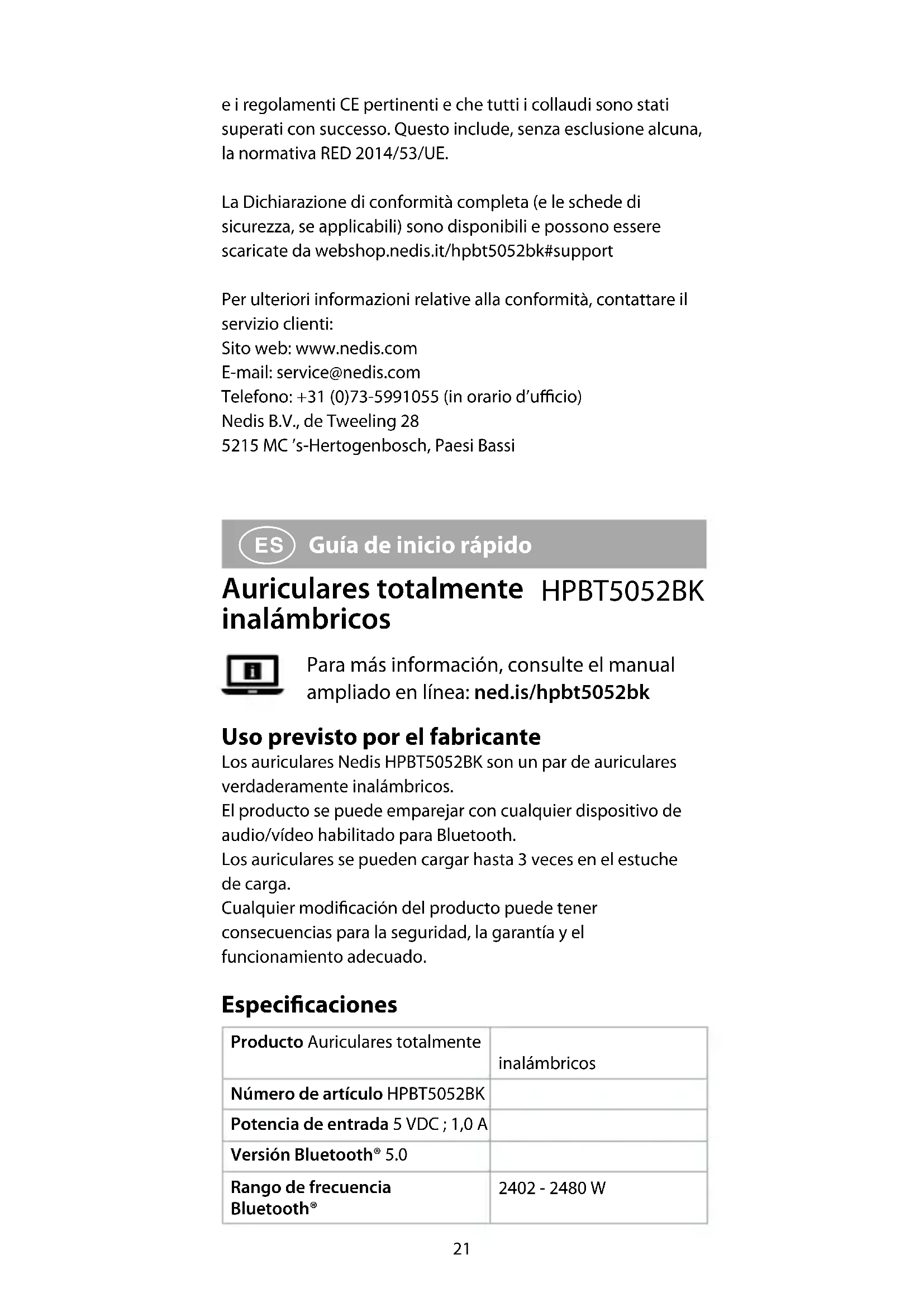 Guía de inicio rápido Auriculares totalmente inalámbricos HPBT5052BK Para más información, consulte el manual ampliado en línea: ned.is/hpbt5052bk Uso previsto por el fabricante Los auriculares Nedis HPBT5052BK son un par de auriculares verdaderamente inalámbricos. El producto se puede emparejar con cualquier dispositivo de audio/vídeo habilitado para Bluetooth. Los auriculares se pueden cargar hasta 3 veces en el estuche de carga. Cualquier modicación del producto puede tener consecuencias para la seguridad, la garantía y el funcionamiento adecuado. Especicaciones Producto Auriculares totalmente inalámbricos Número de artículo HPBT5052BK Potencia de entrada 5 VDC ; 1,0 A Versión Bluetooth® 5.0 Rango de frecuencia Bluetooth® 2402 - 2480 W22 Respuesta de frecuencia 20 Hz - 20 KHz Potencia máx. de radiotransmisión 4 dBm Impedancia 32 Ω Tamaño del controlador 10 mm Control por voz Siri, asistente de Google Tipo de batería Polímero de litio Tiempo de carga Hasta 1,5 horas Recargas en el estuche Hasta 3 veces Capacidad de la batería de los auriculares 2 x 50 mAh Capacidad de la batería del estuche de carga 400 mAh Tiempo de reproducción Hasta 5 horas Impermeabilidad No Partes principales (imagen A)