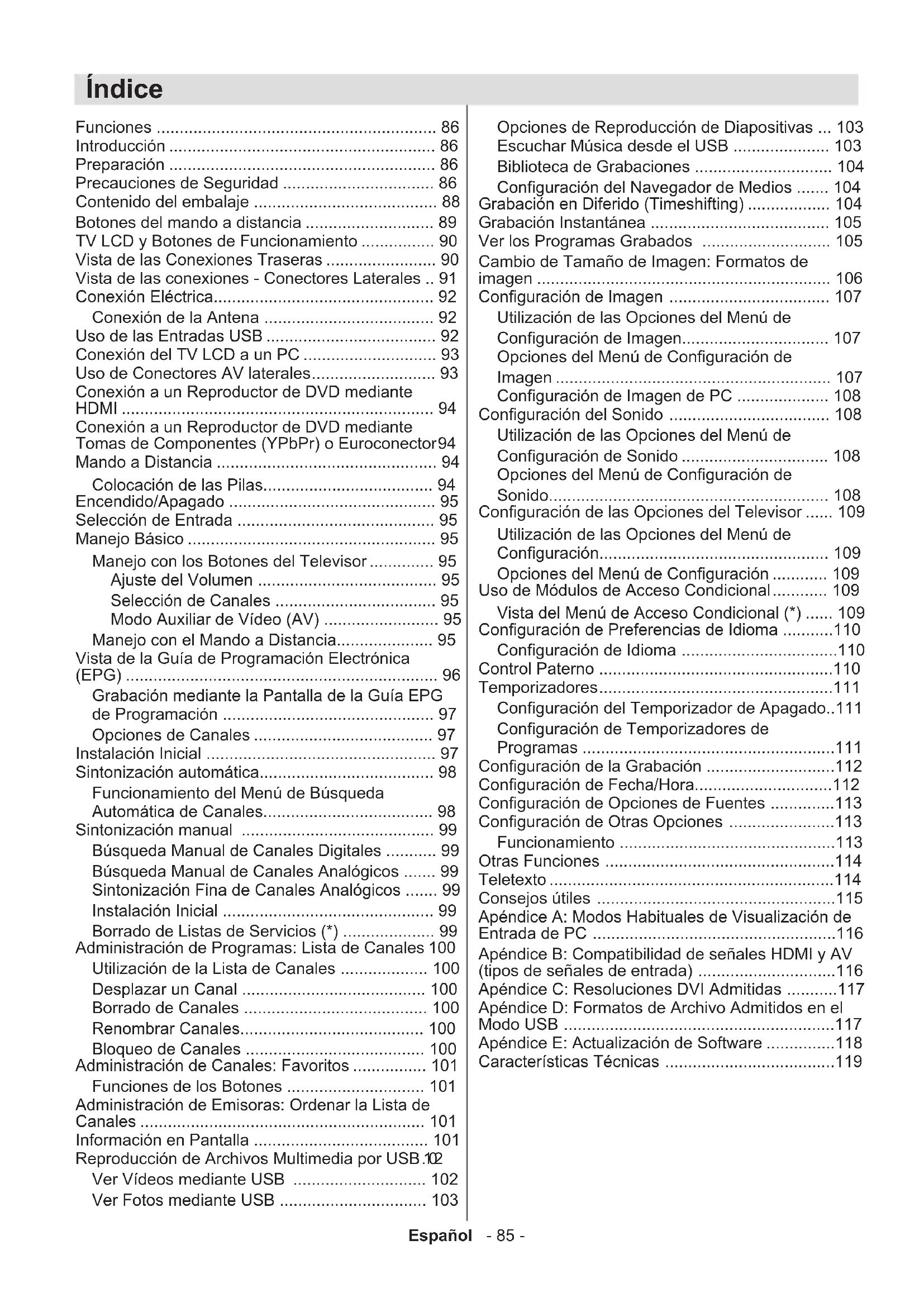 - Búsqueda Manual de Canales Analógicos p. 99