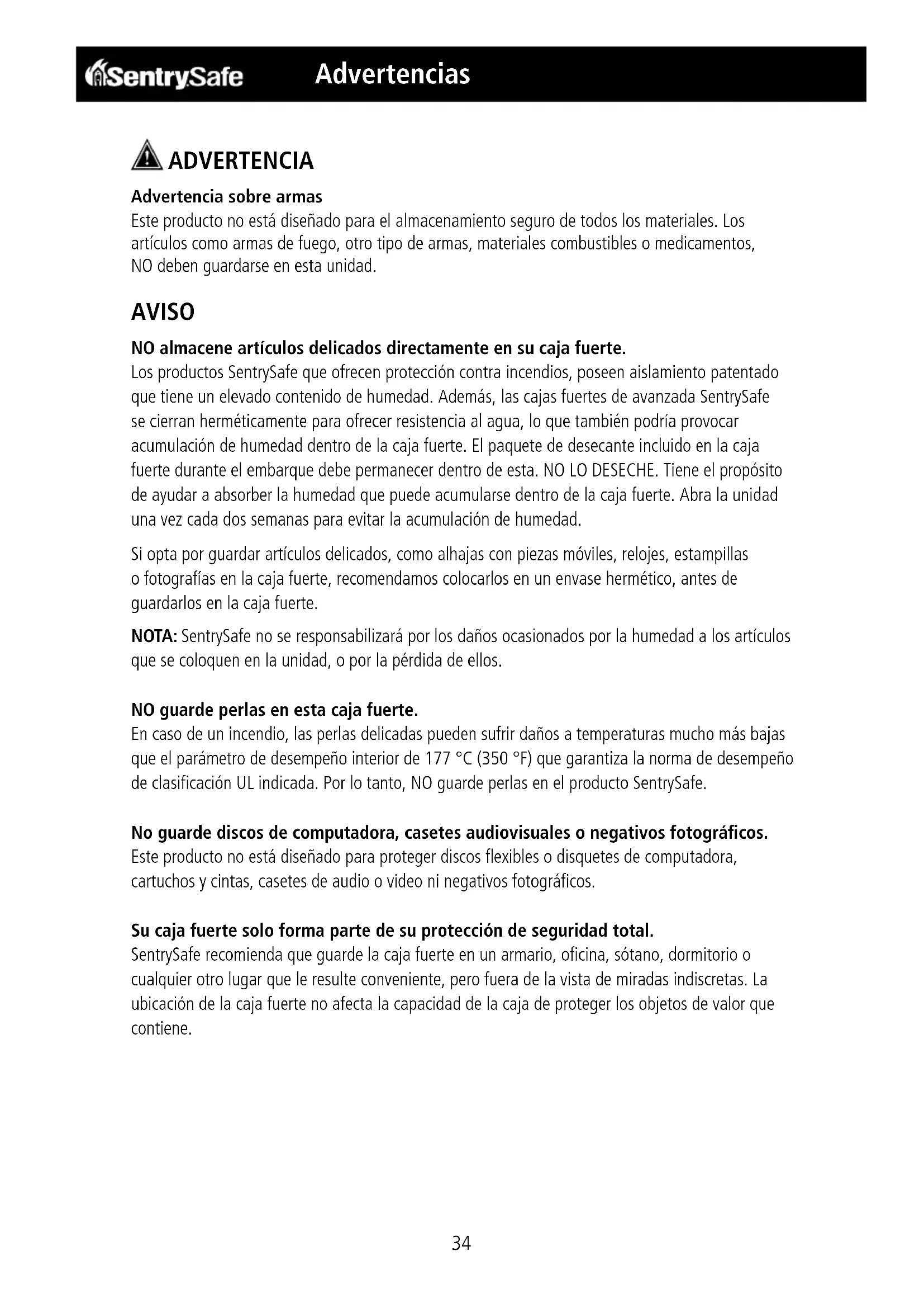 Advertencias ADVERTENCIA Advertencia sobre armas Este producto no está diseñado para el almacenamiento seguro de todos los materiales. Los artículos como armas de fuego, otro tipo de armas, materiales combustibles o medicamentos, NO deben guardarse en esta unidad. AVISO NO almacene artículos delicados directamente en su caja fuerte. Los productos SentrySafe que ofrecen protección contra incendios, poseen aislamiento patentado que tiene un elevado contenido de humedad. Además, las cajas fuertes de avanzada SentrySafe se cierran herméticamente para ofrecer resistencia al agua, lo que también podría provocar acumulación de humedad dentro de la caja fuerte. El paquete de desecante incluido en la caja fuerte durante el embarque debe permanecer dentro de esta. NO LO DESECHE. Tiene el propósito de ayudar a absorber la humedad que puede acumularse dentro de la caja fuerte. Abra la unidad una vez cada dos semanas para evitar la acumulación de humedad. Si opta por guardar artículos delicados, como alhajas con piezas móviles, relojes, estampillas o fotografías en la caja fuerte, recomendamos colocarlos en un envase hermético, antes de guardarlos en la caja fuerte. NOTA: SentrySafe no se responsabilizará por los daños ocasionados por la humedad a los artículos que se coloquen en la unidad, o por la pérdida de ellos. NO guarde perlas en esta caja fuerte. En caso de un incendio, las perlas delicadas pueden sufrir daños a temperaturas mucho más bajas que el parámetro de desempeño interior de 177°C (350 °F) que garantiza la norma de desempeño de clasificación UL indicada. Por lo tanto, NO guarde perlas en el producto SentrySafe. No guarde discos de computadora, casetes audiovisuales o negativos fotográficos. Este producto no está diseñado para proteger discos flexibles o disquetes de computadora, cartuchos y cintas, casetes de audio o video ni negativos fotográficos. Su caja fuerte solo forma parte de su protección de seguridad total. SentrySafe recomienda que guarde la caja fuerte en un armario, oficina, sótano, dormitorio o cualquier otro lugar que le resulte conveniente, pero fuera de la vista de miradas indiscretas. La ubicación de la caja fuerte no afecta la capacidad de la caja de proteger los objetos de valor que contiene.Español