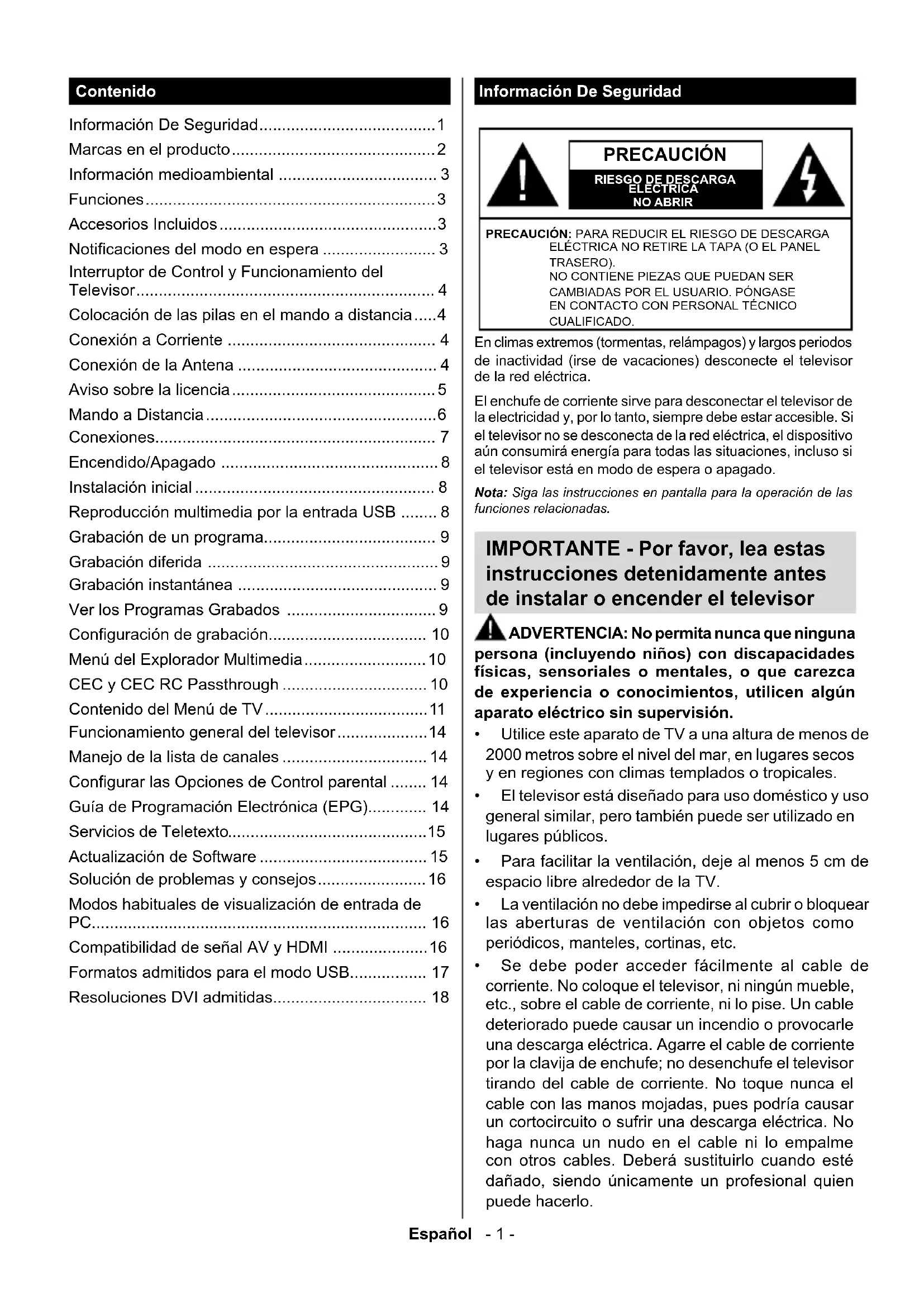 1920x1080 þEspañol - 1 - Información De Seguridad PRECAUCIÓN RIESGO DE DESCARGA ELÉCTRICANO ABRIRPRECAUCIÓN: PARA REDUCIR EL RIESGO DE DESCARGA ELÉCTRICA NO RETIRE LA TAPA (O EL PANEL TRASERO). NO CONTIENE PIEZAS QUE PUEDAN SER CAMBIADAS POR EL USUARIO. PÓNGASE EN CONTACTO CON PERSONAL TÉCNICO CUALIFICADO. Nota: Siga las instrucciones en pantalla para la operación de las funciones relacionadas. En climas extremos (tormentas, relámpagos) y largos periodos de inactividad (irse de vacaciones) desconecte el televisor de la red eléctrica. El enchufe de corriente sirve para desconectar el televisor de la electricidad y, por lo tanto, siempre debe estar accesible. Si el televisor no se desconecta de la red eléctrica, el dispositivo aún consumirá energía para todas las situaciones, incluso si el televisor está en modo de espera o apagado. IMPORTANTE - Por favor, lea estas instrucciones detenidamente antes de instalar o encender el televisor ADVERTENCIA: No permita nunca que ninguna persona (incluyendo niños) con discapacidades físicas, sensoriales o mentales, o que carezca de experiencia o conocimientos, utilicen algún aparato eléctrico sin supervisión.