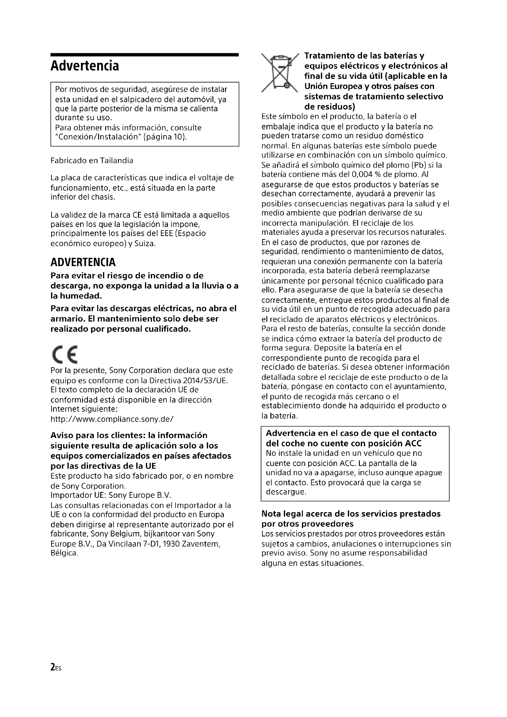 Halterung Halterung Sicherung (10 A)2ES Advertencia Fabricado en Tailandia La placa de características que indica el voltaje de funcionamiento, etc., está situada en la parte inferior del chasis. La validez de la marca CE está limitada a aquellos países en los que la legislación la impone, principalmente los países del EEE (Espacio económico europeo) y Suiza. ADVERTENCIA Para evitar el riesgo de incendio o de descarga, no exponga la unidad a la lluvia o a la humedad. Para evitar las descargas eléctricas, no abra el armario. El mantenimiento solo debe ser realizado por personal cualificado. Por la presente, Sony Corporation declara que este equipo es conforme con la Directiva 2014/53/UE. El texto completo de la declaración UE de conformidad está disponible en la dirección Internet siguiente: http://www.compliance.sony.de/ Aviso para los clientes: la información siguiente resulta de aplicación solo a los equipos comercializados en países afectados por las directivas de la UE Este producto ha sido fabricado por, o en nombre de Sony Corporation. Importador UE: Sony Europe B.V. Las consultas relacionadas con el Importador a la UE o con la conformidad del producto en Europa deben dirigirse al representante autorizado por el fabricante, Sony Belgium, bijkantoor van Sony Europe B.V., Da Vincilaan 7-D1, 1930 Zaventem, Bélgica. Tratamiento de las baterías y equipos eléctricos y electrónicos al final de su vida útil (aplicable en la Unión Europea y otros países con sistemas de tratamiento selectivo de residuos) Este símbolo en el producto, la batería o el embalaje indica que el producto y la batería no pueden tratarse como un residuo doméstico normal. En algunas baterías este símbolo puede utilizarse en combinación con un símbolo químico. Se añadirá el símbolo químico del plomo (Pb) si la batería contiene más del 0,004 % de plomo. Al asegurarse de que estos productos y baterías se desechan correctamente, ayudará a prevenir las posibles consecuencias negativas para la salud y el medio ambiente que podrían derivarse de su incorrecta manipulación. El reciclaje de los materiales ayuda a preservar los recursos naturales. En el caso de productos, que por razones de seguridad, rendimiento o mantenimiento de datos, requieran una conexión permanente con la batería incorporada, esta batería deberá reemplazarse únicamente por personal técnico cualificado para ello. Para asegurarse de que la batería se desecha correctamente, entregue estos productos al final de su vida útil en un punto de recogida adecuado para el reciclado de aparatos eléctricos y electrónicos. Para el resto de baterías, consulte la sección donde se indica cómo extraer la batería del producto de forma segura. Deposite la batería en el correspondiente punto de recogida para el reciclado de baterías. Si desea obtener información detallada sobre el reciclaje de este producto o de la batería, póngase en contacto con el ayuntamiento, el punto de recogida más cercano o el establecimiento donde ha adquirido el producto o la batería. Nota legal acerca de los servicios prestados por otros proveedores Los servicios prestados por otros proveedores están sujetos a cambios, anulaciones o interrupciones sin previo aviso. Sony no asume responsabilidad alguna en estas situaciones. Por motivos de seguridad, asegúrese de instalar esta unidad en el salpicadero del automóvil, ya que la parte posterior de la misma se calienta durante su uso. Para obtener más información, consulte “Conexión/Instalación” (página 10). Advertencia en el caso de que el contacto del coche no cuente con posición ACC No instale la unidad en un vehículo que no cuente con posición ACC. La pantalla de la unidad no va a apagarse, incluso aunque apague el contacto. Esto provocará que la carga se descargue.3ES Precaución SONY NO SE HACE RESPONSABLE EN NINGÚN CASO DE DAÑOS ACCIDENTALES, INDIRECTOS, COLATERALES O DE OTRO TIPO, LO QUE INCLUYE, A TÍTULO MERAMENTE ENUNCIATIVO, LA PÉRDIDA DE BENEFICIOS, LA PÉRDIDA DE INGRESOS, LA PÉRDIDA DE DATOS, LA IMPOSIBILIDAD DE UTILIZAR EL PRODUCTO O EQUIPOS ASOCIADOS, EL TIEMPO DE INACTIVIDAD O EL TIEMPO DEL COMPRADOR EN RELACIÓN CON LA UTILIZACIÓN DE ESTE PRODUCTO, SU HARDWARE Y/O SU SOFTWARE. Tenga en cuenta que este producto incluye un transmisor de radio. Según la norma 10 de UNECE, un fabricante de un vehículo puede imponer condiciones específicas para la instalación de transmisores de radio en los vehículos. Consulte el manual de instrucciones de su vehículo o póngase en contacto con el concesionario de su vehículo antes de instalar este producto en su vehículo. Llamadas de emergencia Este sistema manos libres para vehículo BLUETOOTH y el dispositivo electrónico conectado al mismo funcionan mediante señales de radio, redes de telefonía móvil y redes terrestres, así como a través de funciones programadas por el usuario, por lo que la conexión no está garantizada en todas las condiciones. Por tanto, no confíe exclusivamente en un solo dispositivo electrónico para las comunicaciones importantes (como las emergencias médicas). Acerca de la comunicación BLUETOOTH