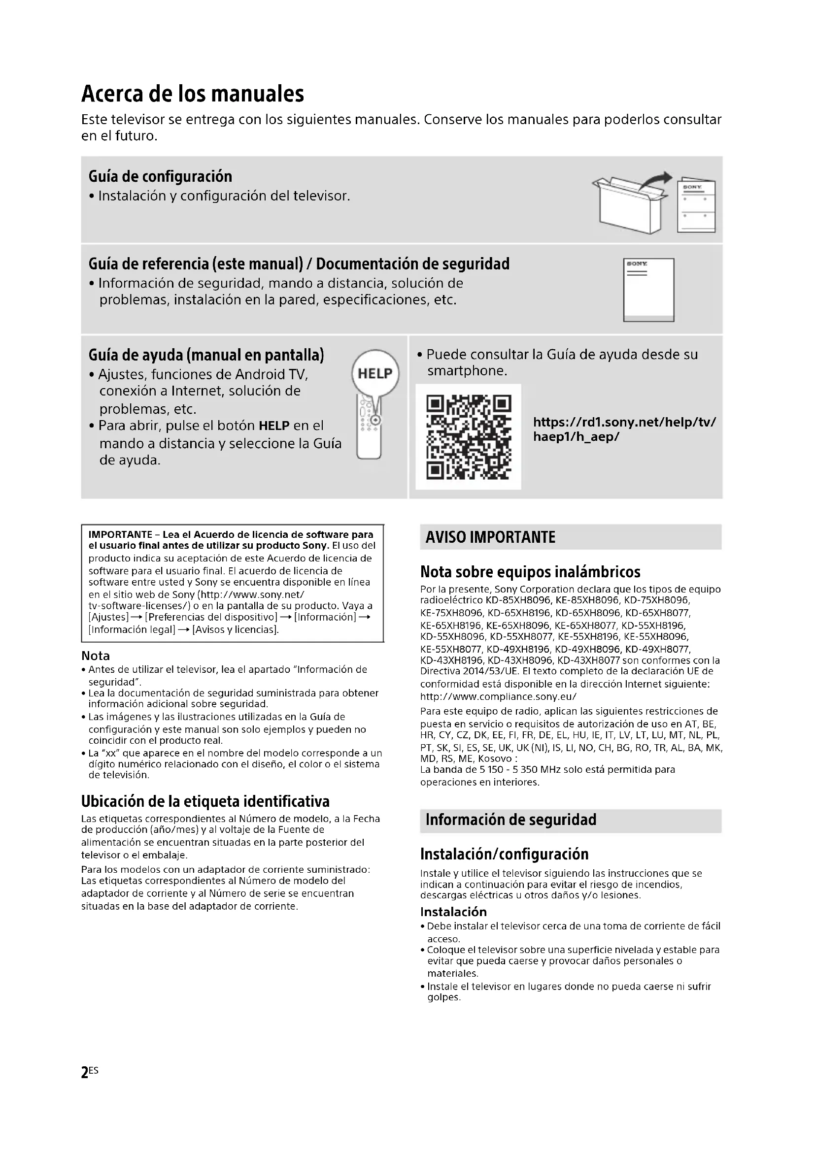- Puede consultar la Guía de ayuda desde su smartphone. https://rd1.sony.net/help/tv/ haep1/h_aep/ IMPORTANTE – Lea el Acuerdo de licencia de software para el usuario final antes de utilizar su producto Sony. El uso del producto indica su aceptación de este Acuerdo de licencia de software para el usuario final. El acuerdo de licencia de software entre usted y Sony se encuentra disponible en línea en el sitio web de Sony (http://www.sony.net/ tv-software-licenses/) o en la pantalla de su producto. Vaya a [Ajustes] [Preferencias del dispositivo] [Información] [Información legal] [Avisos y licencias]. AVISO IMPORTANTE Información de seguridad3