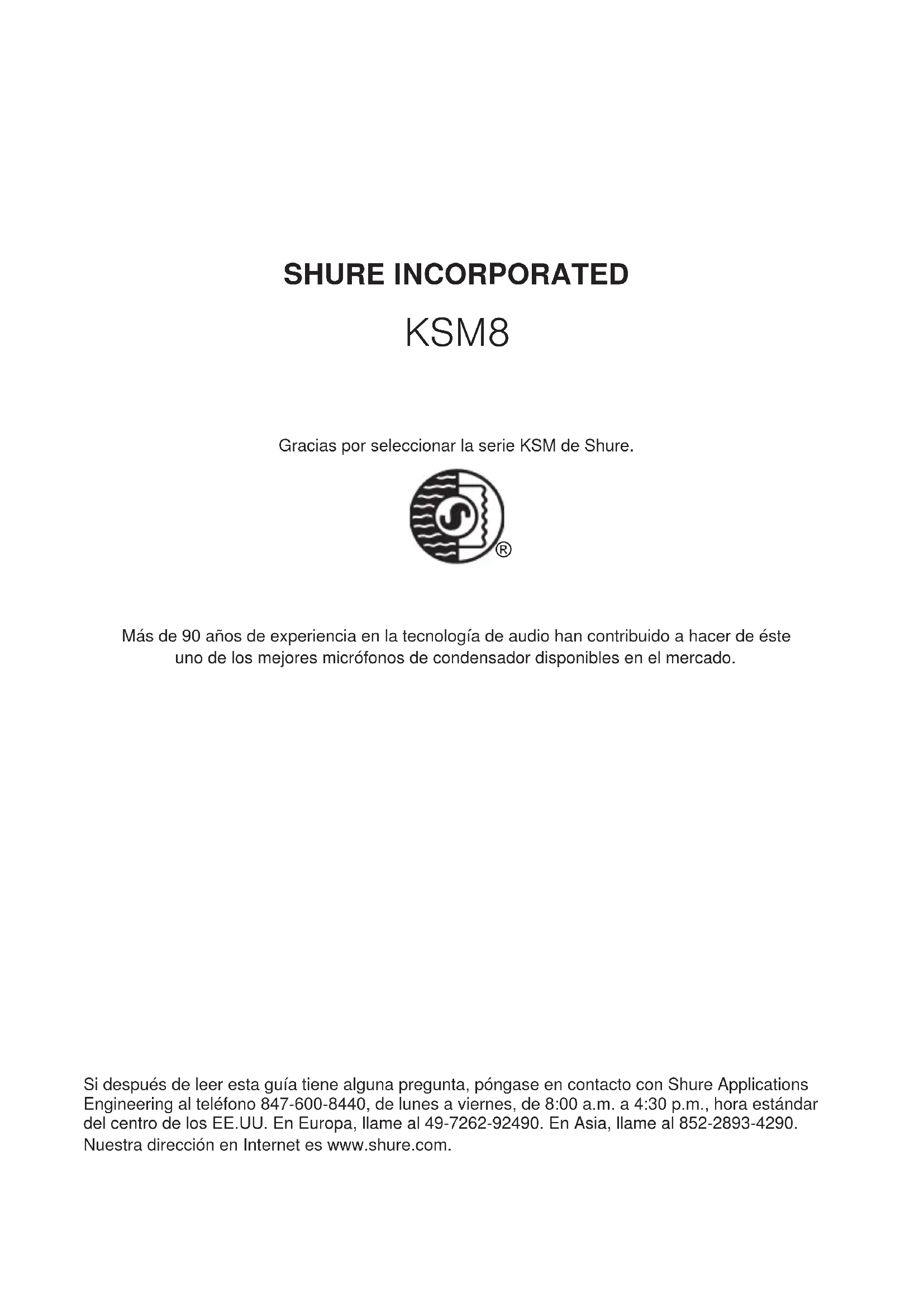Más de 90 años de experiencia en la tecnología de audio han contribuido a hacer de éste uno de los mejores micrófonos de condensador disponibles en el mercado. Si después de leer esta guía tiene alguna pregunta, póngase en contacto con Shure Applications Engineering al teléfono 847-600-8440, de lunes a viernes, de 8:00 a.m. a 4:30 p.m., hora estándar del centro de los EE.UU. En Europa, llame al 49-7262-92490. En Asia, llame al 852-2893-4290. Nuestra dirección en Internet es www.shure.com.20 Micrófono KSM8 Dualdyne™ Descripción general El micrófono Shure KSM8 Dualdyne™ es el primer micrófono dinámico de mano con dos diafragmas, diseñado para reproducción de voz en entornos de sonido en vivo y en estudios. Shure ha tomado la tecnología y rendimiento de los micrófonos dinámicos y los ha elevado a un nivel nuevo y revolucionario con el desarrollo del micrófono KSM8 Dualdyne. Con un nivel de salida mucho más elevado y un efecto de proximidad reducido a niveles inigualables, el micrófono entrega una señal limpia y sumamente detallada, con niveles mínimos de realimentación. Gracias a avanzados procesos de producción y componentes de calidad superior, cada KSM8 Dualdyne se fabrica y se prueba meticulosamente para mantener las normas de calidad de categoría mundial de Shure, aún en los entornos de sonido en vivo más exigentes. Variaciones de modelos El micrófono KSM8 se ofrece con acabado en negro y en níquel cepillado. También puede adquirirse como parte de un sistema inalámbrico Shure, o para mejorar un transmisor inalámbrico existente. KSM8/B: Micrófono dinámico con dos diafragmas de calidad superior con acabado en negro. KSM8/N: Micrófono dinámico con dos diafragmas de calidad superior con acabado en níquel cepillado. Características La cápsula con dos diafragmas entrega una mayor consistencia a través del espectro de frecuencias con las variaciones en la distancia entre el micrófono y la fuente. Esta tecnología revolucionaria ofrece los beneficios siguientes: