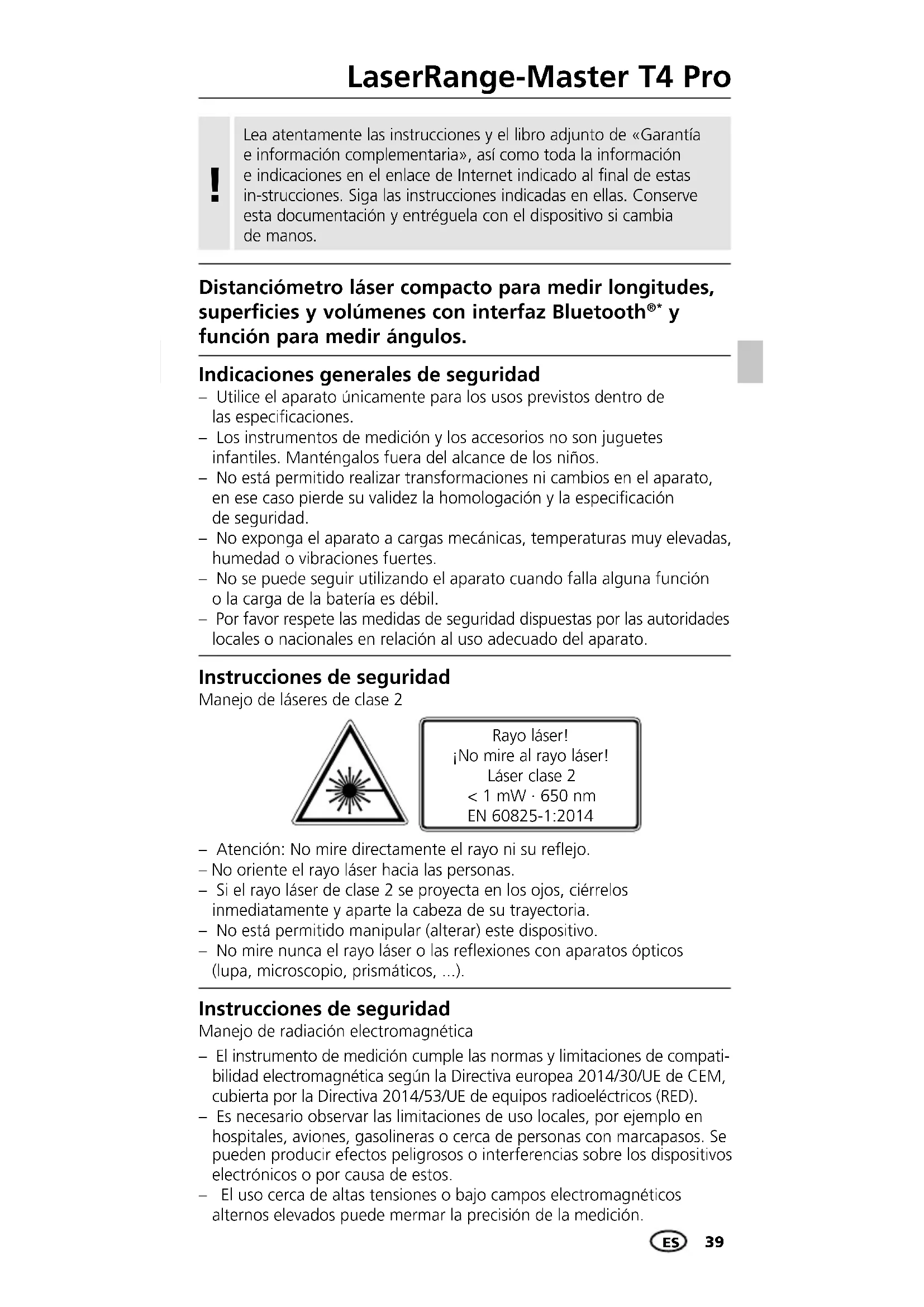 Indicaciones generales de seguridad – Utilice el aparato únicamente para los usos previstos dentro de las especicaciones. – Los instrumentos de medición y los accesorios no son juguetes infantiles. Manténgalos fuera del alcance de los niños. – No está permitido realizar transformaciones ni cambios en el aparato, en ese caso pierde su validez la homologación y la especicación de seguridad. – No exponga el aparato a cargas mecánicas, temperaturas muy elevadas, humedad o vibraciones fuertes. – No se puede seguir utilizando el aparato cuando falla alguna función o la carga de la batería es débil. – Por favor respete las medidas de seguridad dispuestas por las autoridades locales o nacionales en relación al uso adecuado del aparato. – Atención: No mire directamente el rayo ni su reejo. – No oriente el rayo láser hacia las personas. – Si el rayo láser de clase 2 se proyecta en los ojos, ciérrelos inmediatamente y aparte la cabeza de su trayectoria. – No está permitido manipular (alterar) este dispositivo. – No mire nunca el rayo láser o las reexiones con aparatos ópticos (lupa, microscopio, prismáticos, ...). Instrucciones de seguridad Manejo de láseres de clase 2 Rayo láser! ¡No mire al rayo láser! Láser clase 2 < 1 mW · 650 nm EN 60825-1:2014 Instrucciones de seguridad Manejo de radiación electromagnética – El instrumento de medición cumple las normas y limitaciones de compati- bilidad electromagnética según la Directiva europea 2014/30/UE de CEM, cubierta por la Directiva 2014/53/UE de equipos radioeléctricos (RED). – Es necesario observar las limitaciones de uso locales, por ejemplo en hospitales, aviones, gasolineras o cerca de personas con marcapasos. Se pueden producir efectos peligrosos o interferencias sobre los dispositivos electrónicos o por causa de estos. – El uso cerca de altas tensiones o bajo campos electromagnéticos alternos elevados puede mermar la precisión de la medición.40