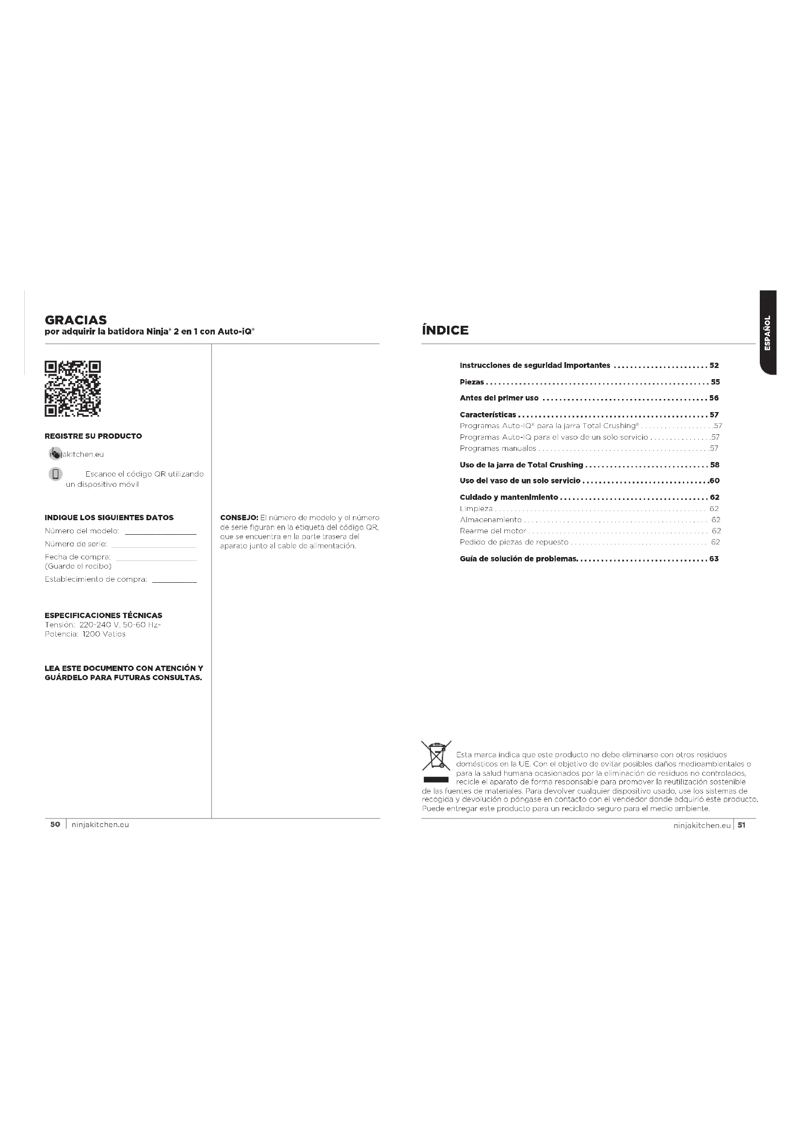 - ninjakitchen.euÍNDICE GRACIAS por adquirir la batidora Ninja® 2 en 1 con Auto-iQ® Instrucciones de seguridad importantes 52 Piezas 55 Antes del primer uso 56 Características 57 Programas Auto-IQ® para la jarra Total Crushing® p. 57