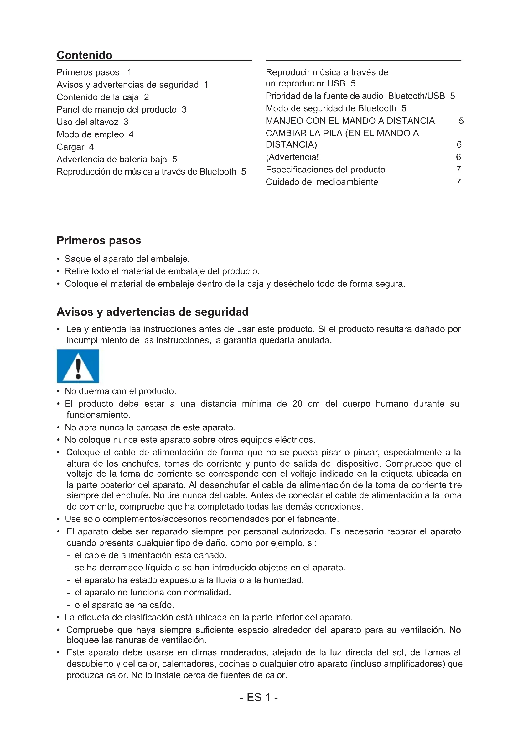 produzca calor. No lo instale cerca de fuentes de calor. Primeros pasos 1 Avisos y advertencias de seguridad 1 Contenido de la caja 2 Panel de manejo del producto 3 Uso del altavoz 3 Modo de empleo 4 Cargar 4 Advertencia de batería baja 5 Reproducción de música a través de Bluetooth 5 Reproducir música a través de un reproductor USB 5 Prioridad de la fuente de audio: Bluetooth/USB 5 Modo de seguridad de Bluetooth 5