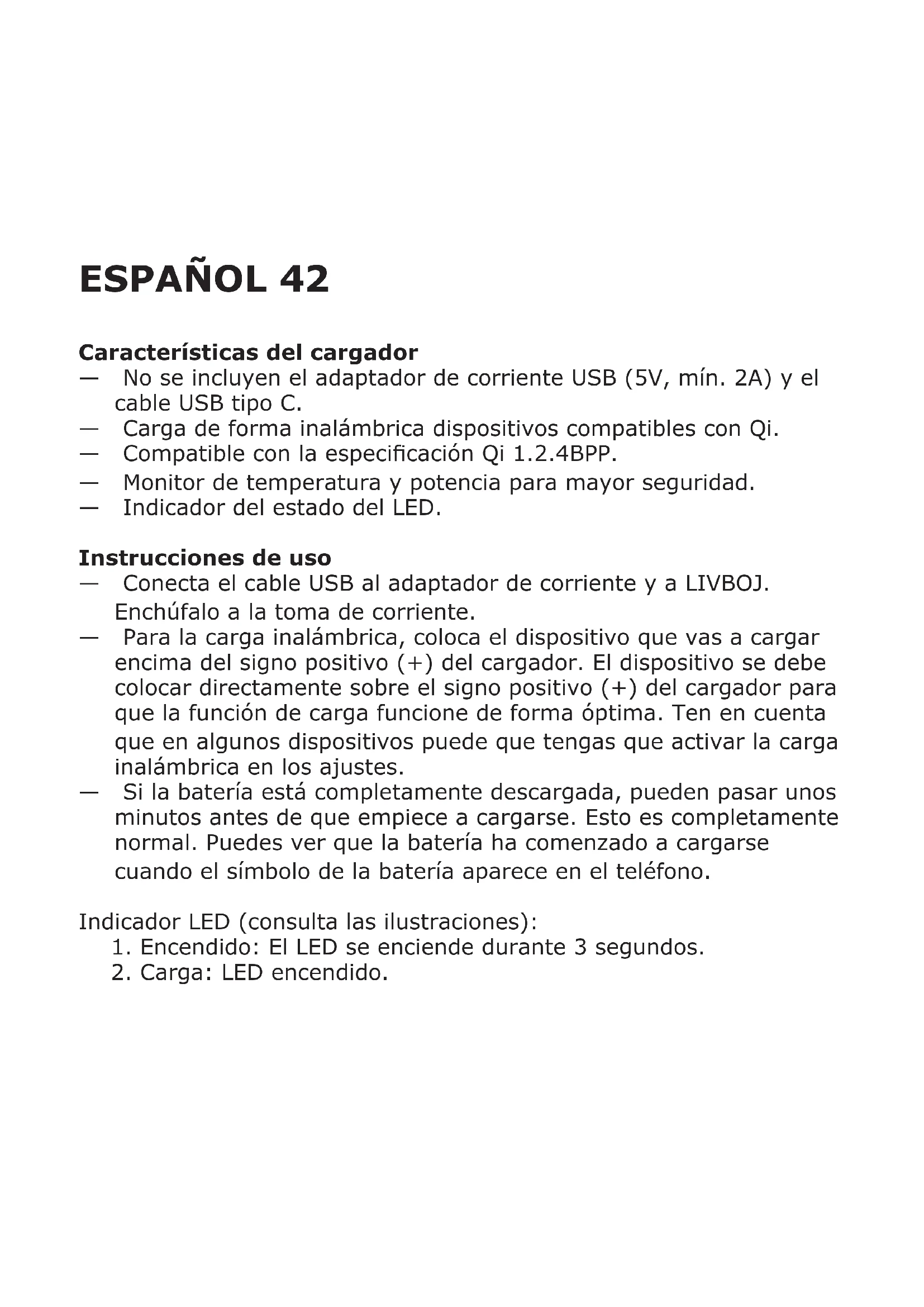 No te olvides de esto — La longitud y la calidad del cable USB inuyen en la velocidad de carga y el rendimiento. — Los dispositivos se pueden calentar durante la carga; esto es completamente normal. Se enfriarán progresivamente de nuevo cuando estén completamente cargados. — El tiempo de carga puede variar en función de la capacidad de la batería del dispositivo, el nivel de carga, la antigüedad de la batería y la temperatura del entorno. — Temperatura de almacenamiento del cargador: de -20 a 25 °C. — Temperatura de funcionamiento del cargador: de 0 a 40 ° C. Desenchufa el cargador de la fuente de alimentación antes de limpiarlo y cuando no esté en uso. Para limpiar el cargador, pasa un paño húmedo. Nunca sumerjas el cargador en agua. En la parte trasera del cargador puedes consultar las medidas de precaución recomendadas y los datos técnicos. Guarda estas instrucciones para consultarlas más adelante.44 ADVERTENCIA: — Carga únicamente dispositivos compatibles con Qi. — La toma de corriente debe estar cerca del equipo y ser de fácil acceso. — Utilízalo solo en lugares secos. — Los niños deberían estar supervisados para asegurarse de que no jueguen con el producto. — Nunca uses un cable USB defectuoso o dañado para cargar, ya que esto puede dañar el aparato y tu dispositivo. Mantenimiento del producto No intentes reparar el producto por tu cuenta, ya que al abrir y cerrar las tapas puedes quedar expuesto a puntos de alta tensión y otros peligros.