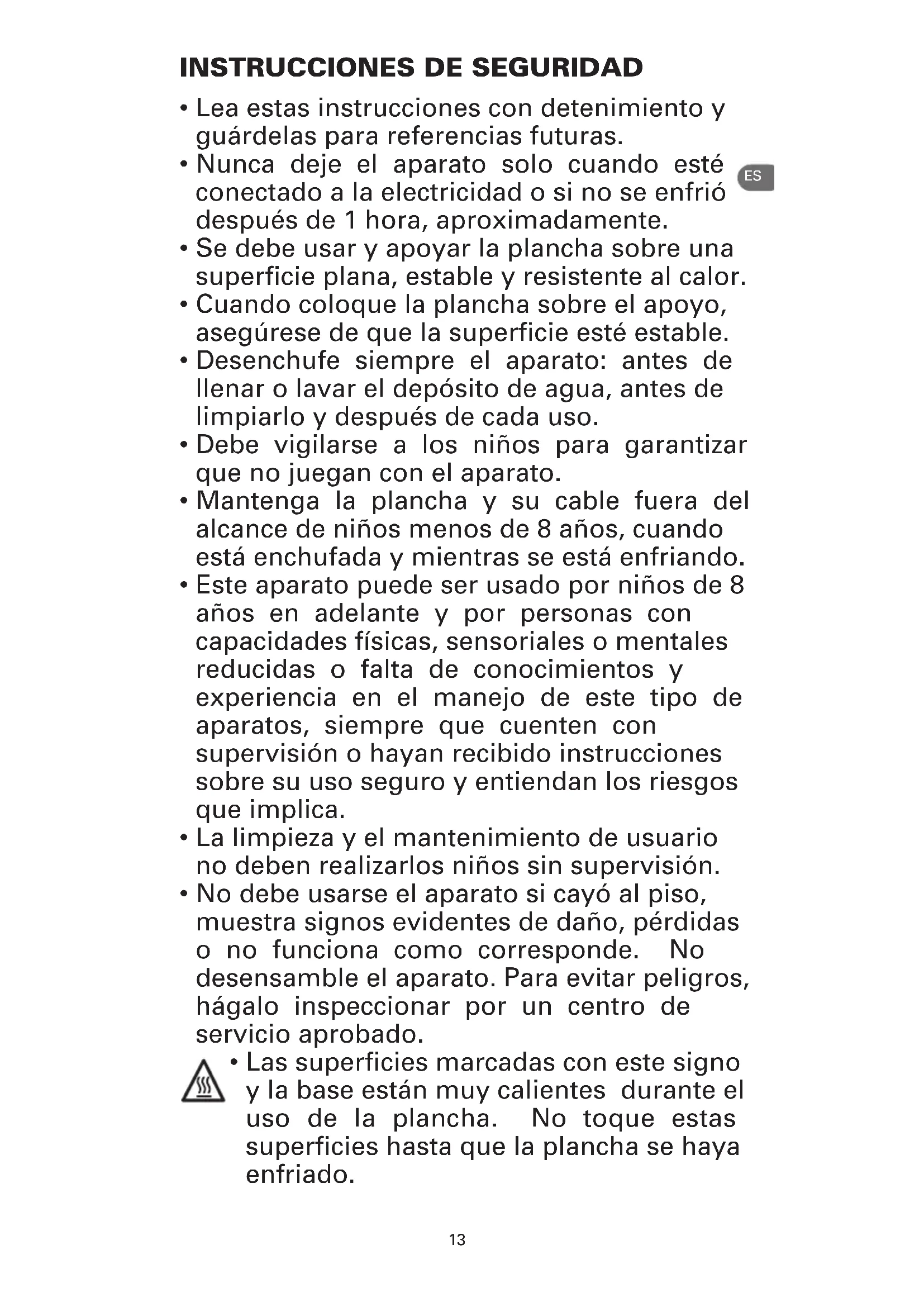 - Mantenga la plancha y su cable fuera del alcance de niños menos de 8 años, cuando está enchufada y mientras se está enfriando.