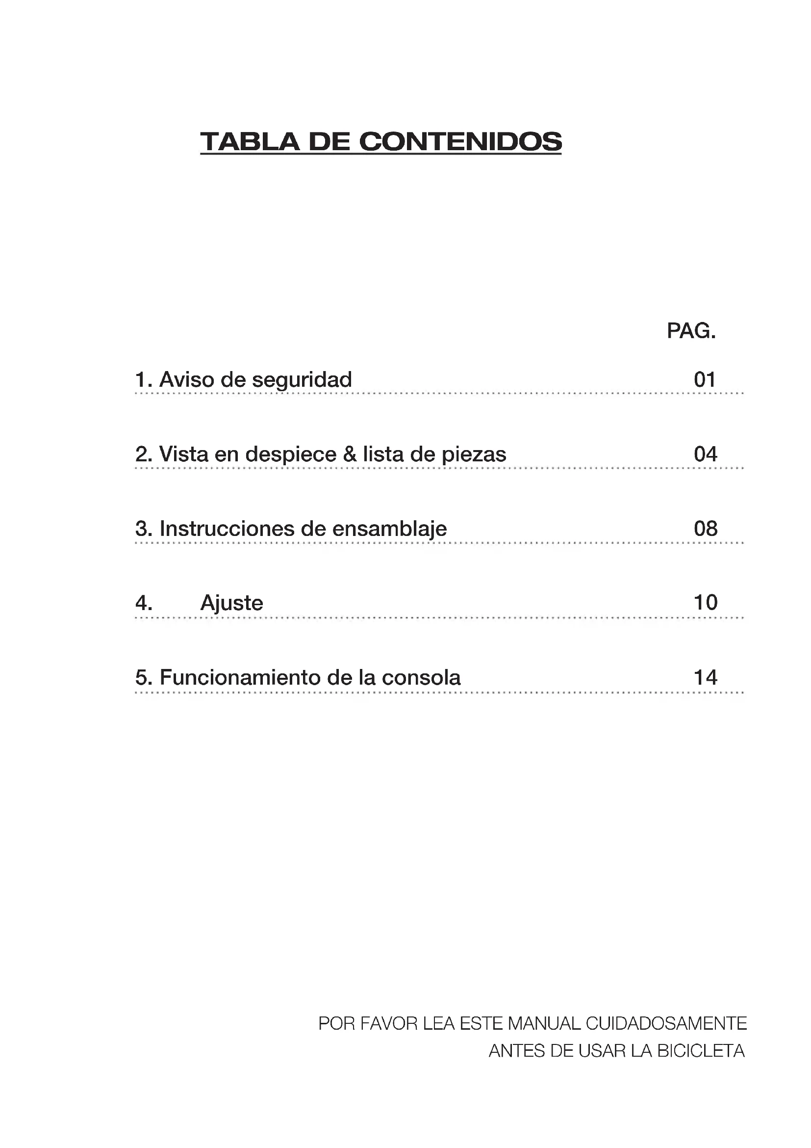 componentes que son más susceptibles de desgaste, i.e. puntos de conexión y ruedas. Los componentes defectuosos deben reemplazarse inmediatamente. El nivel de seguridad de este equipo solo puede mantenerse haciendo esto. Por favor no use la bicicleta hasta que esté bien reparada.PRECAUCIÓN: ANTES DE COMENZAR ESTE O CUAL-