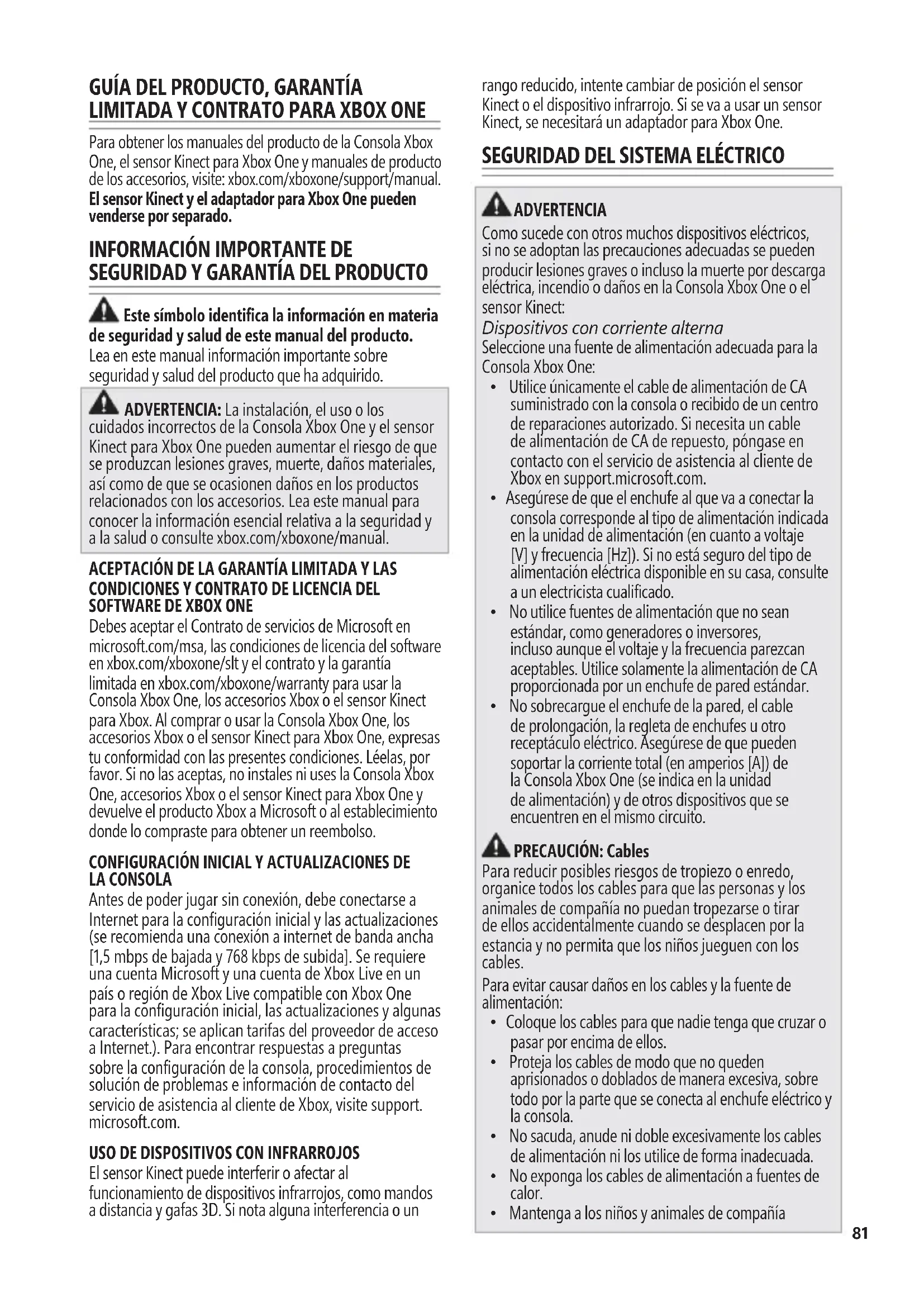 Para obtener los manuales del producto de la Consola Xbox One, el sensor Kinect para Xbox One y manuales de producto de los accesorios, visite: xbox.com/xboxone/support/manual. El sensor Kinect y el adaptador para Xbox One pueden venderse por separado.
