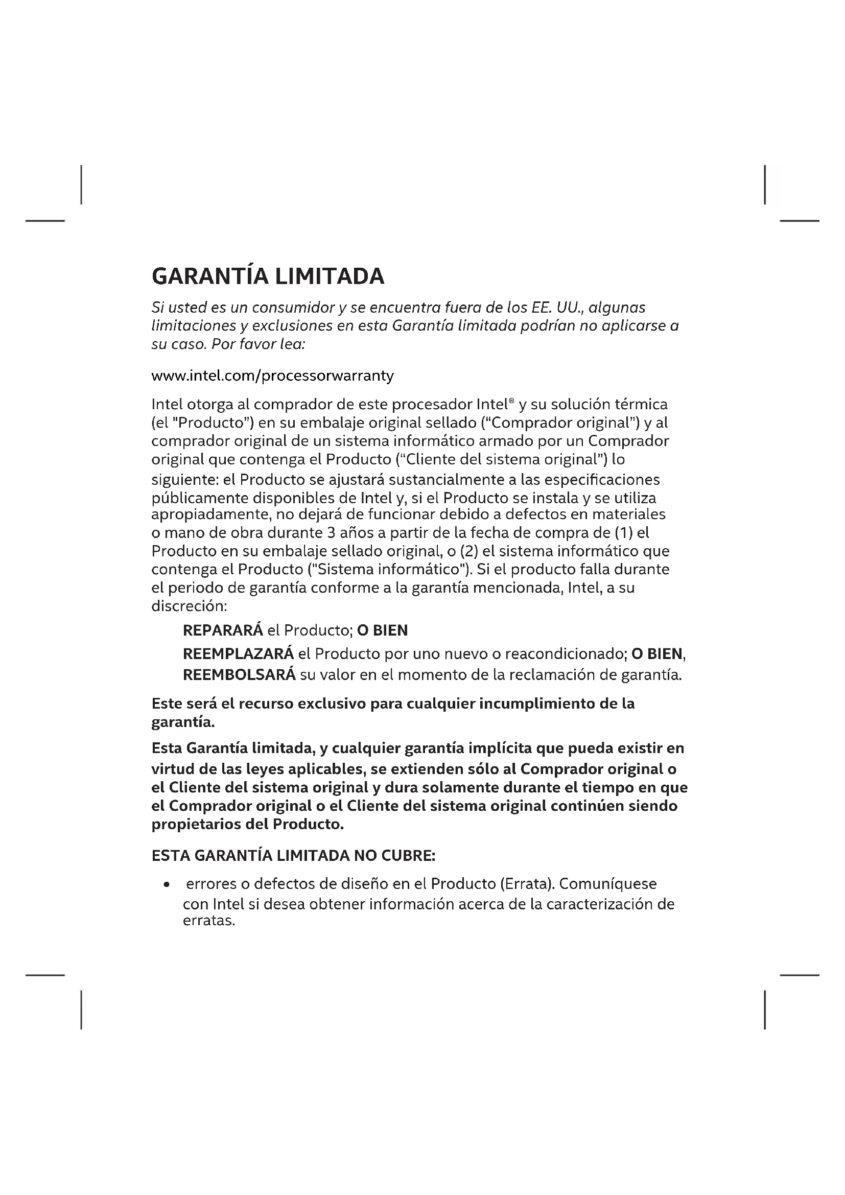La responsabilidad de Intel con respecto a esta garantía o a cualquier otra, ya sea implícita o explícita, está limitada a la reparación, el reemplazo o el reembolso. Estos remedios son los remedios únicos y exclusivos para cualquier incumplimiento de la garantía. En el máximo grado en que lo permita la ley, Intel no es responsable de los daños directos, especiales, incidentales o consiguientes que ocurran como consecuencia del incumplimiento de una garantía o en virtud de cualquier otra teoría legal (que puede incluir, sin limitación, pérdida de ganancias, tiempo de inactividad, reputación, daño o reemplazo de equipos y bienes y cualquier costo relacionado con la recuperación, reprogramación o reproducción de cualquier programa o de datos almacenados o utilizados en un Sistema informático), incluso si Intel ha sido informado de la posibilidad de que existan estos daños.Algunos estados (o jurisdicciones) no permiten la exclusión o limitación de daños incidentales o consiguientes, y por lo tanto, la limitación o exclusión anterior podría no aplicarse a su caso. Esta garantía le da derechos legales especícos y es posible que tenga otros derechos que varían de un estado a otro o según la jurisdicción. Las partes acuerdan que se excluya de forma expresa la aplicación de la Convención de las Naciones Unidas sobre Contratos para la Venta Internacional de Mercancías (1980) y que no se la aplique a este Acuerdo. Cualquier disputa que surja en virtud de o en relación con esta Garantía limitada será adjudicada a los siguientes foros y se regirá por las siguientes leyes (excepto en China continental), sin referencia a las disposiciones sobre leyes en conicto: para los EE. UU. y el resto de las Américas, el foro exclusivo serán los tribunales del Estado de Delaware, EE. UU. o los tribunales federales con sede en ese Estado, y la ley aplicable será la del Estado de Delaware. Para la región del Pacíco Asiático, el foro exclusivo será Singapur y la legislación pertinente será la de Singapur. Para Japón, el foro exclusivo será Tokio y la ley aplicable será la de Japón. Para Europa y el resto del mundo, el foro exclusivo será Londres y la ley aplicable será la de Inglaterra y Gales. Si alguna versión traducida de esta Garantía limitada entra en conicto con esta versión en inglés, la versión en inglés prevalecerá (excepto por la versión en chino simplicado).GARANTIE LIMITÉE Si vous êtes un consommateur situé à l'extérieur des États-Unis, certaines restrictions et exclusions dans cette garantie limitée ne s'appliquent pas à vous ; veuillez lire : www.intel.com/processorwarranty Intel garantit ce qui suit à l'acheteur de ce processeur Intel® et de sa solution thermique (le « Produit ») dans son emballage d'origine scellé (l'« Acheteur original ») et à l'acheteur original d'un système informatique construit par un Acheteur original contenant le Produit (le « Client du système original ») : que le produit sera substantiellement conforme aux spécications publiées par Intel, et que, si le produit est correctement utilisé et installé, il ne cessera pas de fonctionner en raison de défauts de matériaux et de fabrication pendant une durée de 3 ans à compter de la date d'achat de (1) le Produit dans son emballage d'origine, ou (2) le système informatique contenant le Produit (le « Système informatique »). Si le Produit n'est pas conforme à la garantie ci-dessus pendant la durée de la période de garantie, Intel, à sa discrétion, choisira : de RÉPARER le Produit ; OU de le REMPLACER par un Produit neuf ou reconditionné ; OU encore d'en REMBOURSER la valeur à la date de la demande d'application de la garantie. Ce sera là le recours exclusif pour tout manquement à la garantie. Cette Garantie limitée et toute garantie implicite pouvant exister en vertu du droit applicable, ne s'étendra qu'à l'Acheteur original ou au Client du système original et durera aussi longtemps que l'Acheteur original ou le Client du système original possèdera le Produit. DE PLUS, LA PRÉSENTE GARANTIE LIMITÉE NE COUVRE PAS :