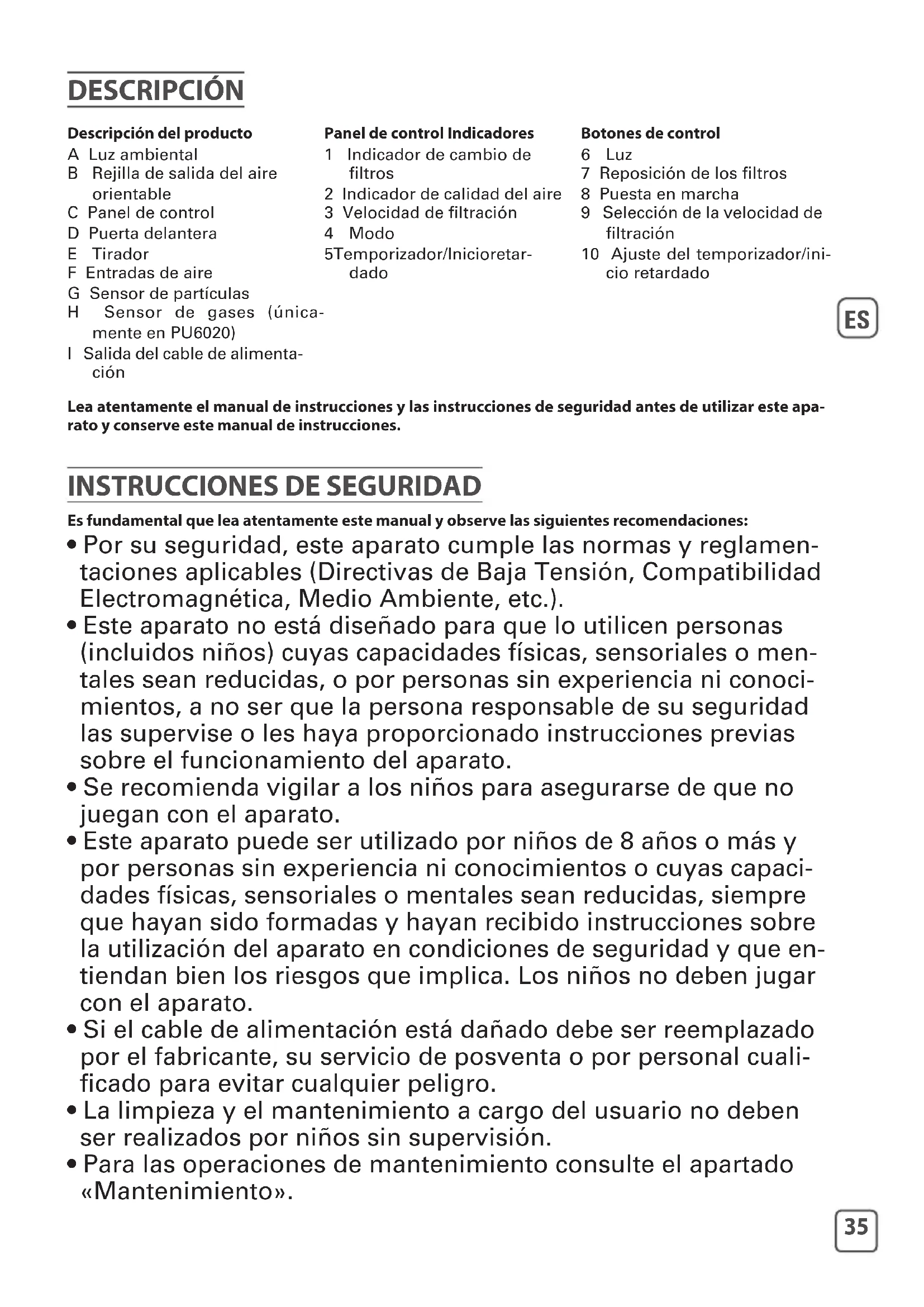 DESCRIPCIÓN Descripción del producto A Luz ambiental B Rejilla de salida del aire orientable C Panel de control D Puerta delantera E Tirador F Entradas de aire G Sensor de partículas H Sensor de gases (única- mente en PU6020) I Salida del cable de alimenta- ción Panel de control Indicadores 1 Indicador de cambio de filtros 2 Indicador de calidad del aire 3 Velocidad de filtración 4 Modo 5 Temporizador/Inicio retar- dado Botones de control 6 Luz 7 Reposición de los filtros 8 Puesta en marcha 9 Selección de la velocidad de filtración 10 Ajuste del temporizador/ini- cio retardado Lea atentamente el manual de instrucciones y las instrucciones de seguridad antes de utilizar este apa- rato y conserve este manual de instrucciones.