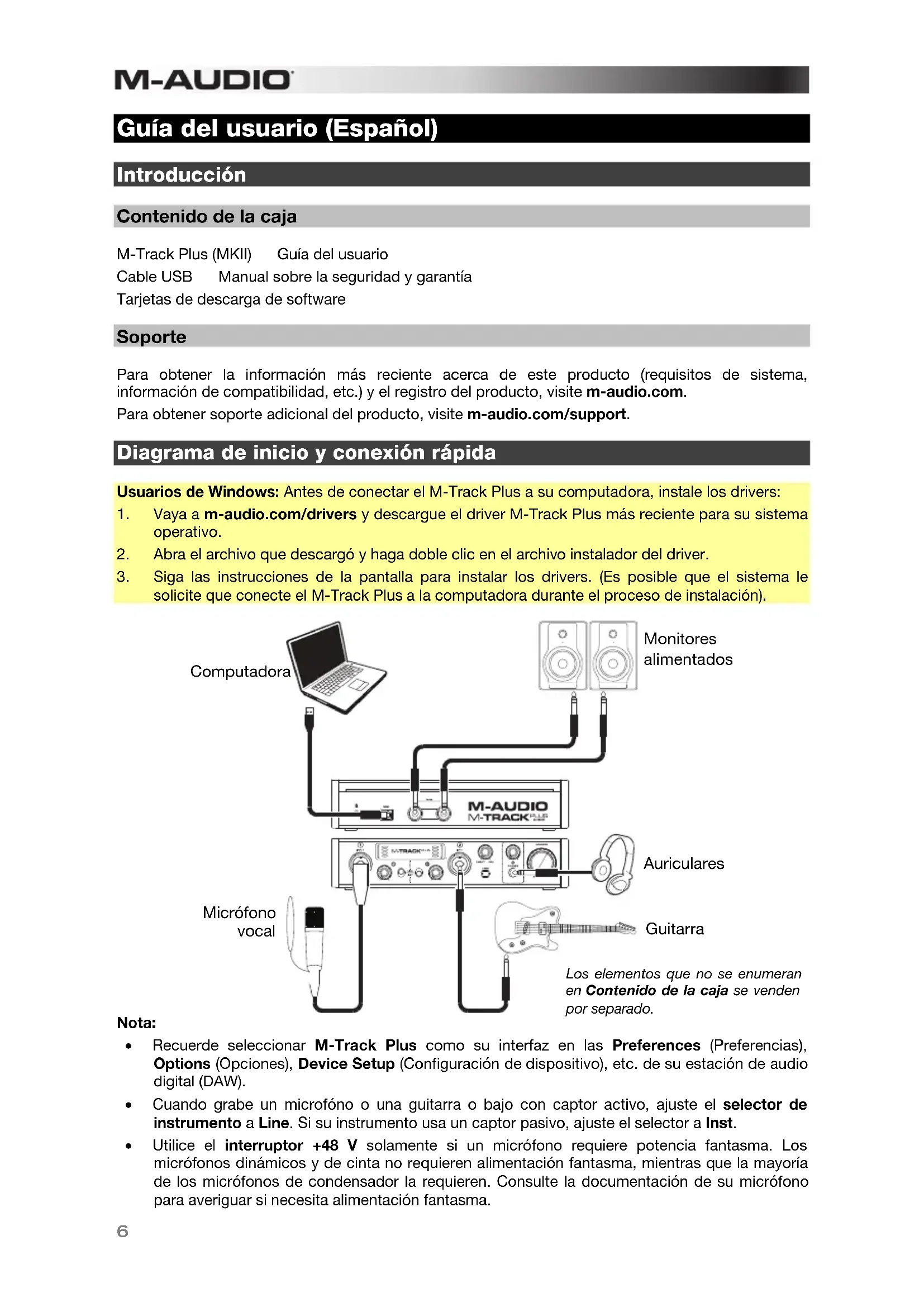 Guía del usuario (Español) Introducción Contenido de la caja M-Track Plus (MKII) Guía del usuario Cable USB Manual sobre la seguridad y garantía Tarjetas de descarga de software Soporte Para obtener la información más reciente acerca de este producto (requisitos de sistema, información de compatibilidad, etc.) y el registro del producto, visite m-audio.com. Para obtener soporte adicional del producto, visite m-audio.com/support. Diagrama de inicio y conexión rápida Usuarios de Windows: Antes de conectar el M-Track Plus a su computadora, instale los drivers: