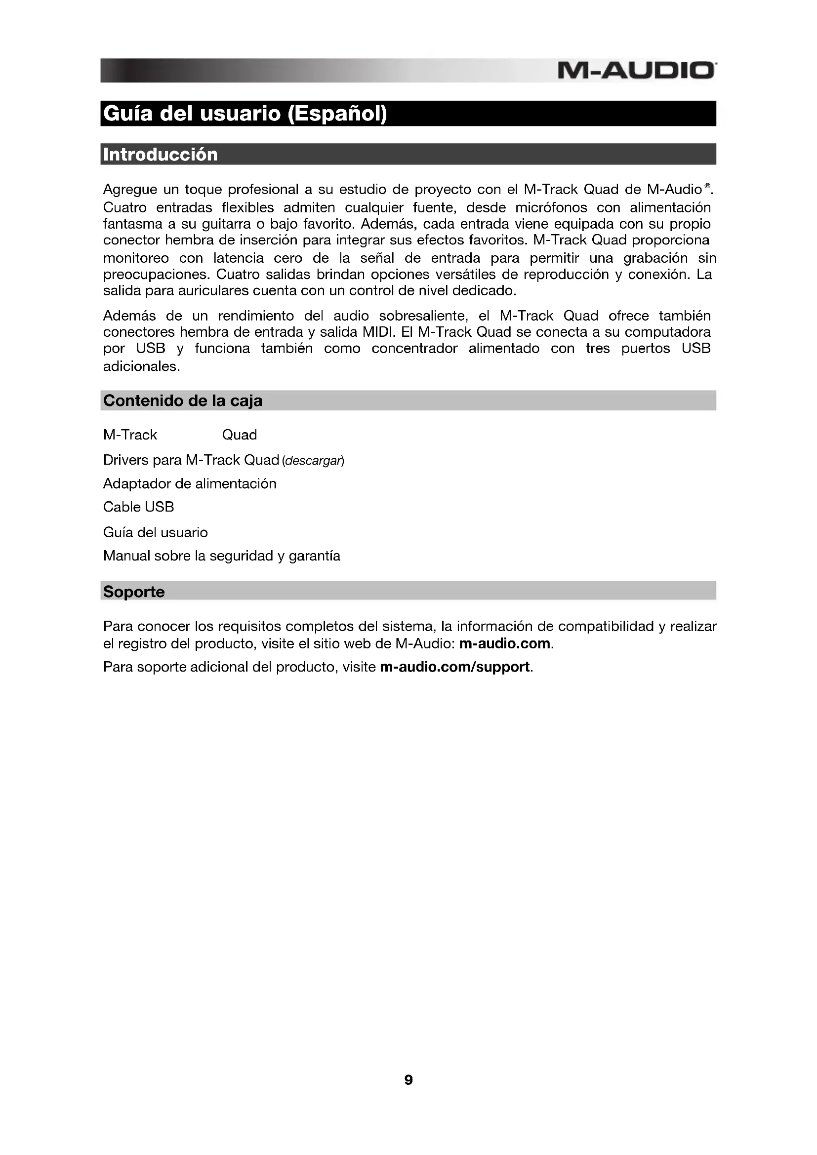 Cuatro entradas flexibles admiten cualquier fuente, desde micrófonos con alimentación fantasma a su guitarra o bajo favorito. Además, cada entrada viene equipada con su propio conector hembra de inserción para integrar sus efectos favoritos. M-Track Quad proporciona monitoreo con latencia cero de la señal de entrada para permitir una grabación sin preocupaciones. Cuatro salidas brindan opciones versátiles de reproducción y conexión. La salida para auriculares cuenta con un control de nivel dedicado. Además de un rendimiento del audio sobresaliente, el M-Track Quad ofrece también conectores hembra de entrada y salida MIDI. El M-Track Quad se conecta a su computadora por USB y funciona también como concentrador alimentado con tres puertos USB adicionales. Contenido de la caja M-Track Quad Drivers para M-Track Quad (descargar) Adaptador de alimentación Cable USB Guía del usuario Manual sobre la seguridad y garantía Soporte Para conocer los requisitos completos del sistema, la información de compatibilidad y realizar el registro del producto, visite el sitio web de M-Audio: m-audio.com. Para soporte adicional del producto, visite m-audio.com/support.10
