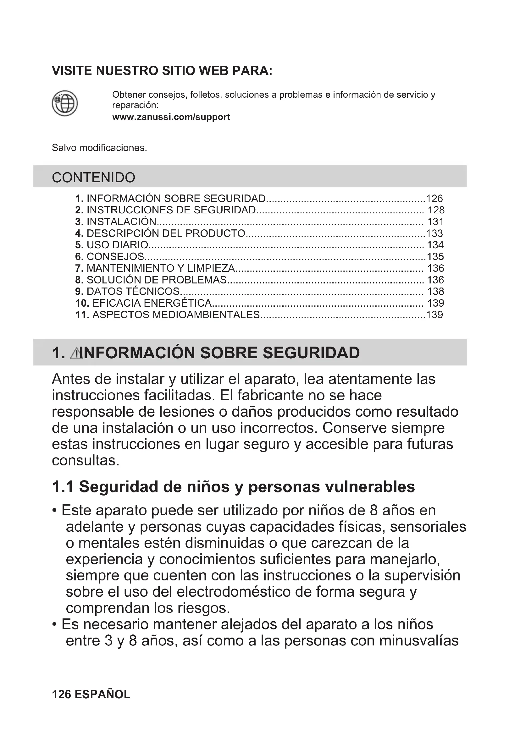 Recicle los materiales con el símbolo . Coloque el material de embalaje en los contenedores adecuados para su reciclaje. Ayude a proteger el medio ambiente y la salud pública, así como a reciclar residuos de aparatos eléctricos y electrónicos. No deseche los aparatos marcados con el símbolo junto con los residuos domésticos. Lleve el producto a su centro de reciclaje local o póngase en contacto con su oficina municipal. ESPAÑOL 139BESÖK VÅR WEBBPLATS FÖR ATT: Få tips om användning, broschyrer, felsökning, service- och reparationsinformation:www.zanussi.com/supportMed reservation för ändringar. INNEHÅLL
