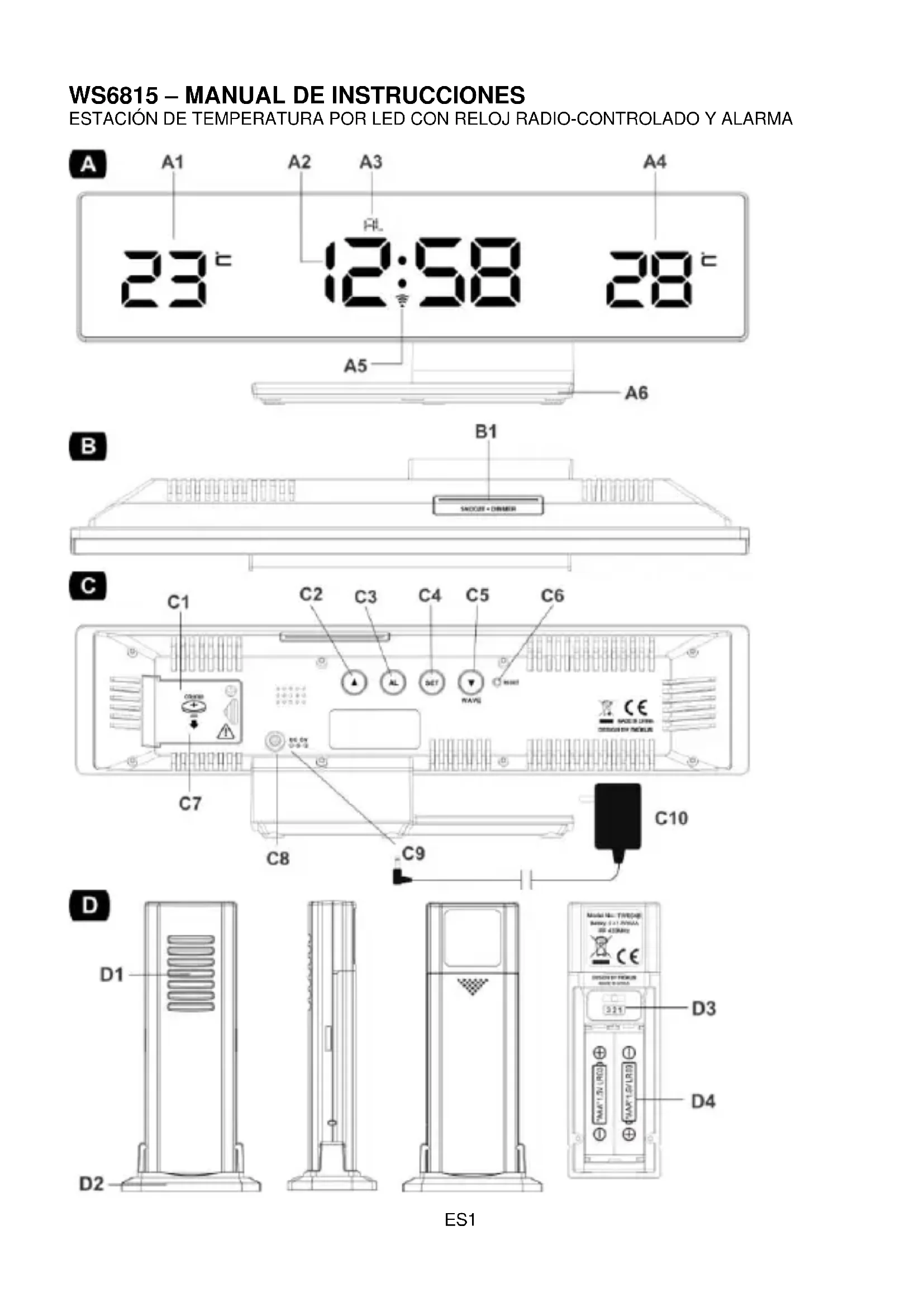 A - Vista frontal A1: temperatura interior A2: tiempo A3: Alarma ON A4: Temperatura exterior A5: indicador RCC A6: soporte B- Vista superior B1: botón SNOOZE / DIMMER C - Vista posterior C1: Tapa de la batería C2: Botón ARRIBA C3: botón de ALARMA C4: botón de AJUSTE C5: Botón DOWN / WAVE C6: Botón RESET C7: inserte 1 x batería CR2032 dentro del compartimiento de la batería C8: toma DC C9: inserte el conector del adaptadorAC/DC C10: Adaptador AC / DC D- Sensor de temperatura exterior D1: Indicador LED D2: soporte D3: Conmutador selector de canal 1,2,3 D4: inserte 2 pilas AAA