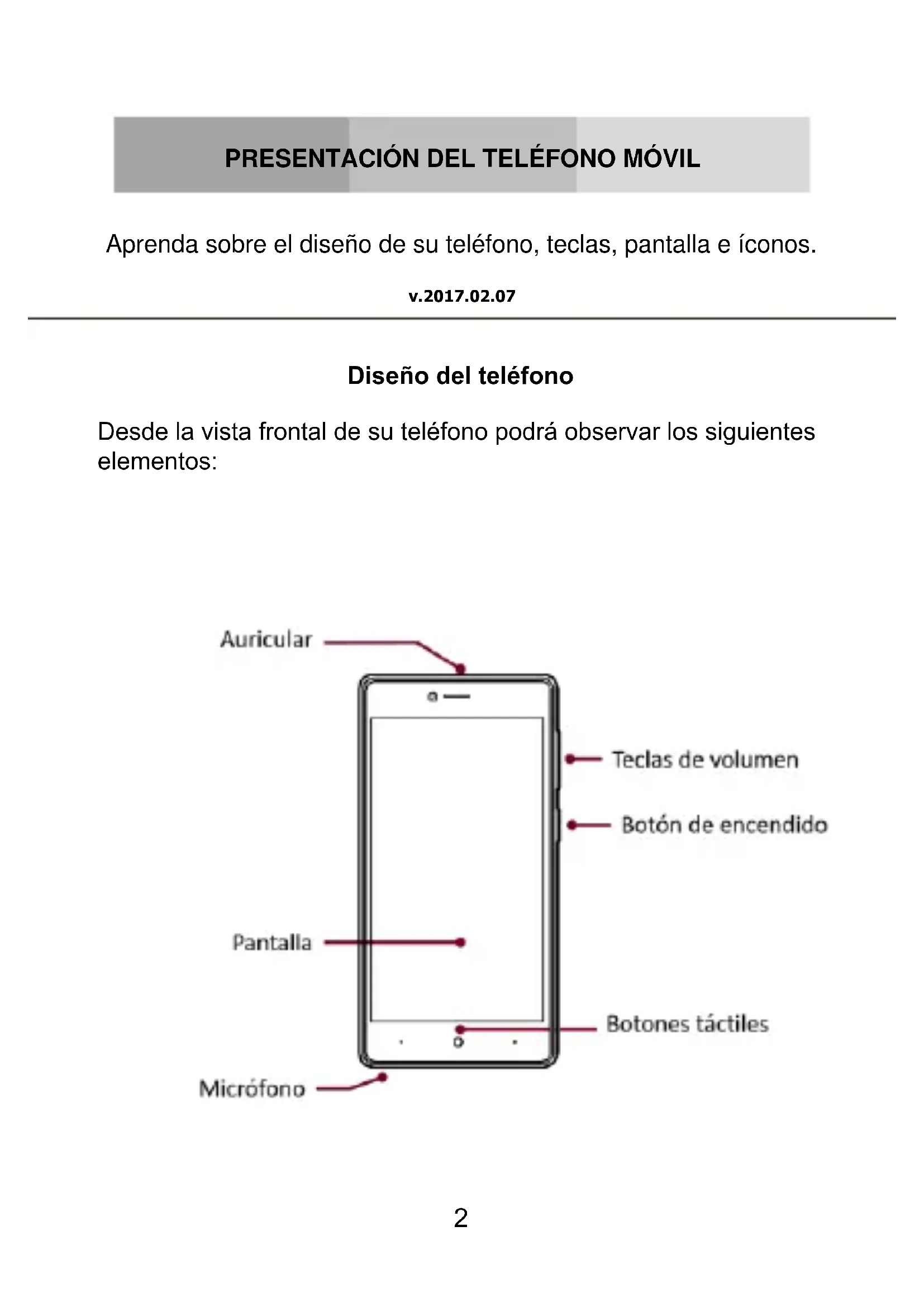 Aprenda sobre el diseño de su teléfono, teclas, pantalla e íconos. v.2017.02.07