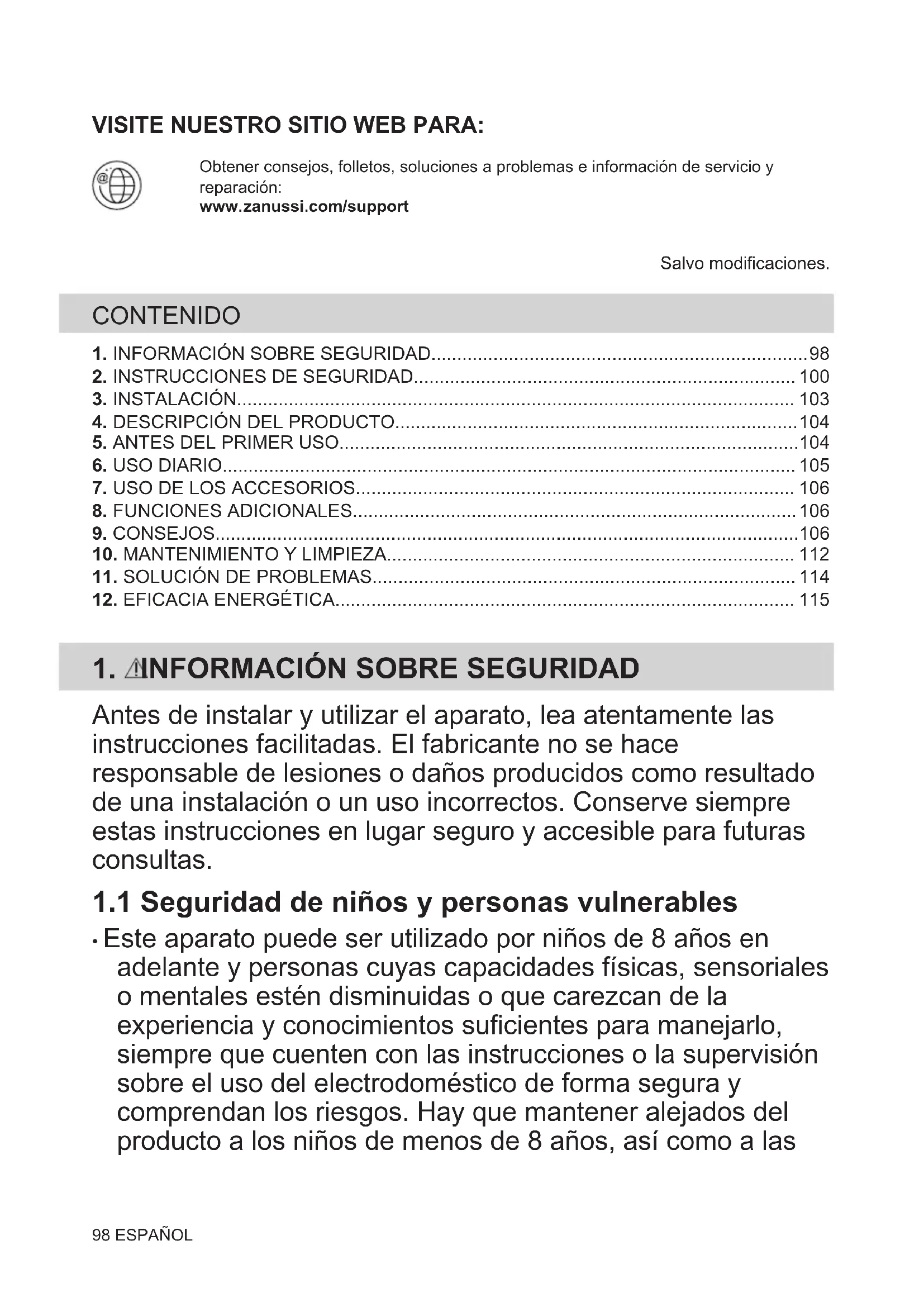- Este aparato puede ser utilizado por niños de 8 años en adelante y personas cuyas capacidades físicas, sensoriales o mentales estén disminuidas o que carezcan de la experiencia y conocimientos suficientes para manejarlo, siempre que cuenten con las instrucciones o la supervisión sobre el uso del electrodoméstico de forma segura y comprendan los riesgos. Hay que mantener alejados del producto a los niños de menos de 8 años, así como a las 98 ESPAÑOLpersonas con minusvalías importantes y complejas, salvo que estén bajo supervisión continua.