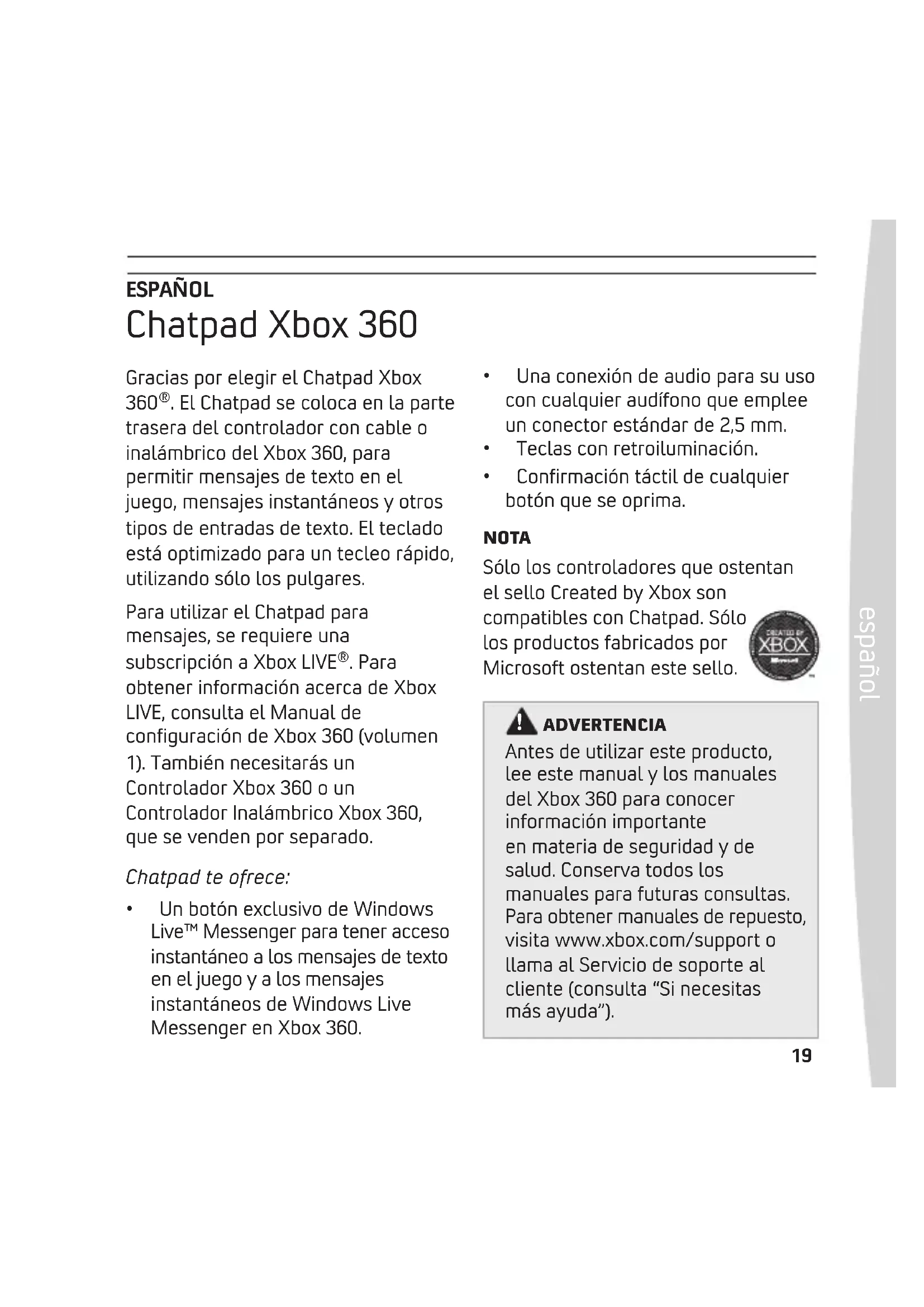 AdvERTENcIA Gracias por elegir el Chatpad Xbox