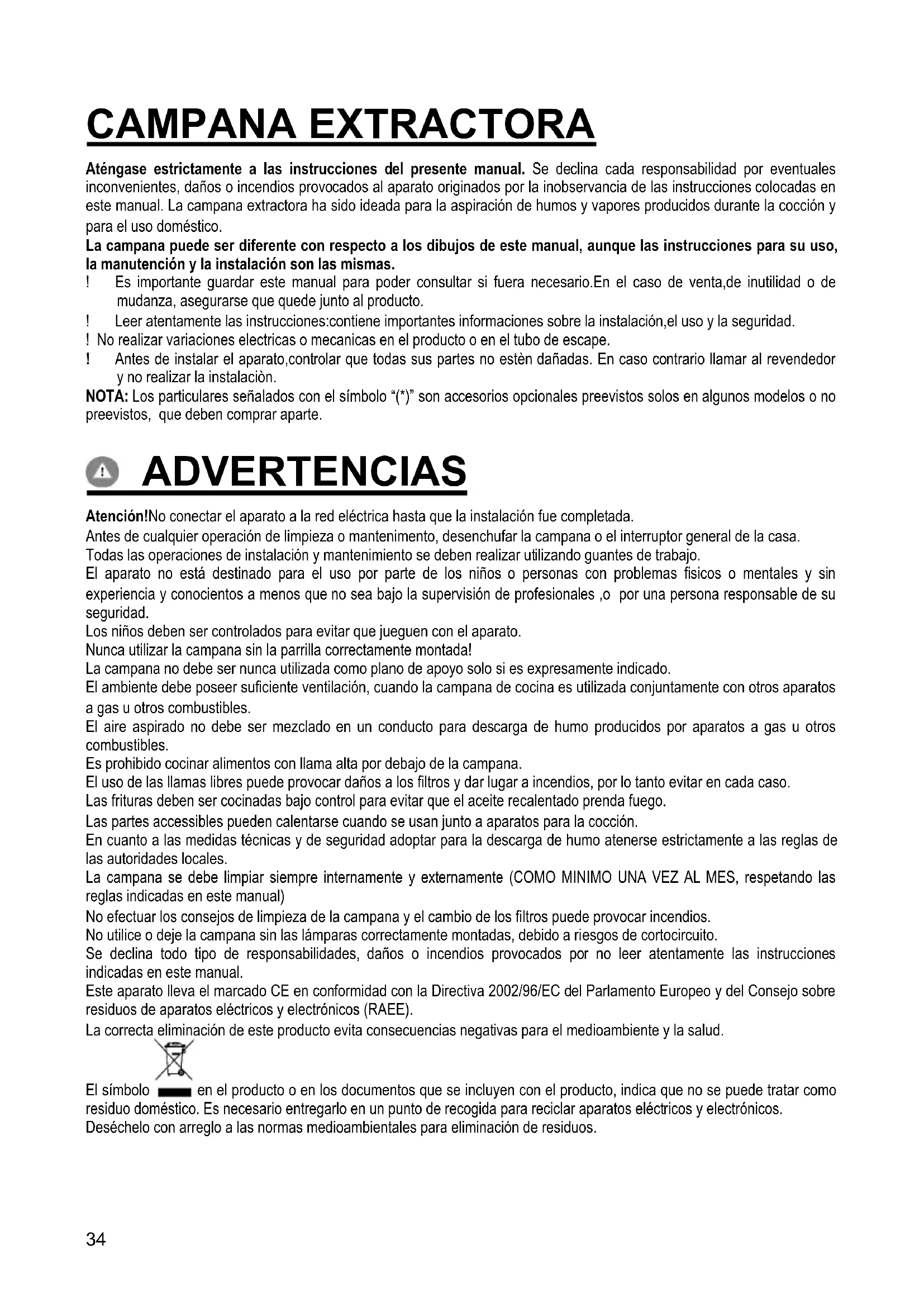 cause fire risks. Therefore, we recommend observing these instructions. The manufacturer declines all responsibility for any damage to the motor or any fire damage linked to inappropriate maintenance or failure to observe the above safety recommendations. Grease filter Fig. 24-29 Traps cooking grease particles. The grease filter must be cleaned once a month using non aggressive detergents, either by hand or in the dishwasher, which must be set to a low temperature and a short cycle. When washed in a dishwasher, the grease filter may discolour slightly, but this does not affect its filtering capacity. To remove the grease filter, pull the spring release handle. Charcoal filter (filter version only) Fig. 26 It absorbs unpleasant odours caused by cooking. The saturation of the charcoal filter occurs after more or less prolonged use, depending on the type of cooking and the regularity of cleaning of the grease filter. In any case it is necessary to replace the cartridge at least every four mounths. The charcoal filter may NOT be washed or regenerated. Replacing lamps The hood is equipped with a lighting system based on LED technology. The LEDs guarantee an optimum lighting, a duration up to 10 times as long as the traditional lamps and allow to save 90% electrical energy. For replacement, contact the technical service.34 CAMPANA EXTRACTORA Aténgase estrictamente a las instrucciones del presente manual. Se declina cada responsabilidad por eventuales inconvenientes, daños o incendios provocados al aparato originados por la inobservancia de las instrucciones colocadas en este manual. La campana extractora ha sido ideada para la aspiración de humos y vapores producidos durante la cocción y para el uso doméstico. La campana puede ser diferente con respecto a los dibujos de este manual, aunque las instrucciones para su uso, la manutención y la instalación son las mismas. ! Es importante guardar este manual para poder consultar si fuera necesario.En el caso de venta,de inutilidad o de mudanza, asegurarse que quede junto al producto. ! Leer atentamente las instrucciones:contiene importantes informaciones sobre la instalación,el uso y la seguridad. ! No realizar variaciones electricas o mecanicas en el producto o en el tubo de escape. ! Antes de instalar el aparato,controlar que todas sus partes no estèn dañadas. En caso contrario llamar al revendedor y no realizar la instalaciòn. NOTA: Los particulares señalados con el símbolo “(*)” son accesorios opcionales preevistos solos en algunos modelos o no preevistos, que deben comprar aparte. ADVERTENCIAS Atención!No conectar el aparato a la red eléctrica hasta que la instalación fue completada. Antes de cualquier operación de limpieza o mantenimento, desenchufar la campana o el interruptor general de la casa. Todas las operaciones de instalación y mantenimiento se deben realizar utilizando guantes de trabajo. El aparato no está destinado para el uso por parte de los niños o personas con problemas fisicos o mentales y sin experiencia y conocientos a menos que no sea bajo la supervisión de profesionales ,o por una persona responsable de su seguridad. Los niños deben ser controlados para evitar que jueguen con el aparato. Nunca utilizar la campana sin la parrilla correctamente montada! La campana no debe ser nunca utilizada como plano de apoyo solo si es expresamente indicado. El ambiente debe poseer suficiente ventilación, cuando la campana de cocina es utilizada conjuntamente con otros aparatos a gas u otros combustibles. El aire aspirado no debe ser mezclado en un conducto para descarga de humo producidos por aparatos a gas u otros combustibles. Es prohibido cocinar alimentos con llama alta por debajo de la campana. El uso de las llamas libres puede provocar daños a los filtros y dar lugar a incendios, por lo tanto evitar en cada caso. Las frituras deben ser cocinadas bajo control para evitar que el aceite recalentado prenda fuego. Las partes accessibles pueden calentarse cuando se usan junto a aparatos para la cocción. En cuanto a las medidas técnicas y de seguridad adoptar para la descarga de humo atenerse estrictamente a las reglas de las autoridades locales. La campana se debe limpiar siempre internamente y externamente (COMO MINIMO UNA VEZ AL MES, respetando las reglas indicadas en este manual) No efectuar los consejos de limpieza de la campana y el cambio de los filtros puede provocar incendios. No utilice o deje la campana sin las lámparas correctamente montadas, debido a riesgos de cortocircuito. Se declina todo tipo de responsabilidades, daños o incendios provocados por no leer atentamente las instrucciones indicadas en este manual. Este aparato lleva el marcado CE en conformidad con la Directiva 2002/96/EC del Parlamento Europeo y del Consejo sobre residuos de aparatos eléctricos y electrónicos (RAEE). La correcta eliminación de este producto evita consecuencias negativas para el medioambiente y la salud. El símbolo en el producto o en los documentos que se incluyen con el producto, indica que no se puede tratar como residuo doméstico. Es necesario entregarlo en un punto de recogida para reciclar aparatos eléctricos y electrónicos. Deséchelo con arreglo a las normas medioambientales para eliminación de residuos.35 Para obtener información más detallada sobre el tratamiento, recuperación y reciclaje de este producto, póngase en contacto con el ayuntamiento, con el servicio de eliminación de residuos urbanos o la tienda donde adquirió el producto. Aparato diseñado, probado y fabricado de acuerdo con:
