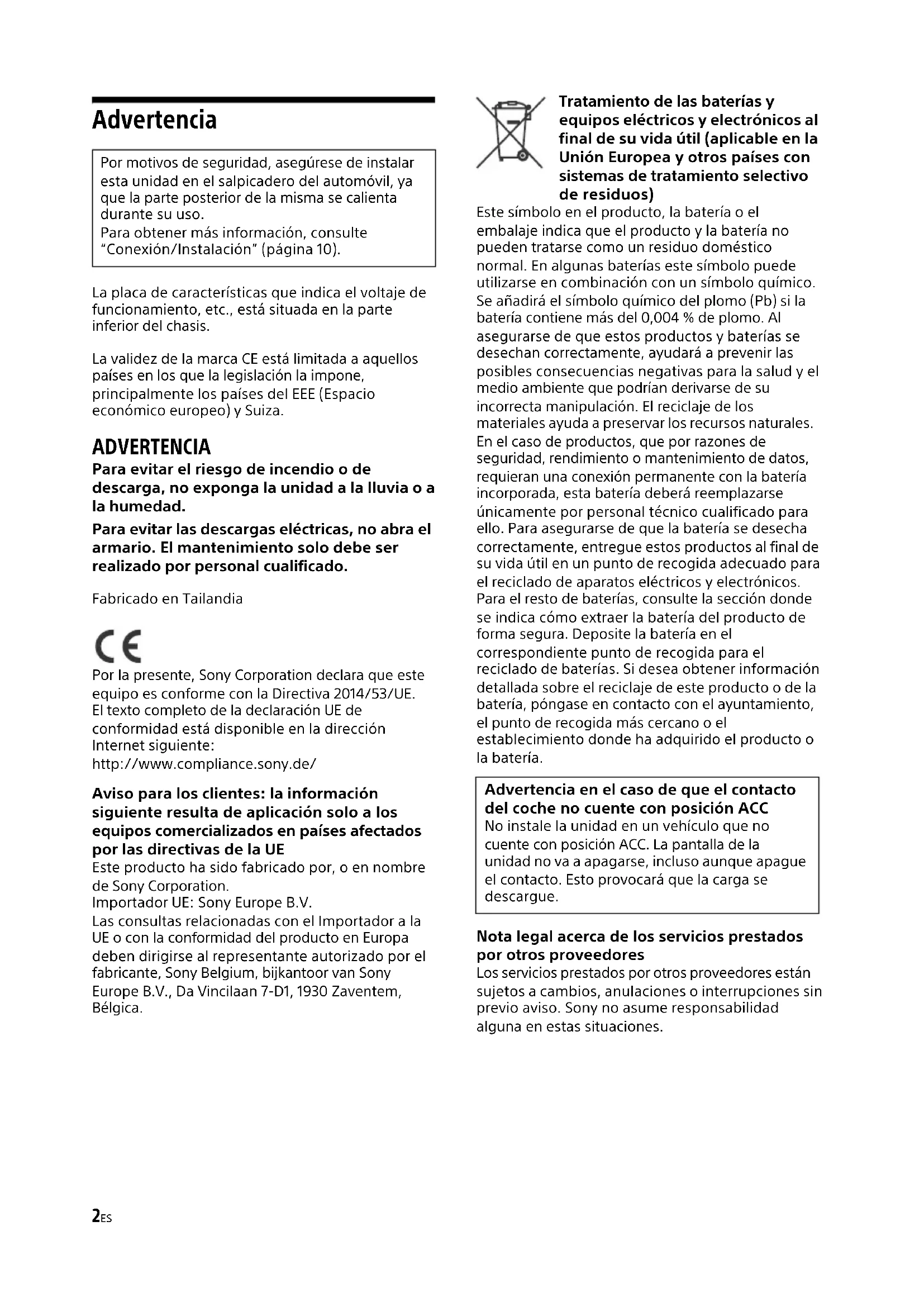 Halterung Halterung Sicherung (10 A)2ES Advertencia La placa de características que indica el voltaje de funcionamiento, etc., está situada en la parte inferior del chasis. La validez de la marca CE está limitada a aquellos países en los que la legislación la impone, principalmente los países del EEE (Espacio económico europeo) y Suiza. ADVERTENCIA Para evitar el riesgo de incendio o de descarga, no exponga la unidad a la lluvia o a la humedad. Para evitar las descargas eléctricas, no abra el armario. El mantenimiento solo debe ser realizado por personal cualificado. Fabricado en Tailandia Por la presente, Sony Corporation declara que este equipo es conforme con la Directiva 2014/53/UE. El texto completo de la declaración UE de conformidad está disponible en la dirección Internet siguiente: http://www.compliance.sony.de/ Aviso para los clientes: la información siguiente resulta de aplicación solo a los equipos comercializados en países afectados por las directivas de la UE Este producto ha sido fabricado por, o en nombre de Sony Corporation. Importador UE: Sony Europe B.V. Las consultas relacionadas con el Importador a la UE o con la conformidad del producto en Europa deben dirigirse al representante autorizado por el fabricante, Sony Belgium, bijkantoor van Sony Europe B.V., Da Vincilaan 7-D1, 1930 Zaventem, Bélgica. Tratamiento de las baterías y equipos eléctricos y electrónicos al final de su vida útil (aplicable en la Unión Europea y otros países con sistemas de tratamiento selectivo de residuos) Este símbolo en el producto, la batería o el embalaje indica que el producto y la batería no pueden tratarse como un residuo doméstico normal. En algunas baterías este símbolo puede utilizarse en combinación con un símbolo químico. Se añadirá el símbolo químico del plomo (Pb) si la batería contiene más del 0,004 % de plomo. Al asegurarse de que estos productos y baterías se desechan correctamente, ayudará a prevenir las posibles consecuencias negativas para la salud y el medio ambiente que podrían derivarse de su incorrecta manipulación. El reciclaje de los materiales ayuda a preservar los recursos naturales. En el caso de productos, que por razones de seguridad, rendimiento o mantenimiento de datos, requieran una conexión permanente con la batería incorporada, esta batería deberá reemplazarse únicamente por personal técnico cualificado para ello. Para asegurarse de que la batería se desecha correctamente, entregue estos productos al final de su vida útil en un punto de recogida adecuado para el reciclado de aparatos eléctricos y electrónicos. Para el resto de baterías, consulte la sección donde se indica cómo extraer la batería del producto de forma segura. Deposite la batería en el correspondiente punto de recogida para el reciclado de baterías. Si desea obtener información detallada sobre el reciclaje de este producto o de la batería, póngase en contacto con el ayuntamiento, el punto de recogida más cercano o el establecimiento donde ha adquirido el producto o la batería. Nota legal acerca de los servicios prestados por otros proveedores Los servicios prestados por otros proveedores están sujetos a cambios, anulaciones o interrupciones sin previo aviso. Sony no asume responsabilidad alguna en estas situaciones. Por motivos de seguridad, asegúrese de instalar esta unidad en el salpicadero del automóvil, ya que la parte posterior de la misma se calienta durante su uso. Para obtener más información, consulte “Conexión/Instalación” (página 10). Advertencia en el caso de que el contacto del coche no cuente con posición ACC No instale la unidad en un vehículo que no cuente con posición ACC. La pantalla de la unidad no va a apagarse, incluso aunque apague el contacto. Esto provocará que la carga se descargue.3ES Precaución SONY NO SE HACE RESPONSABLE EN NINGÚN CASO DE DAÑOS ACCIDENTALES, INDIRECTOS, COLATERALES O DE OTRO TIPO, LO QUE INCLUYE, A TÍTULO MERAMENTE ENUNCIATIVO, LA PÉRDIDA DE BENEFICIOS, LA PÉRDIDA DE INGRESOS, LA PÉRDIDA DE DATOS, LA IMPOSIBILIDAD DE UTILIZAR EL PRODUCTO O EQUIPOS ASOCIADOS, EL TIEMPO DE INACTIVIDAD O EL TIEMPO DEL COMPRADOR EN RELACIÓN CON LA UTILIZACIÓN DE ESTE PRODUCTO, SU HARDWARE Y/O SU SOFTWARE. Tenga en cuenta que este producto incluye un transmisor de radio. Según la norma 10 de UNECE, un fabricante de un vehículo puede imponer condiciones específicas para la instalación de transmisores de radio en los vehículos. Consulte el manual de instrucciones de su vehículo o póngase en contacto con el concesionario de su vehículo antes de instalar este producto en su vehículo. Llamadas de emergencia Este sistema manos libres para vehículo BLUETOOTH y el dispositivo electrónico conectado al mismo funcionan mediante señales de radio, redes de telefonía móvil y redes terrestres, así como a través de funciones programadas por el usuario, por lo que la conexión no está garantizada en todas las condiciones. Por tanto, no confíe exclusivamente en un solo dispositivo electrónico para las comunicaciones importantes (como las emergencias médicas). Acerca de la comunicación BLUETOOTH