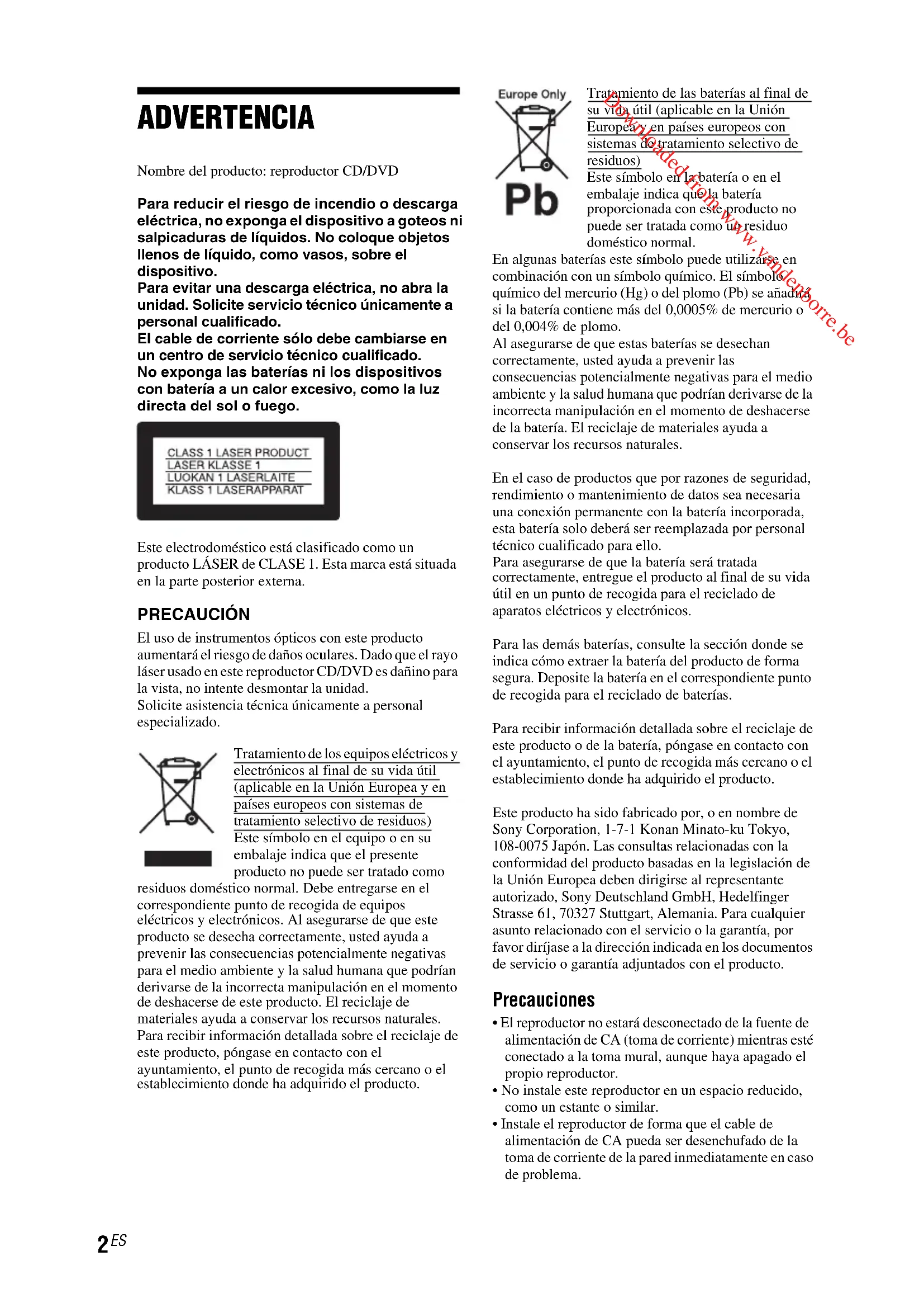ADVERTENCIA Nombre del producto: reproductor CD/DVDPara reducir el riesgo de incendio o descarga eléctrica, no exponga el dispositivo a goteos ni salpicaduras de líquidos. No coloque objetos llenos de líquido, como vasos, sobre el dispositivo.Para evitar una descarga eléctrica, no abra la unidad. Solicite servicio técnico únicamente a personal cualificado.El cable de corriente sólo debe cambiarse en un centro de servicio técnico cualificado.No exponga las baterías ni los dispositivos con batería a un calor excesivo, como la luz directa del sol o fuego.Este electrodoméstico está clasificado como un producto LÁSER de CLASE 1. Esta marca está situada en la parte posterior externa. PRECAUCIÓN El uso de instrumentos ópticos con este producto aumentará el riesgo de daños oculares. Dado que el rayo láser usado en este reproductor CD/DVD es dañino para la vista, no intente desmontar la unidad.Solicite asistencia técnica únicamente a personal especializado.Tratamiento de los equipos eléctricos y electrónicos al final de su vida útil (aplicable en la Unión Europea y en países europeos con sistemas de tratamiento selectivo de residuos)Este símbolo en el equipo o en su embalaje indica que el presente producto no puede ser tratado como residuos doméstico normal. Debe entregarse en el correspondiente punto de recogida de equipos eléctricos y electrónicos. Al asegurarse de que este producto se desecha correctamente, usted ayuda a prevenir las consecuencias potencialmente negativas para el medio ambiente y la salud humana que podrían derivarse de la incorrecta manipulación en el momento de deshacerse de este producto. El reciclaje de materiales ayuda a conservar los recursos naturales. Para recibir información detallada sobre el reciclaje de este producto, póngase en contacto con el ayuntamiento, el punto de recogida más cercano o el establecimiento donde ha adquirido el producto.Tratamiento de las baterías al final de su vida útil (aplicable en la Unión Europea y en países europeos con sistemas de tratamiento selectivo de residuos)Este símbolo en la batería o en el embalaje indica que la batería proporcionada con este producto no puede ser tratada como un residuo doméstico normal.En algunas baterías este símbolo puede utilizarse en combinación con un símbolo químico. El símbolo químico del mercurio (Hg) o del plomo (Pb) se añadirá si la batería contiene más del 0,0005% de mercurio o del 0,004% de plomo.Al asegurarse de que estas baterías se desechan correctamente, usted ayuda a prevenir las consecuencias potencialmente negativas para el medio ambiente y la salud humana que podrían derivarse de la incorrecta manipulación en el momento de deshacerse de la batería. El reciclaje de materiales ayuda a conservar los recursos naturales.En el caso de productos que por razones de seguridad, rendimiento o mantenimiento de datos sea necesaria una conexión permanente con la batería incorporada, esta batería solo deberá ser reemplazada por personal técnico cualificado para ello.Para asegurarse de que la batería será tratada correctamente, entregue el producto al final de su vida útil en un punto de recogida para el reciclado de aparatos eléctricos y electrónicos.Para las demás baterías, consulte la sección donde se indica cómo extraer la batería del producto de forma segura. Deposite la batería en el correspondiente punto de recogida para el reciclado de baterías.Para recibir información detallada sobre el reciclaje de este producto o de la batería, póngase en contacto con el ayuntamiento, el punto de recogida más cercano o el establecimiento donde ha adquirido el producto.Este producto ha sido fabricado por, o en nombre de Sony Corporation, 1-7-1 Konan Minato-ku Tokyo, 108-0075 Japón. Las consultas relacionadas con la conformidad del producto basadas en la legislación de la Unión Europea deben dirigirse al representante autorizado, Sony Deutschland GmbH, Hedelfinger Strasse 61, 70327 Stuttgart, Alemania. Para cualquier asunto relacionado con el servicio o la garantía, por favor diríjase a la dirección indicada en los documentos de servicio o garantía adjuntados con el producto. Precauciones