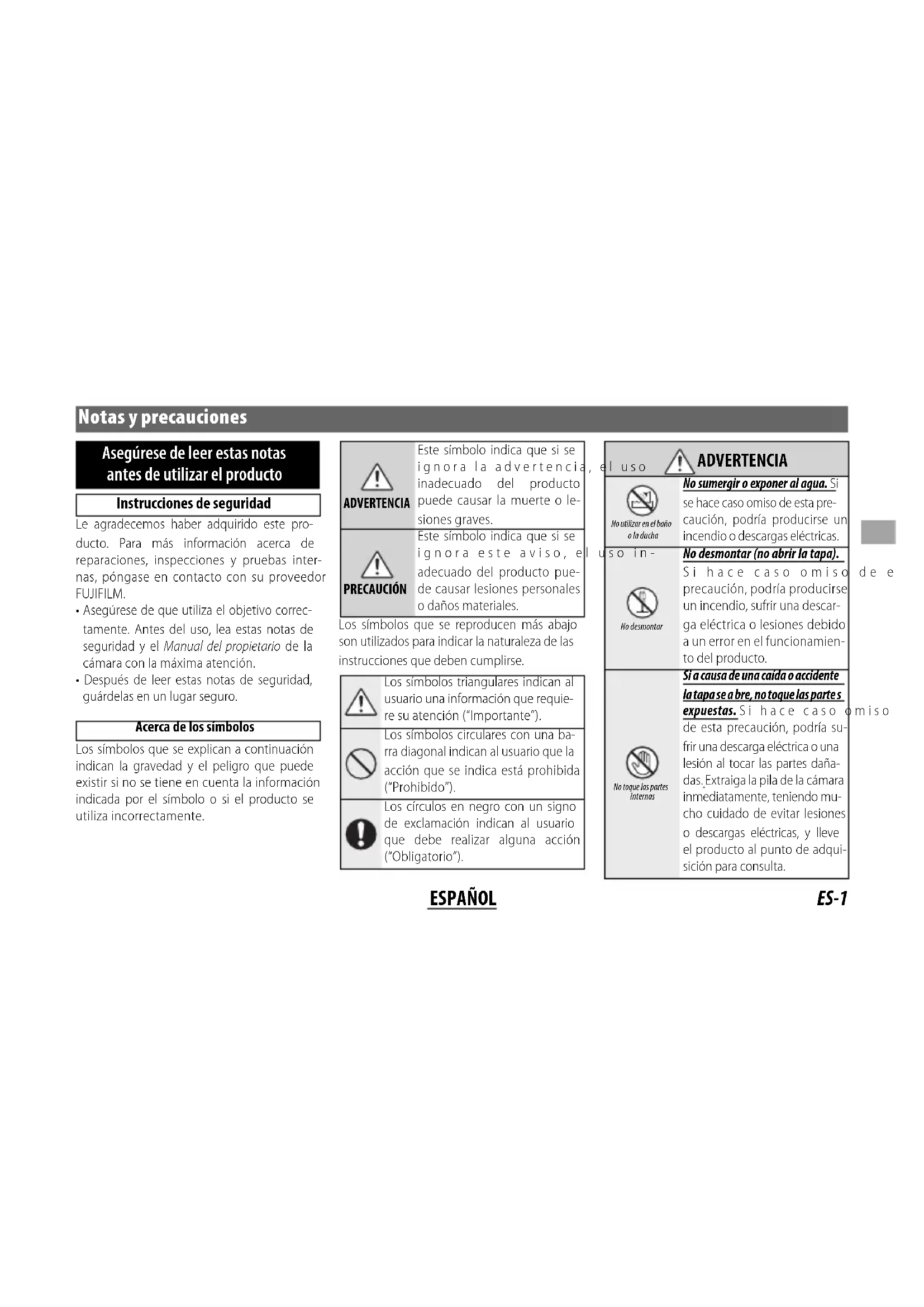 ADVERTENCIA ADVERTENCIA No utilizar en el baño o la ducha No sumergir o exponer al agua. Si se hace caso omiso de esta pre- caución, podría producirse un incendio o descargas eléctricas. No desmontar No desmontar (no abrir la tapa). Si hace caso omiso de esta precaución, podría producirse un incendio, sufrir una descar- ga eléctrica o lesiones debido a un error en el funcionamien- to del producto. No toque las partes internas Si a causa de una caída o accidente la tapa se a bre, no toque las parte s expuestas. Si hace caso omiso de esta precaución, podría su- frir una descarga eléctrica o una lesión al tocar las partes daña- das. Extraiga la pila de la cámara inmediatamente, teniendo mu- cho cuidado de evitar lesiones o descargas eléctricas, y lleve el producto al punto de adqui- sición para consulta.ES-2 ESPAÑOL