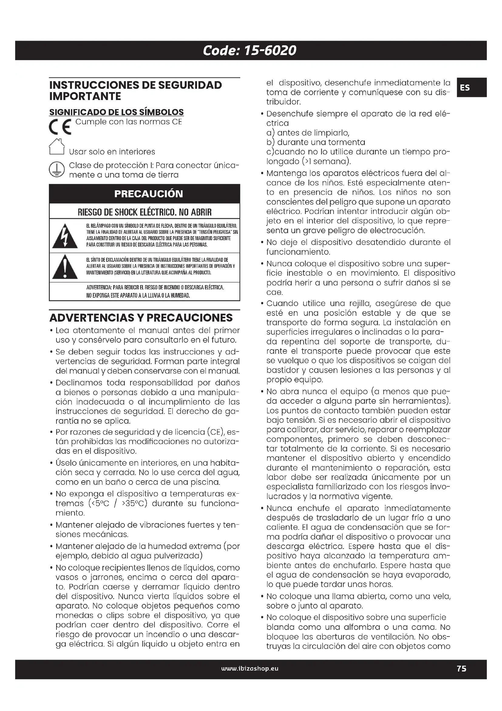 tiempo, se recomienda cargarlo una vez al mes. La duración de la batería depende del cumpli- miento de estas recomendaciones. LAS BATERÍAS NO ESTÁN CUBIERTAS POR LA GARANTÍA RENUNCIAMOS A TODA RESPONSABILIDAD POR DAÑOS CAUSADOS POR EL INCUMPLIMIENTO DE ESTAS INS- TRUCCIONES.Code: 15-6020