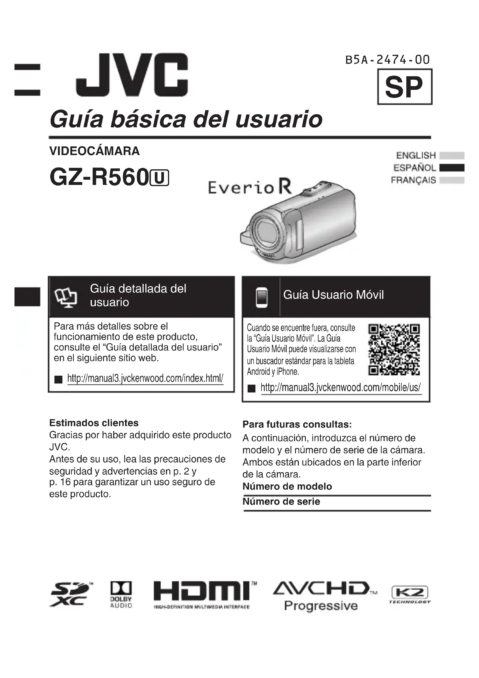 http://manual3.jvckenwood.com/mobile/us/ Estimados clientesGracias por haber adquirido este producto JVC. Antes de su uso, lea las precauciones deseguridad y advertencias en p. 2 yp. 16 para garantizar un uso seguro deeste producto.Para futuras consultas:A continuación, introduzca el número demodelo y el número de serie de la cámara.Ambos están ubicados en la parte inferiorde la cámara.Número de modeloNúmero de seriePrecauciones de seguridad