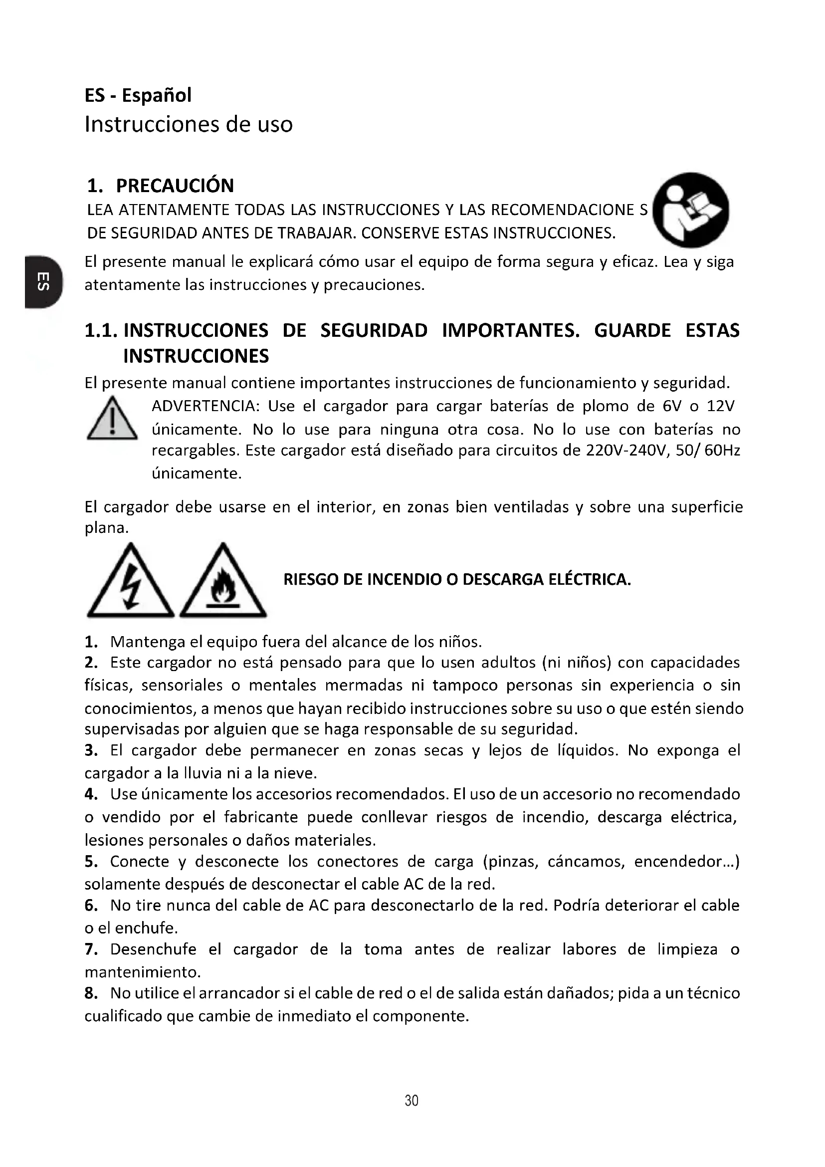 INSTRUCCIONES El presente manual contiene importantes instrucciones de funcionamiento y seguridad. ADVERTENCIA: Use el cargador para cargar baterías de plomo de 6V o 12V únicamente. No lo use para ninguna otra cosa. No lo use con baterías no recargables. Este cargador está diseñado para circuitos de 220V-240V, 50/ 60Hz únicamente.