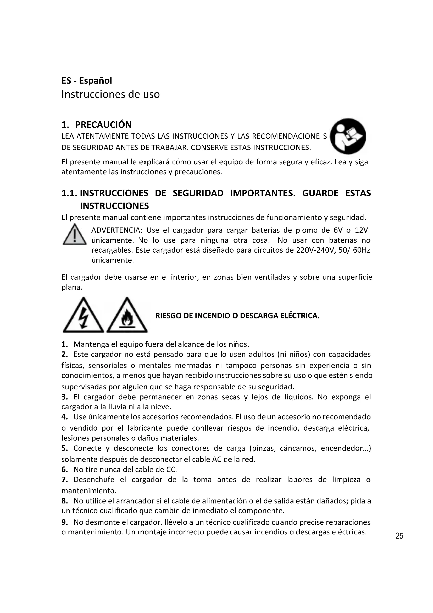 INSTRUCCIONES El presente manual contiene importantes instrucciones de funcionamiento y seguridad. ADVERTENCIA: Use el cargador para cargar baterías de plomo de 6V o 12V únicamente. No lo use para ninguna otra cosa. No usar con baterías no recargables. Este cargador está diseñado para circuitos de 220V-240V, 50/ 60Hz únicamente.