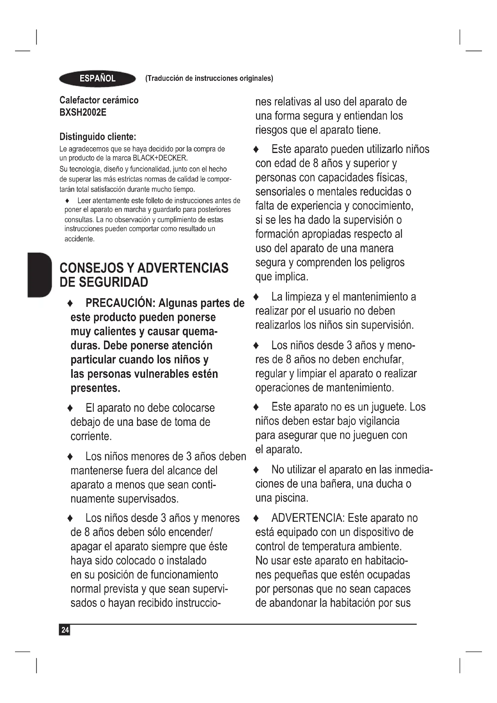 Calefactor cerámico BXSH2002E Distinguido cliente: Le agradecemos que se haya decidido por la compra de un producto de la marca BLACK+DECKER. Su tecnología, diseño y funcionalidad, junto con el hecho de superar las más estrictas normas de calidad le compor- tarán total satisfacción durante mucho tiempo. ♦ Leer atentamente este folleto de instrucciones antes de poner el aparato en marcha y guardarlo para posteriores consultas. La no observación y cumplimiento de estas instrucciones pueden comportar como resultado un accidente.
