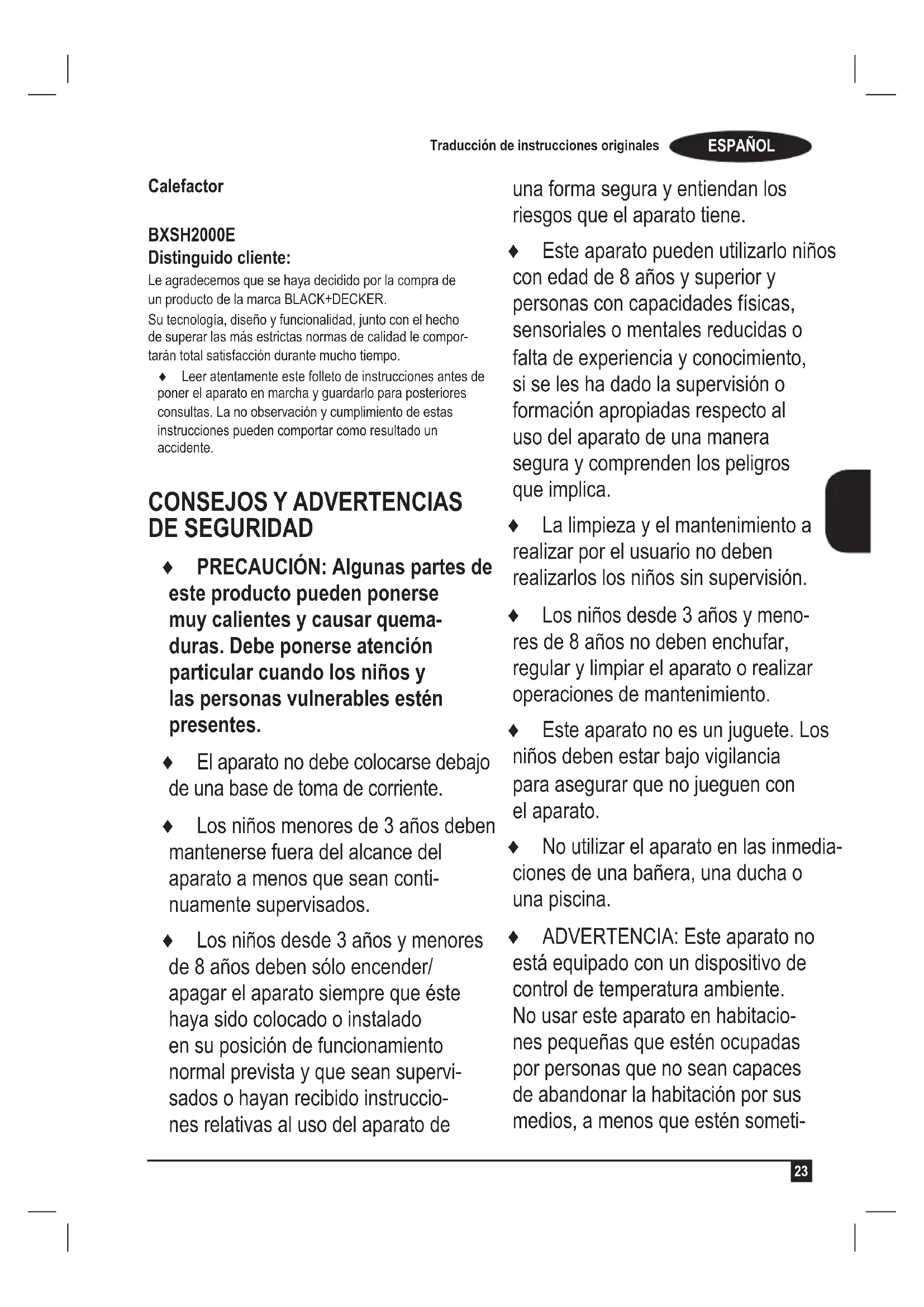 Calefactor BXSH2000E Distinguido cliente: Le agradecemos que se haya decidido por la compra de un producto de la marca BLACK+DECKER. Su tecnología, diseño y funcionalidad, junto con el hecho de superar las más estrictas normas de calidad le compor- tarán total satisfacción durante mucho tiempo. ♦ Leer atentamente este folleto de instrucciones antes de poner el aparato en marcha y guardarlo para posteriores consultas. La no observación y cumplimiento de estas instrucciones pueden comportar como resultado un accidente.